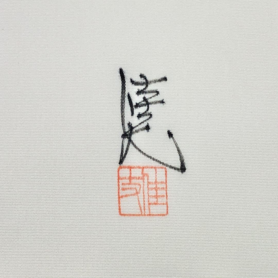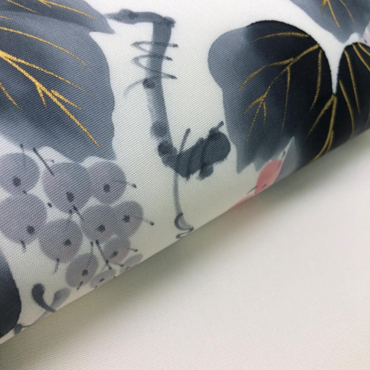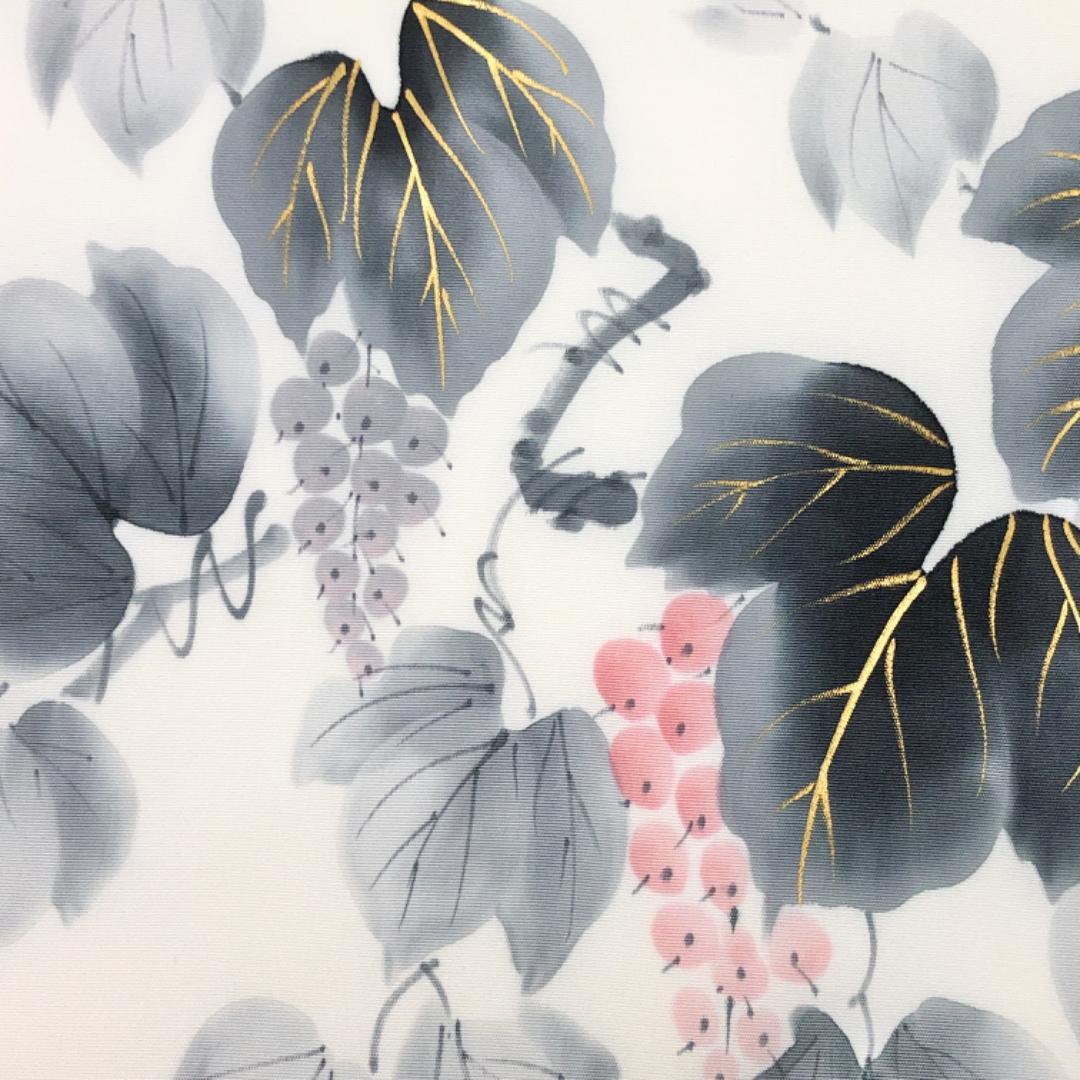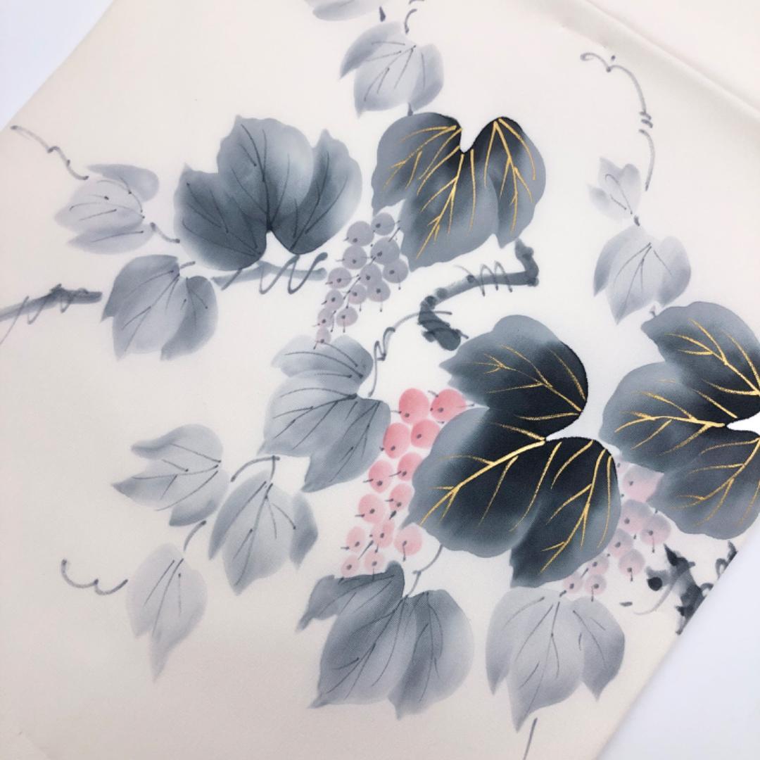 乳白色の上品なお色味の塩瀬に手描きで葡萄の柄裄がデザインされた雰囲気の良い素敵なお品でございます。