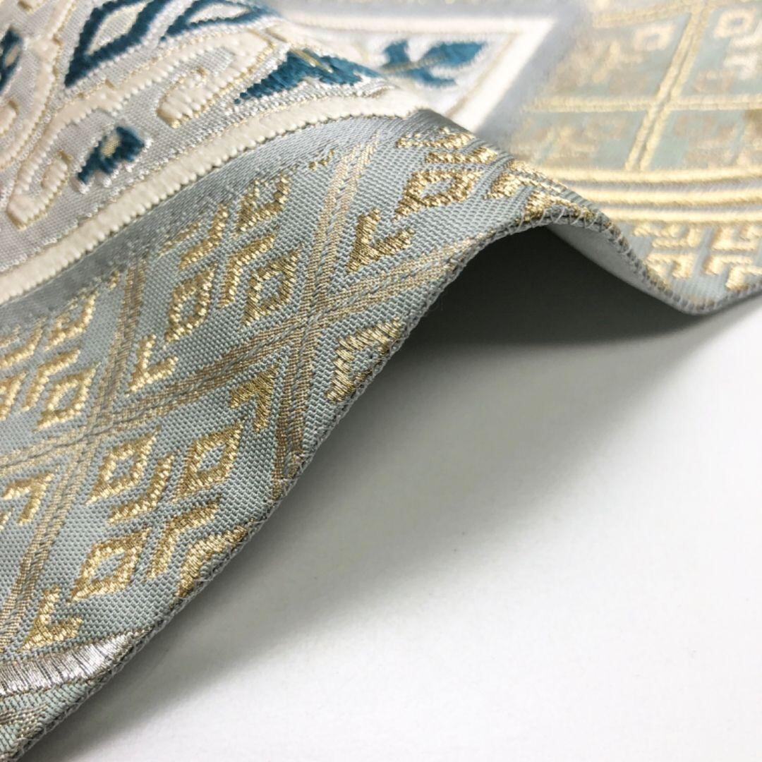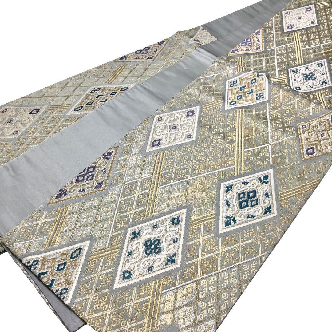 袋帯 華柄の煌びやかな飾り 縦柄菱模様 薄深川鼠色 ガード加工 O-5420 着物 きもの kimono 和服 和装 中古 リサイクル着物 【送料無料】