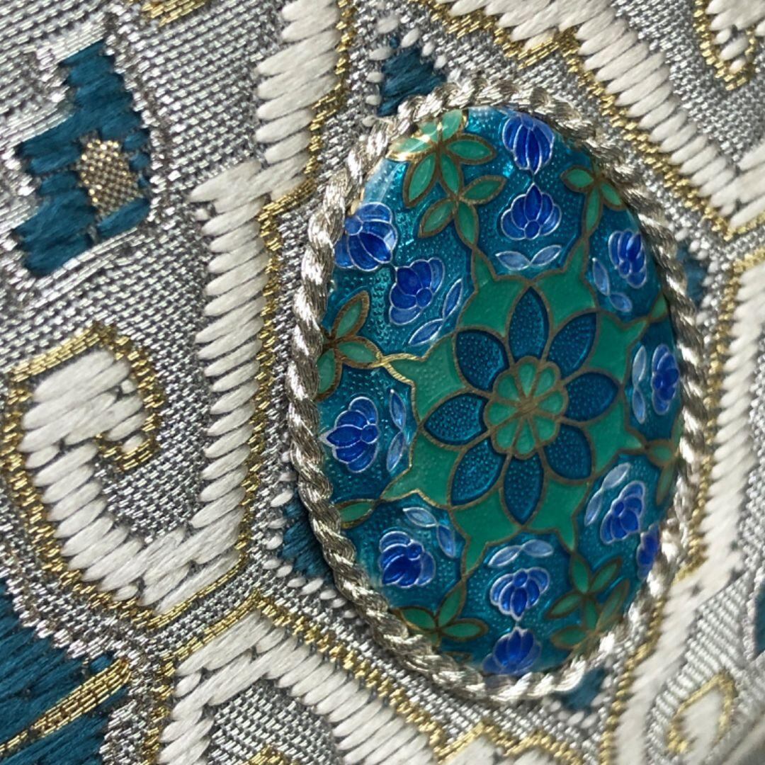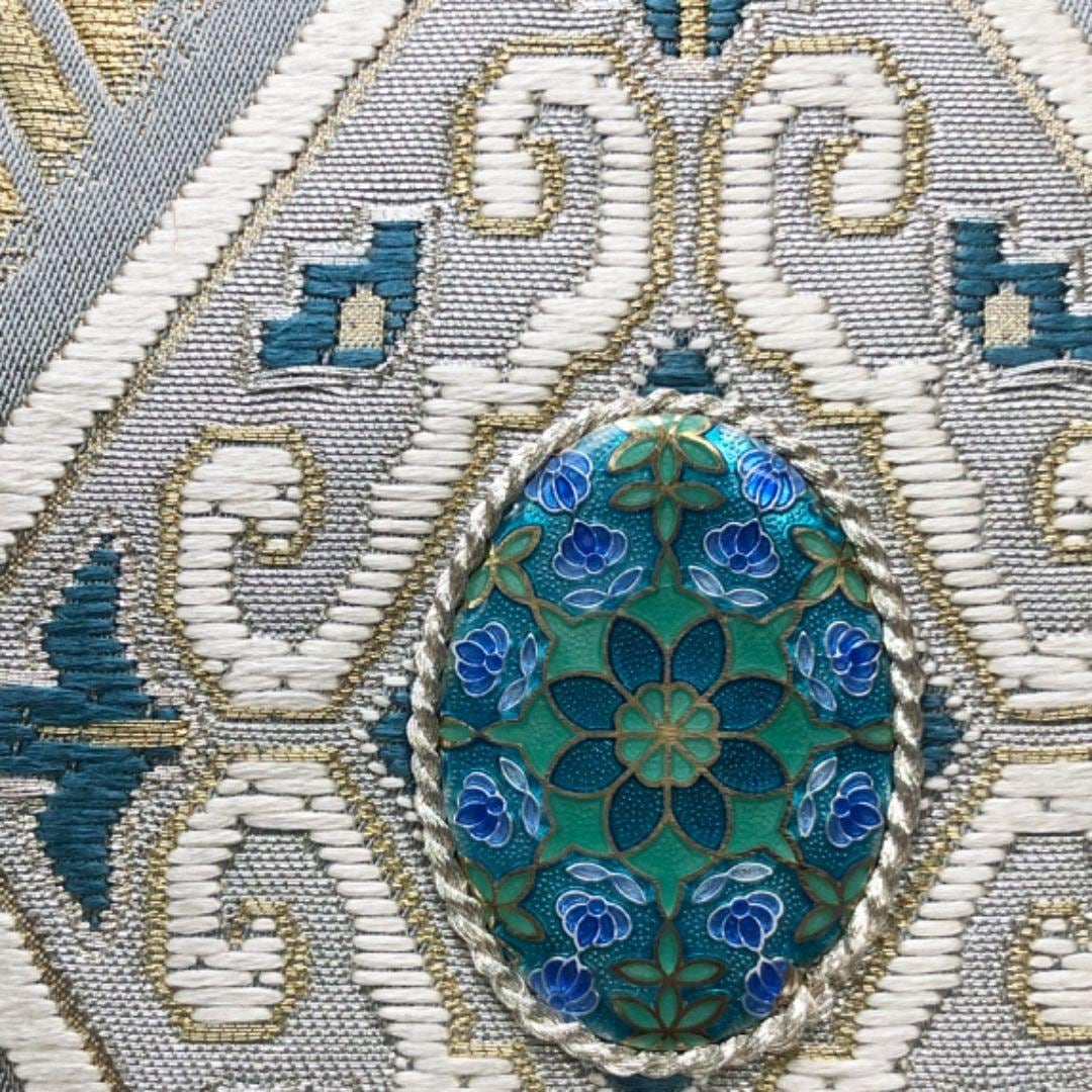 薄深川鼠色ベースのお色味に金銀糸が使われた縦柄の菱模様、太鼓部分に立体的な美しい華柄の煌びやかな飾りがデザインされた素敵なお品でございます。