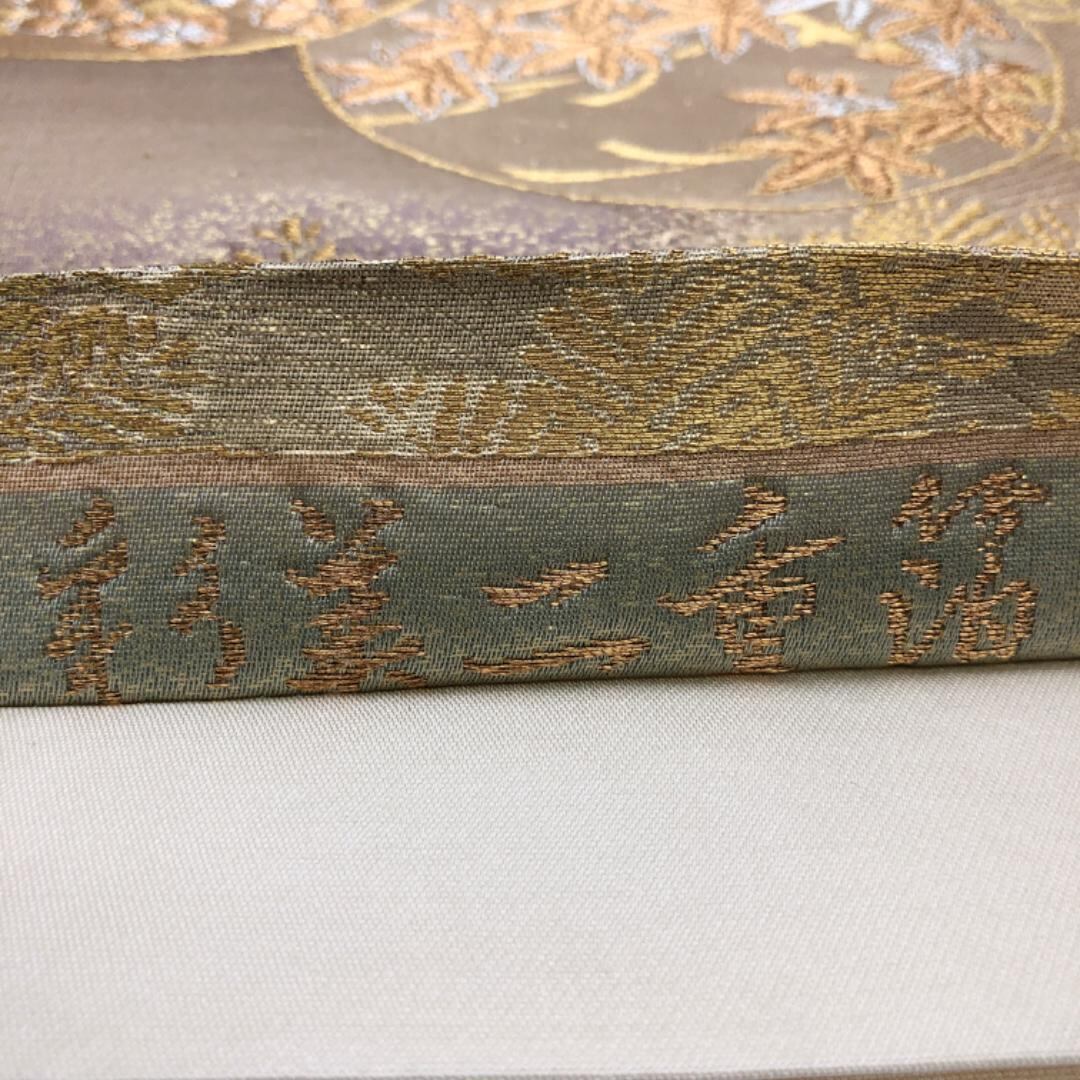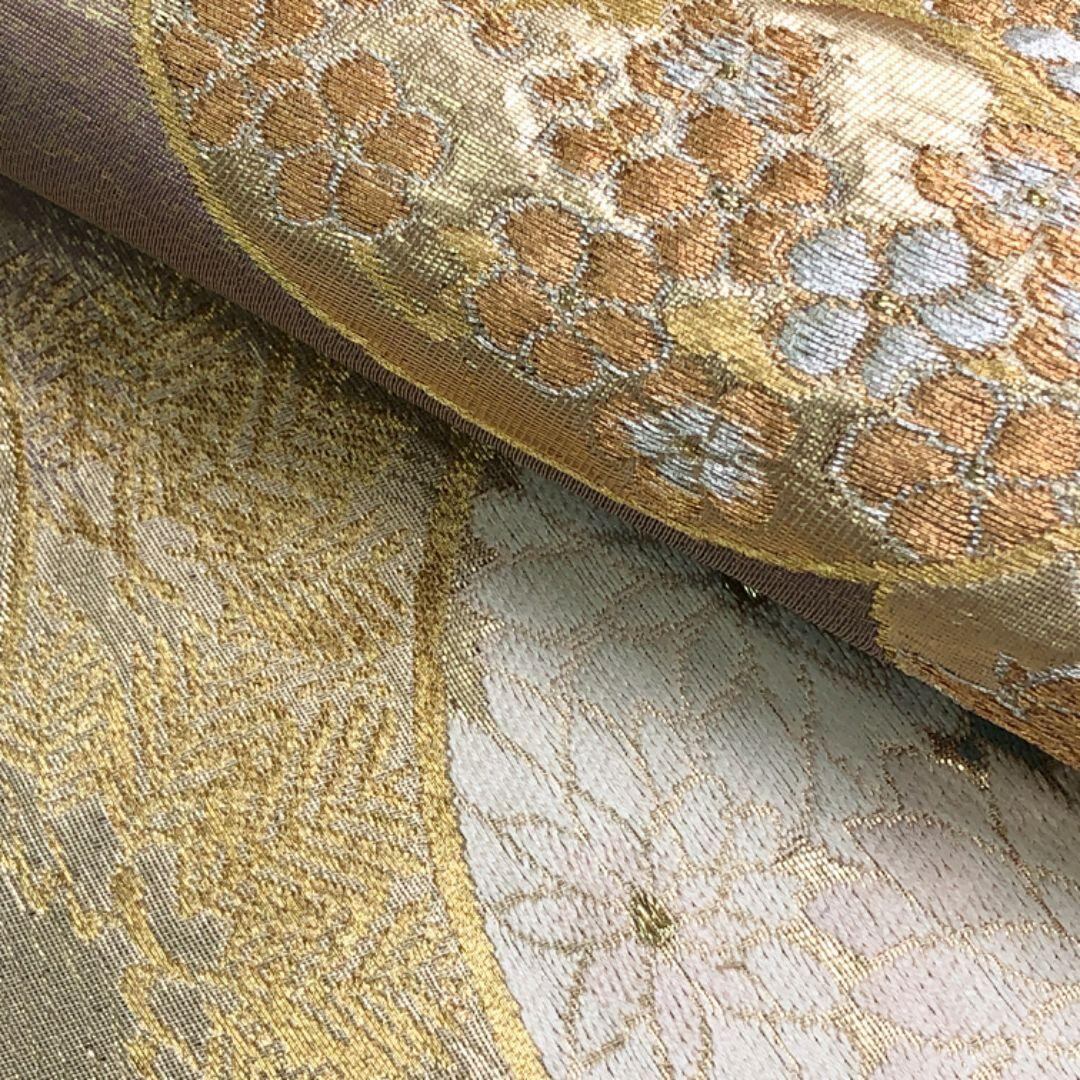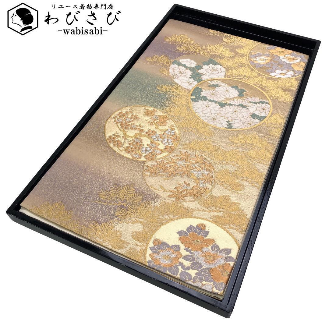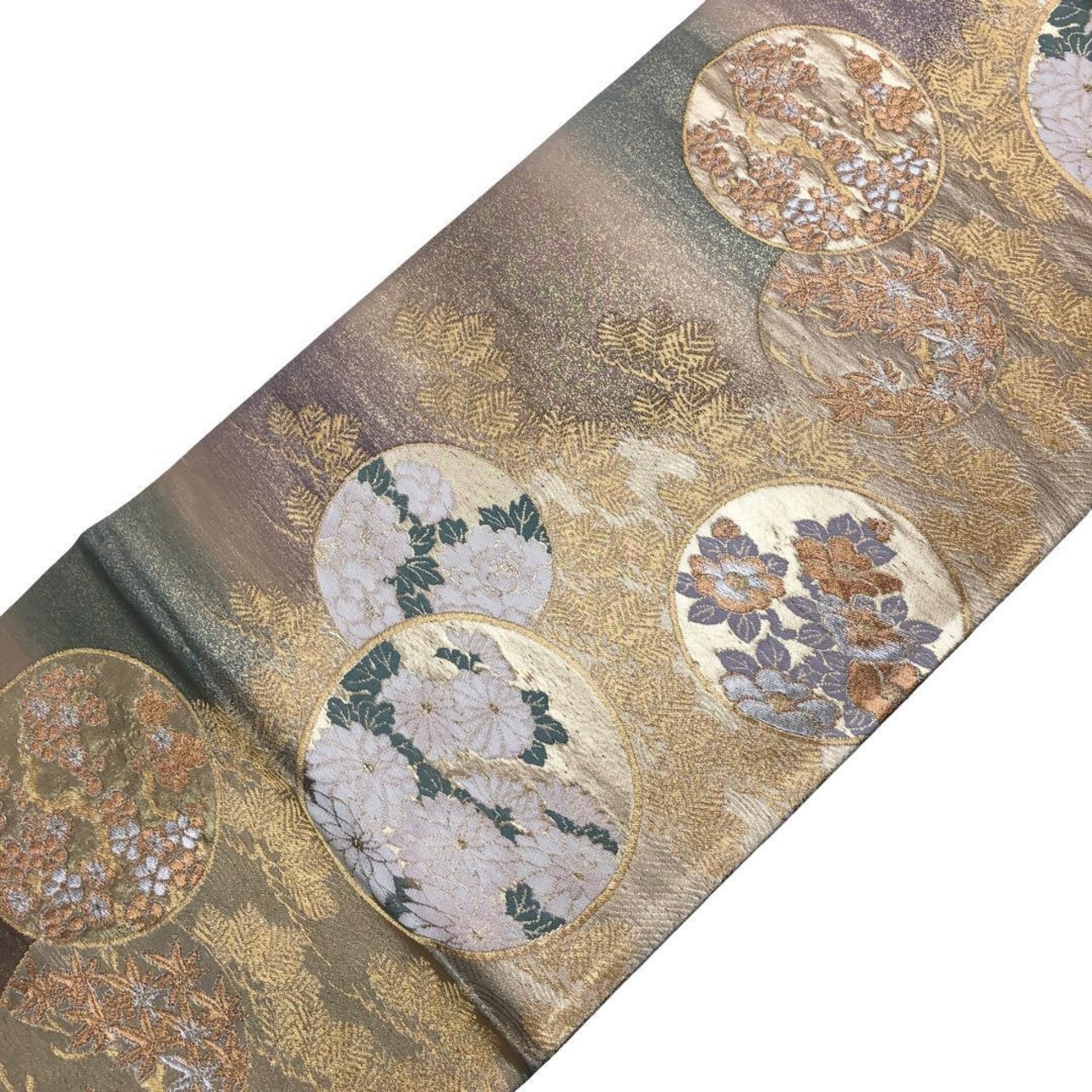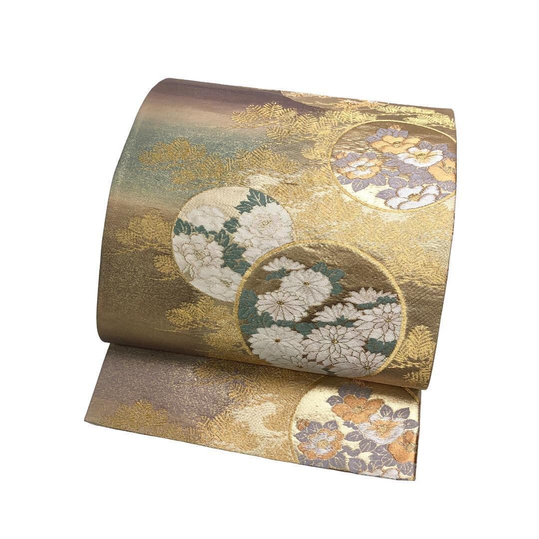 金色ベースの煌びやかなお色味、丸に花模様などの柄行がデザインされた素敵なお品でございます。