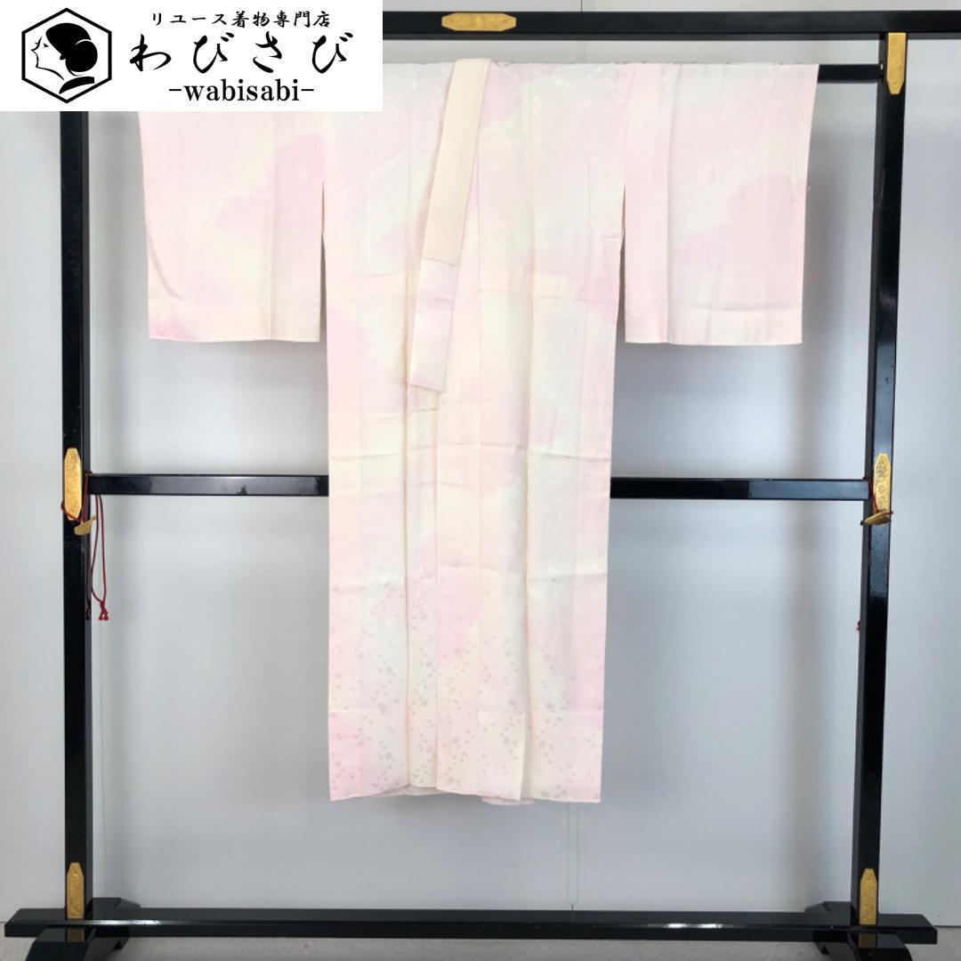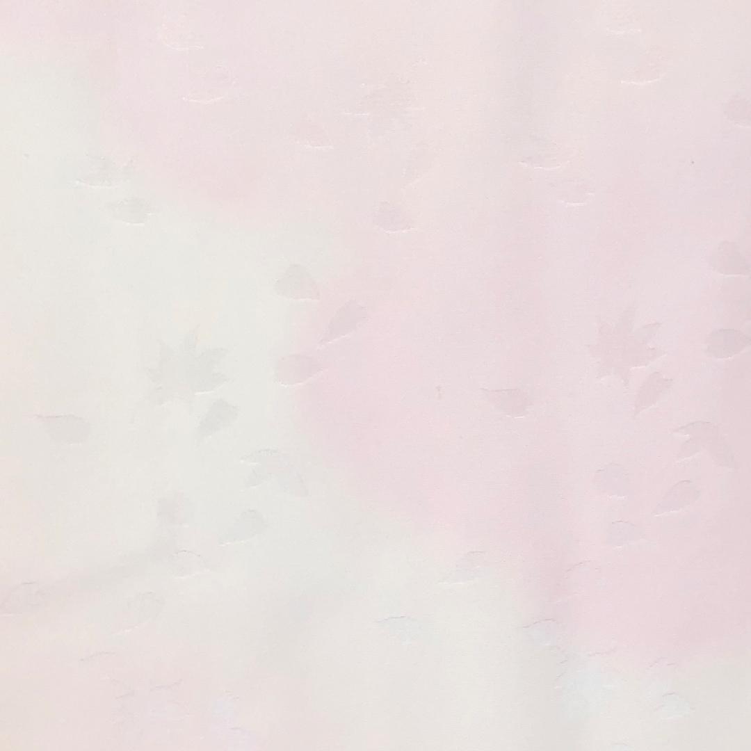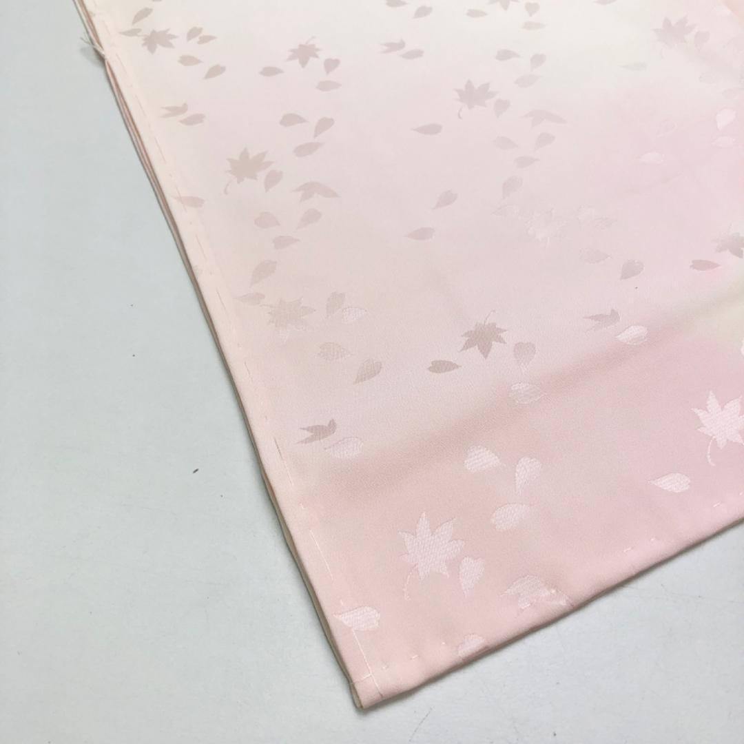 薄今様色のお色味に桜、紅葉の柄裄がデザインされた素敵なお品でございます。