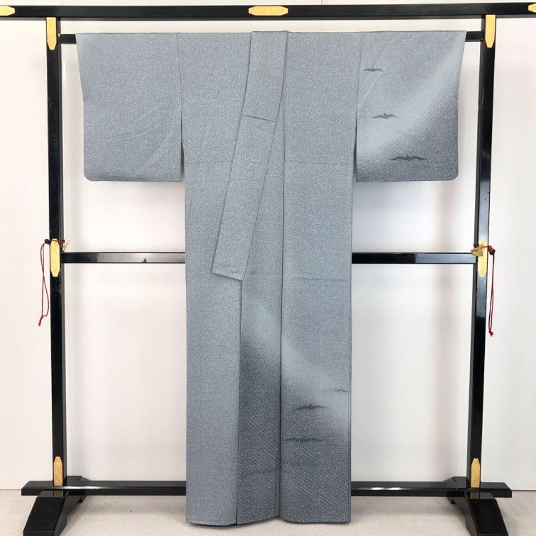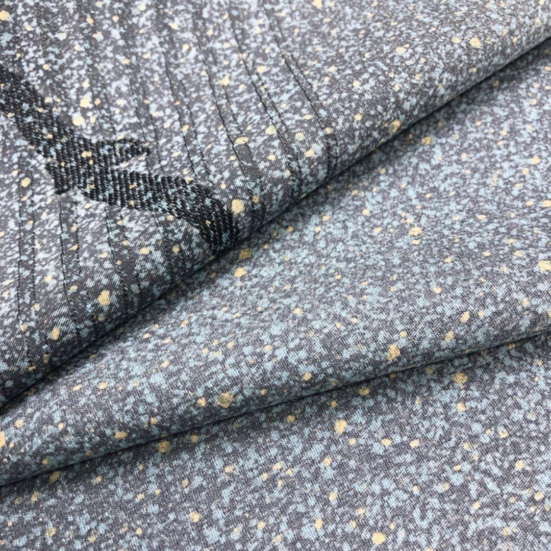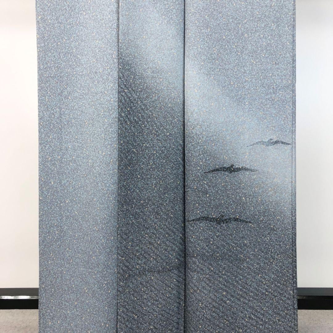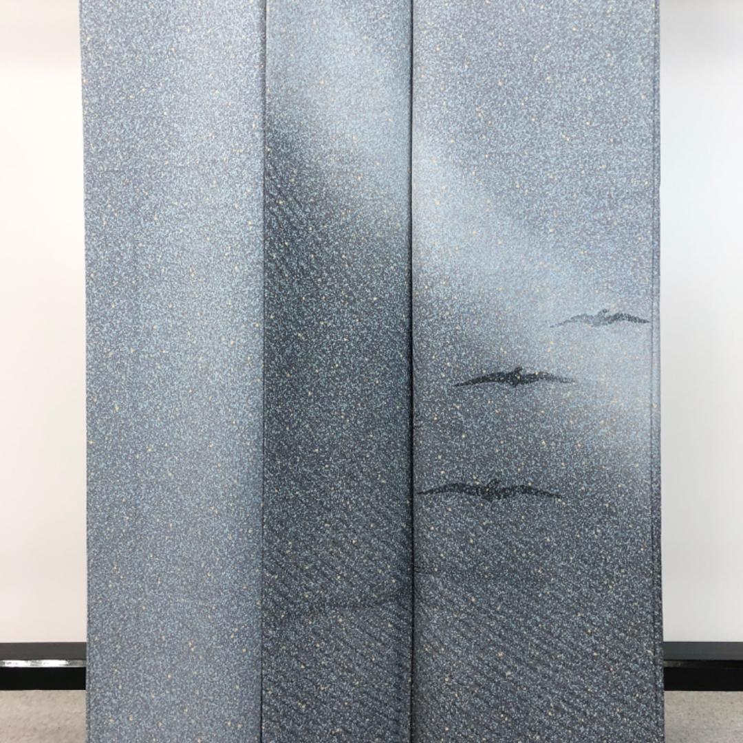 空色鼠ベースのお色味に鳥柄、暈し、叩き染でデザインされた素敵な柄行のお品でございます。