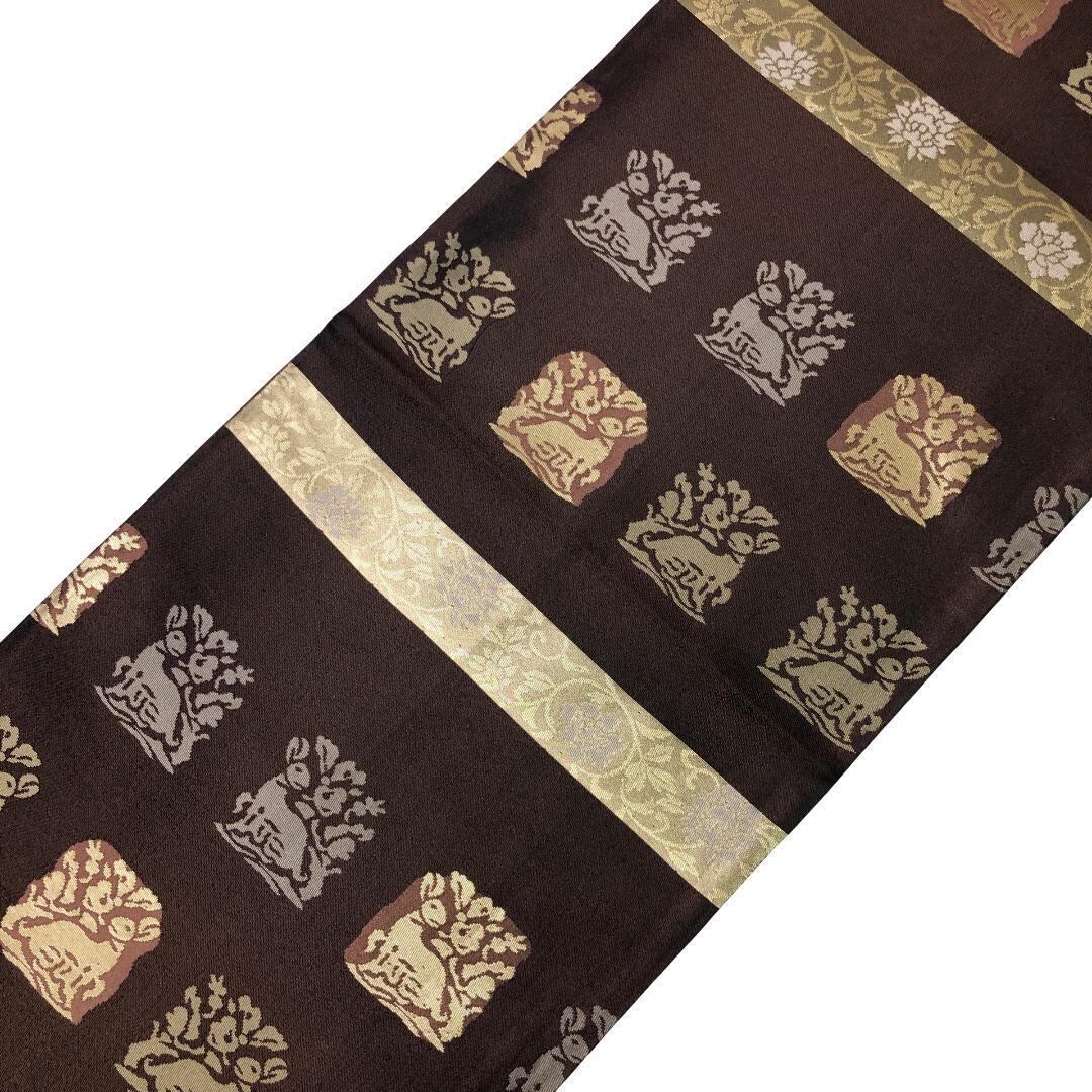 焦茶色ベースのお色味に花兎、花唐草模様の柄裄がデザインされた素敵なお品でございます。