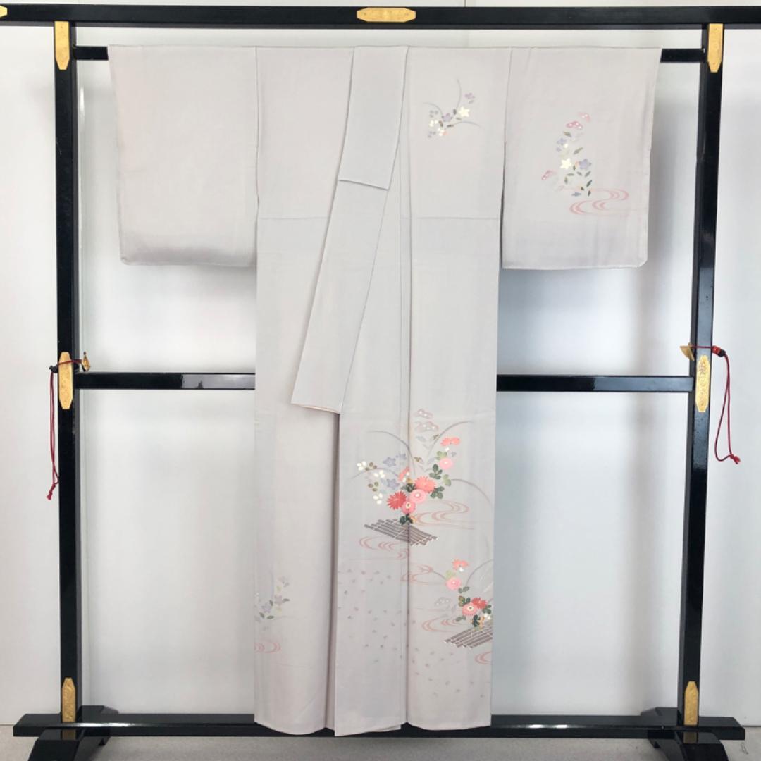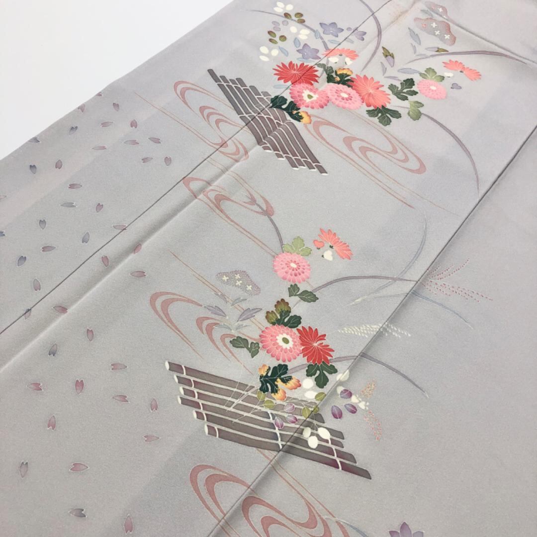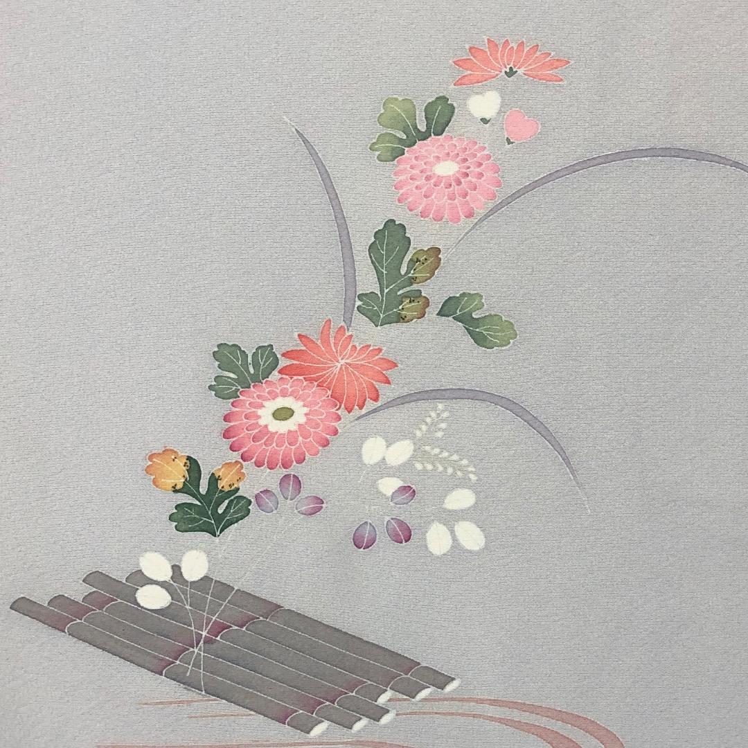 灰色の品のあるお色味の縮緬地に流水に花模様の友禅の柄裄がデザインされた素敵なお品でございます。