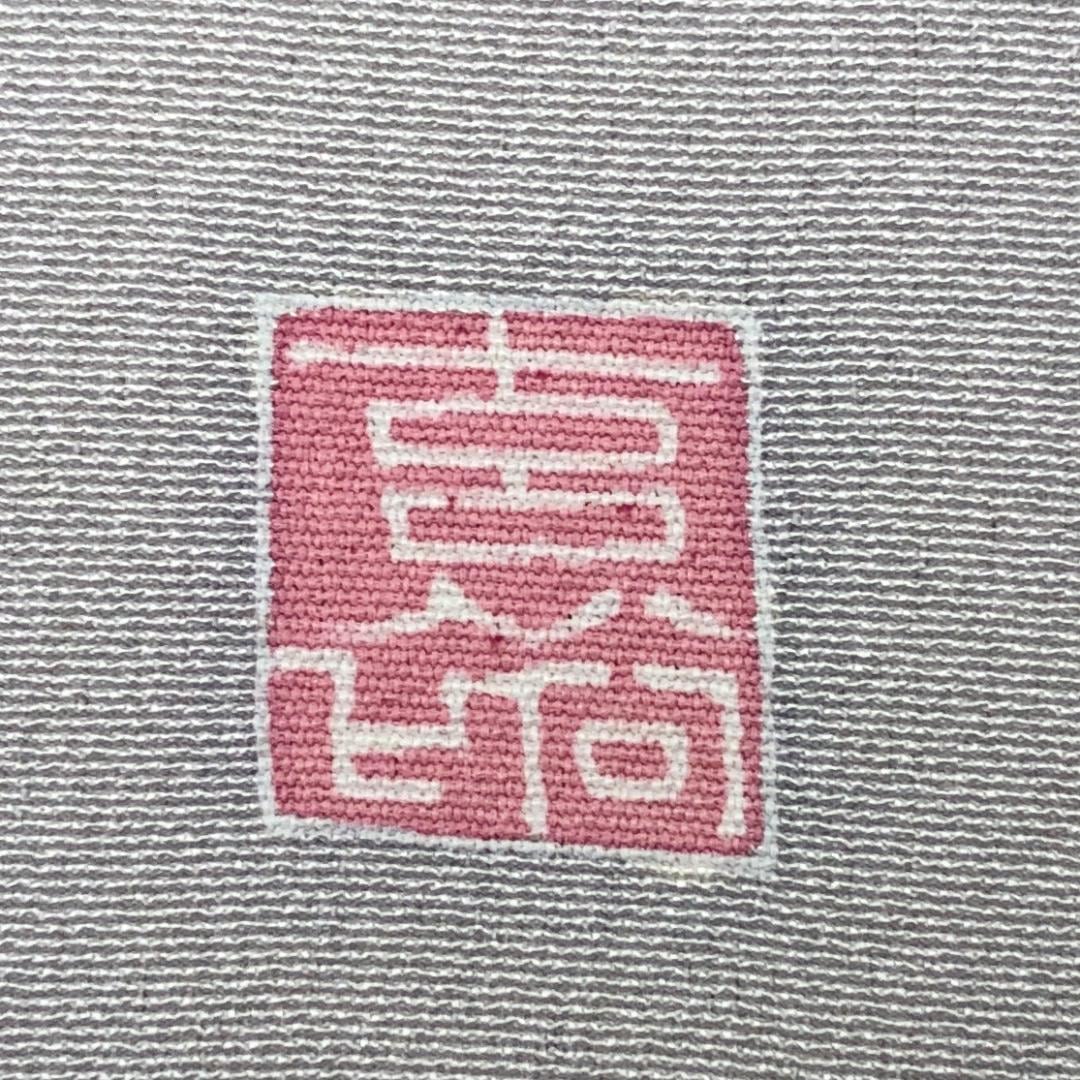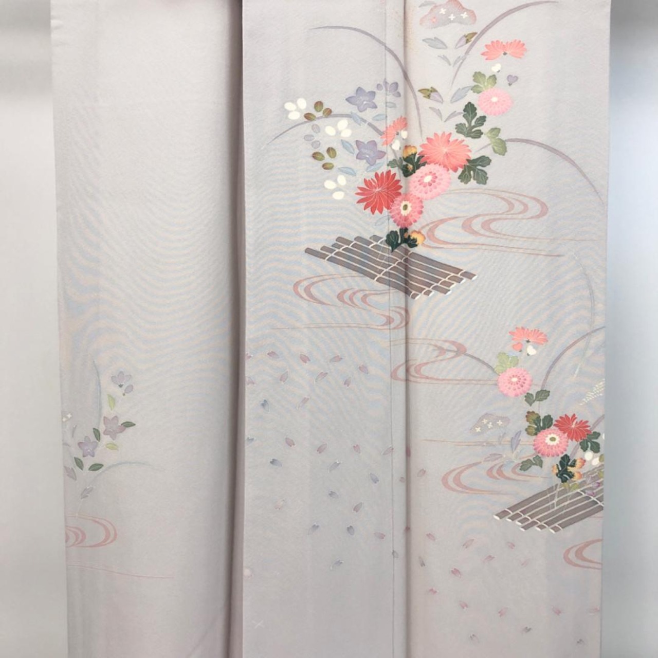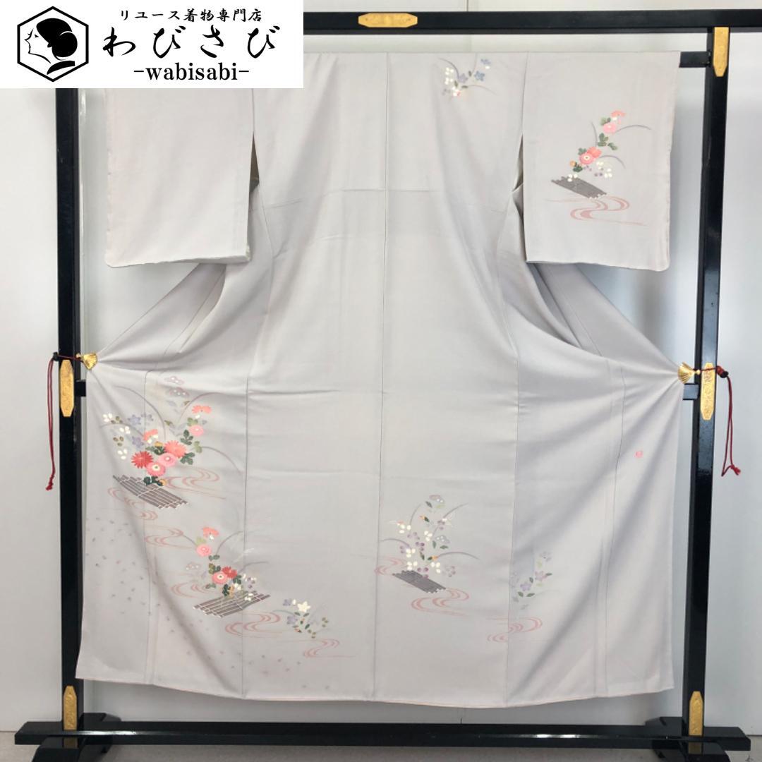 灰色の品のあるお色味の縮緬地に流水に花模様の友禅の柄裄がデザインされた素敵なお品でございます。
