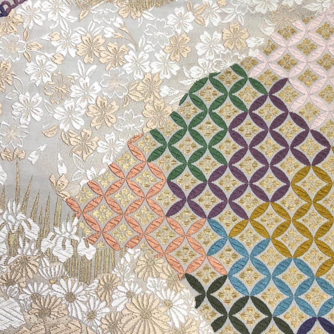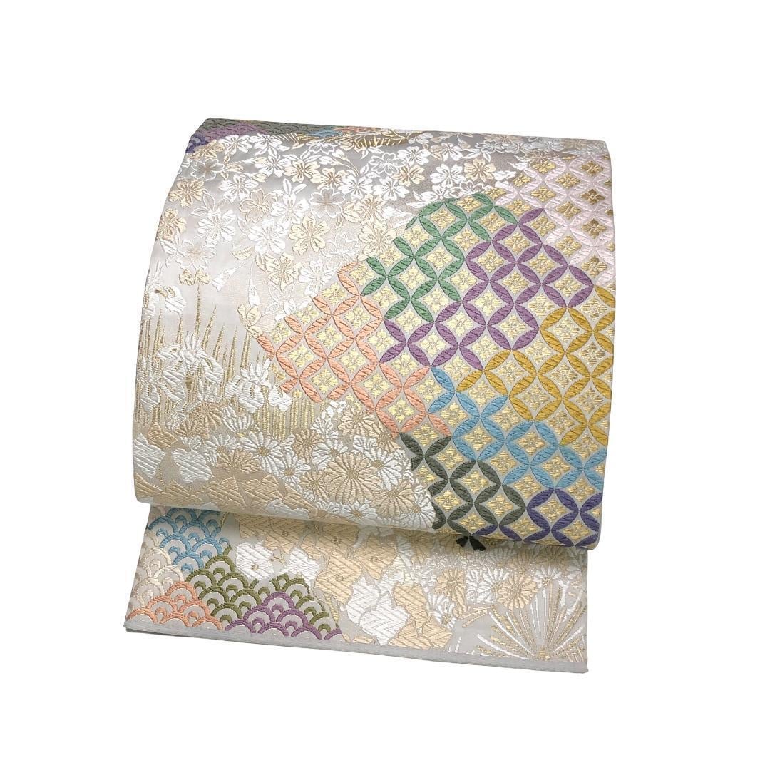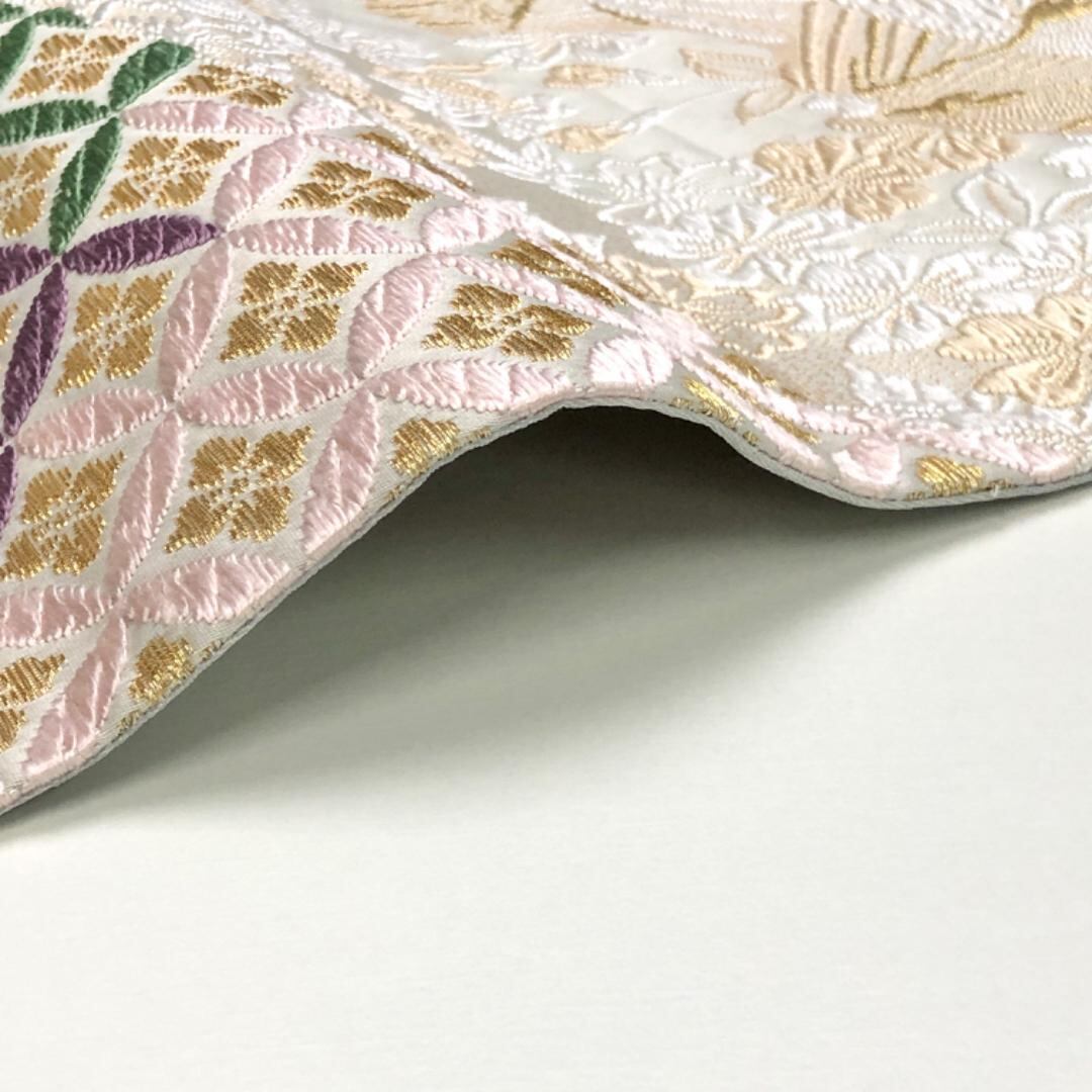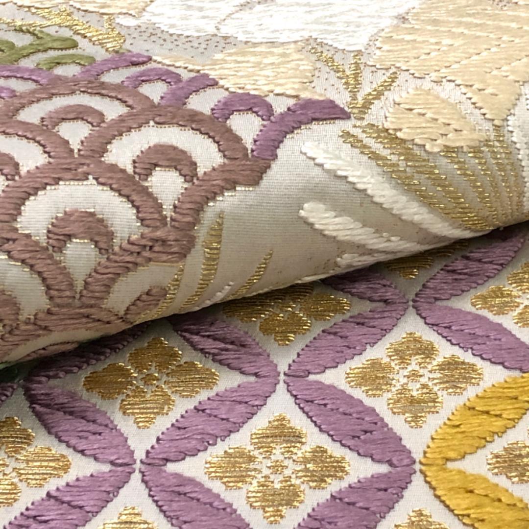胡粉色ベースのお色味の草木唐織の色彩美しい花七宝、青海波、花柄模様などがデザインされた上品で素敵な柄裄のお品でございます。