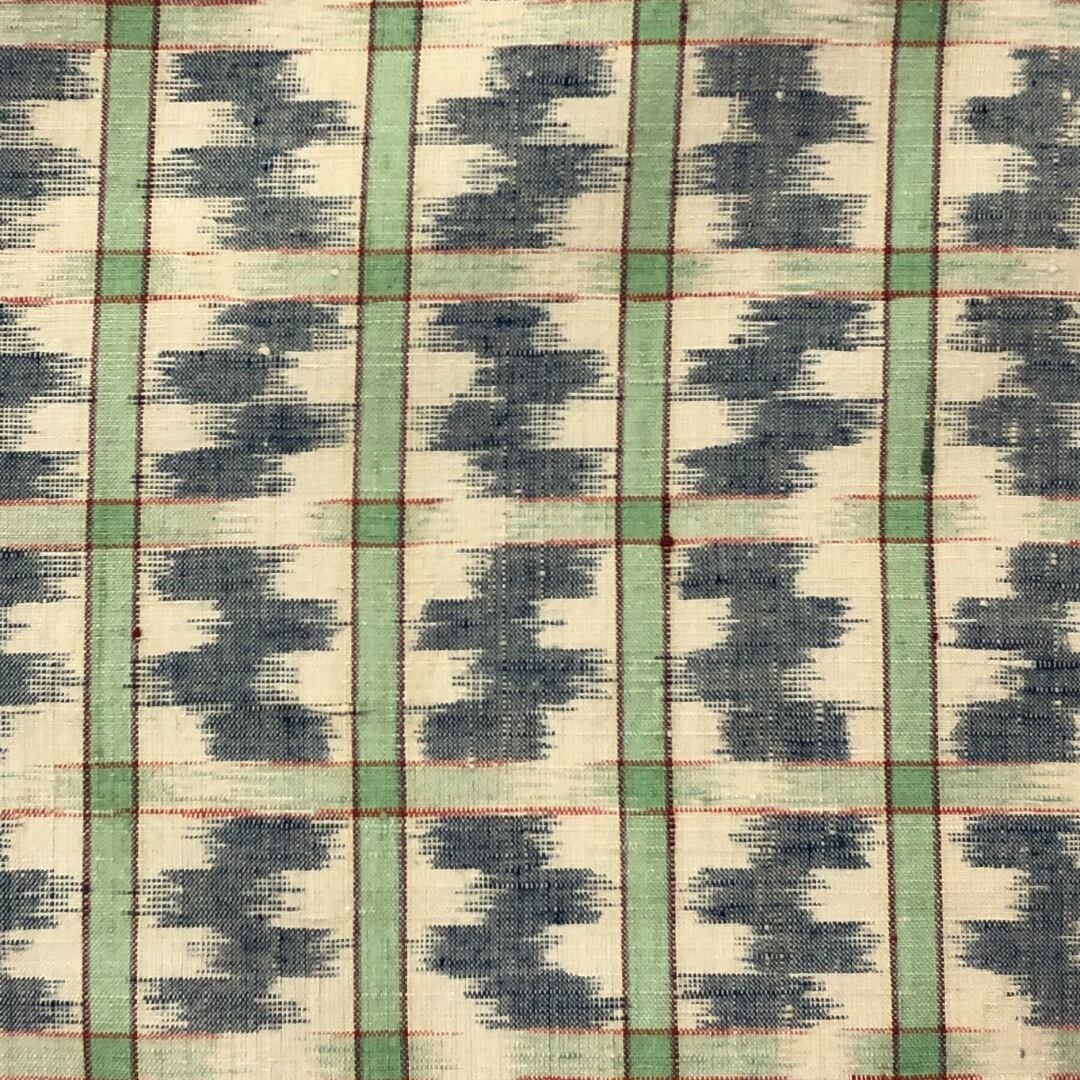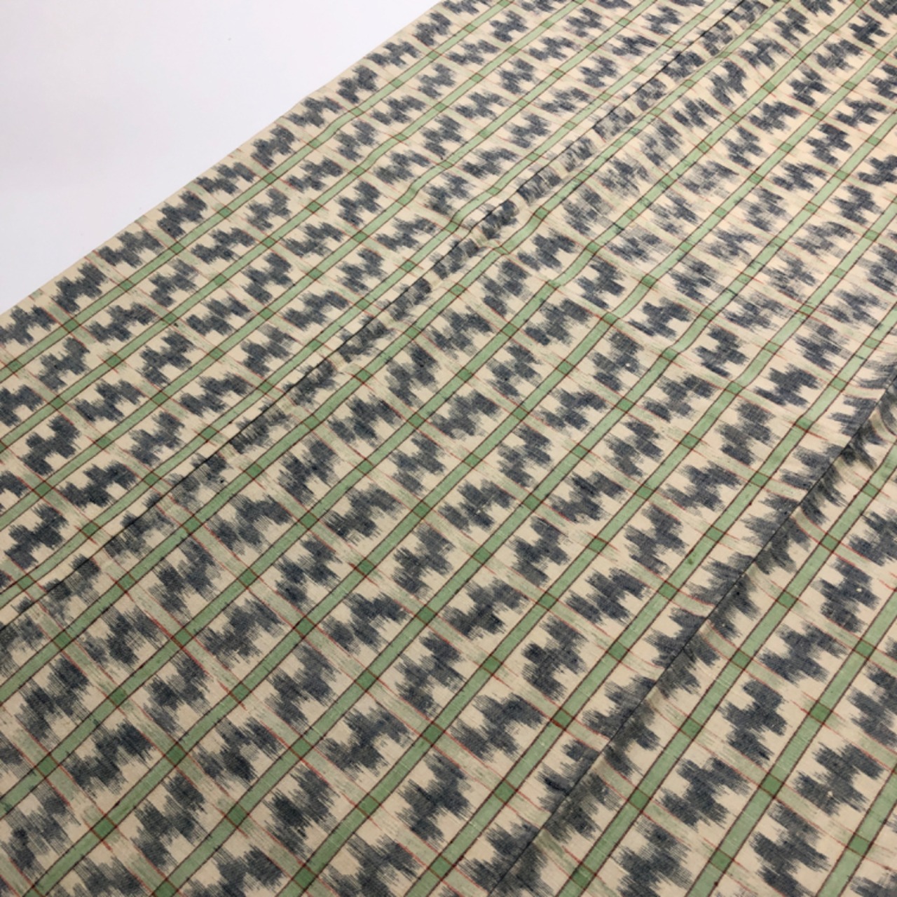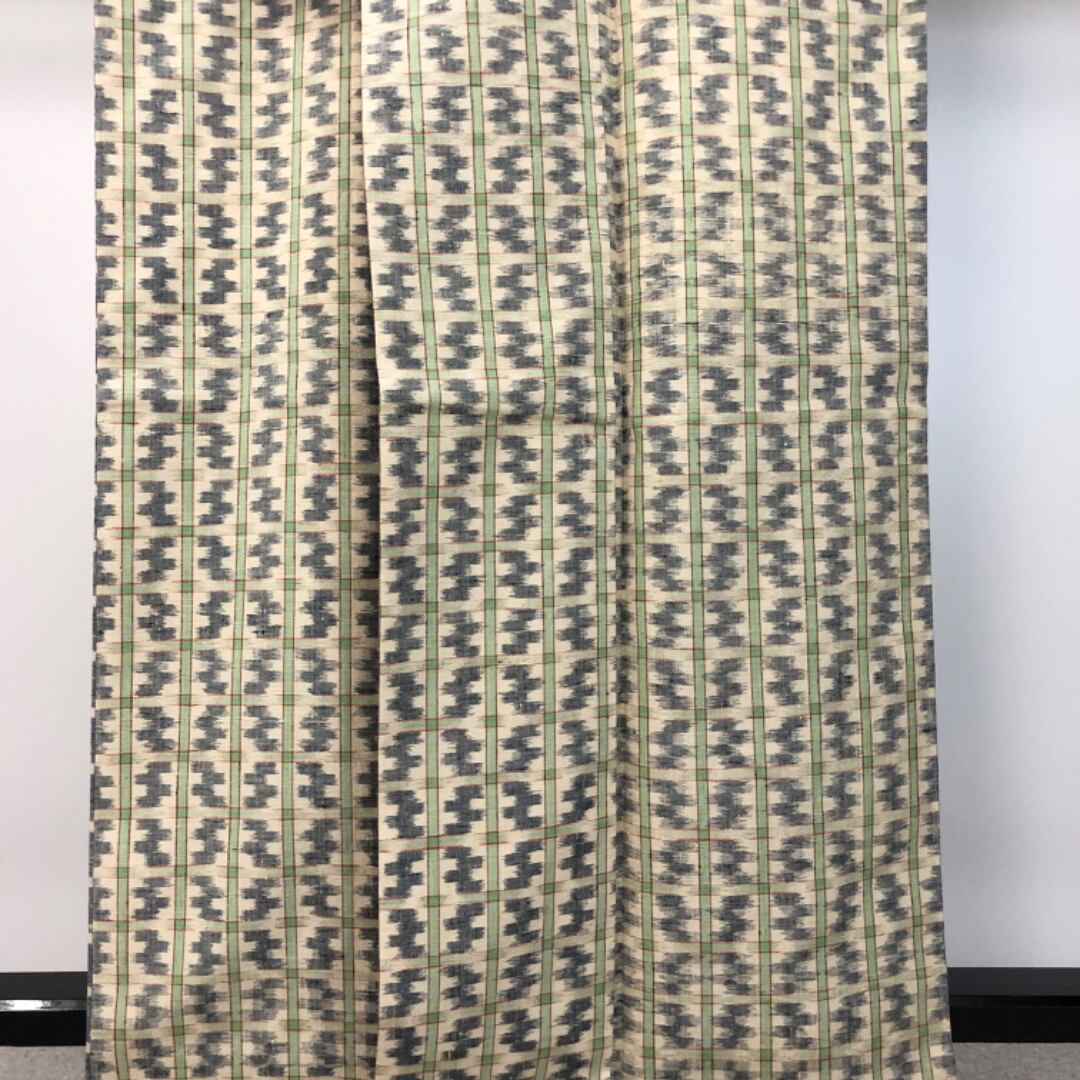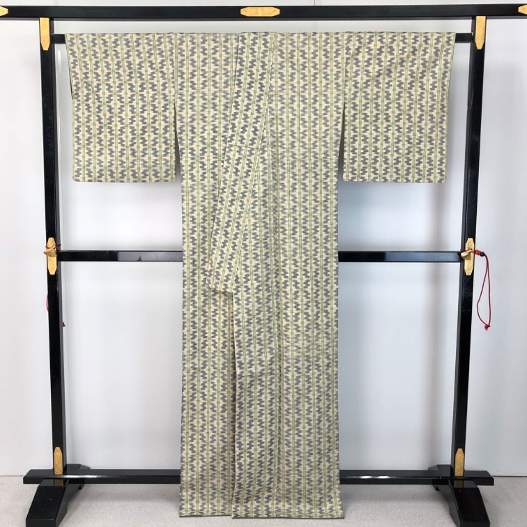 牙黄色ベースのお色味に抽象模様の柄裄がデザインされた素敵なお品でございます。