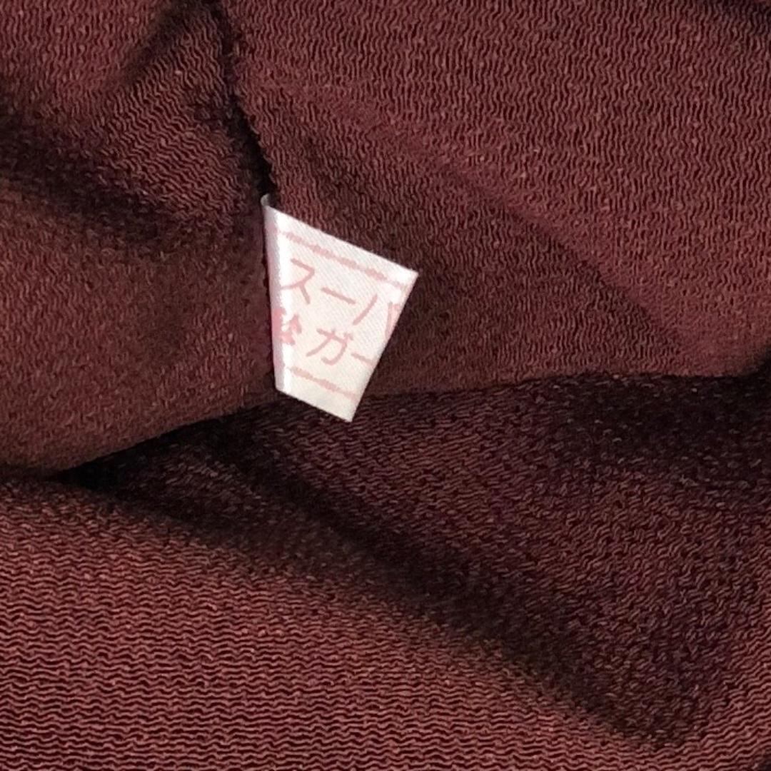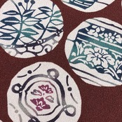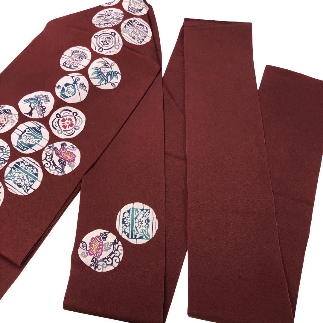 赤茶色のお色味の縮緬地に型染の丸の中に花模様、松、花瓶などの柄裄がデザインされた雰囲気の良い素敵なお品でございます。
