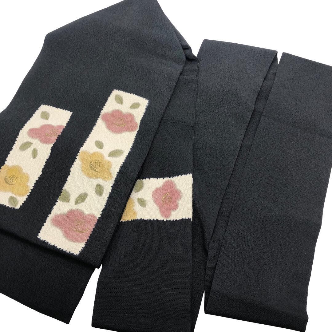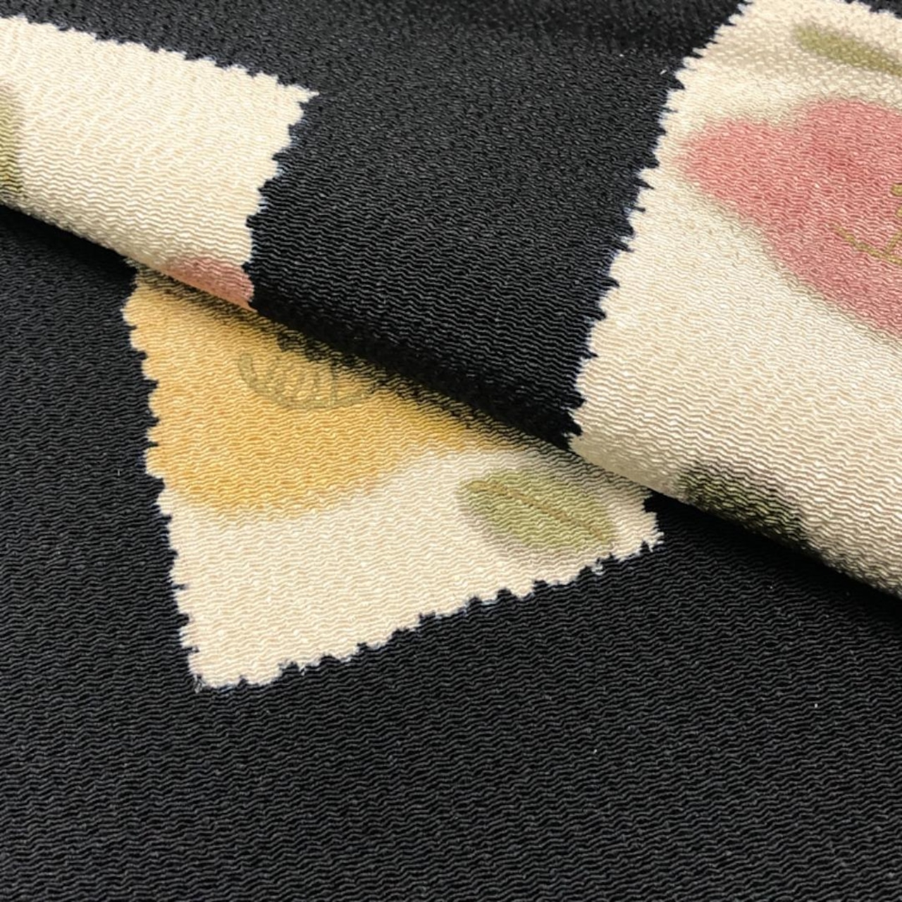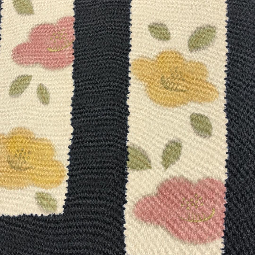 黒色のお色味の縮緬地に縦長四角の中に絞りの椿の花模様の柄裄がデザインされた素敵なお品でございます。