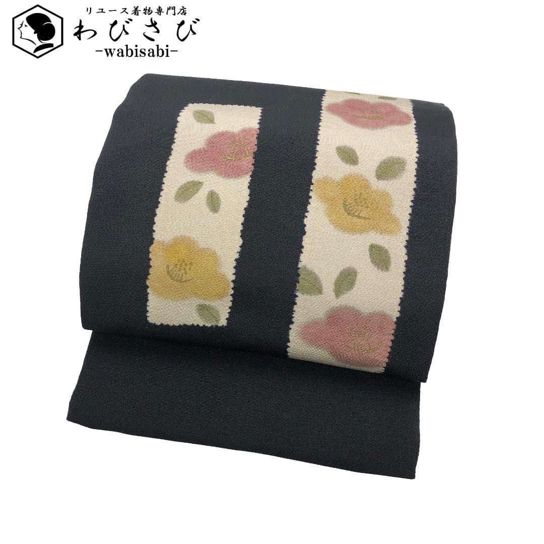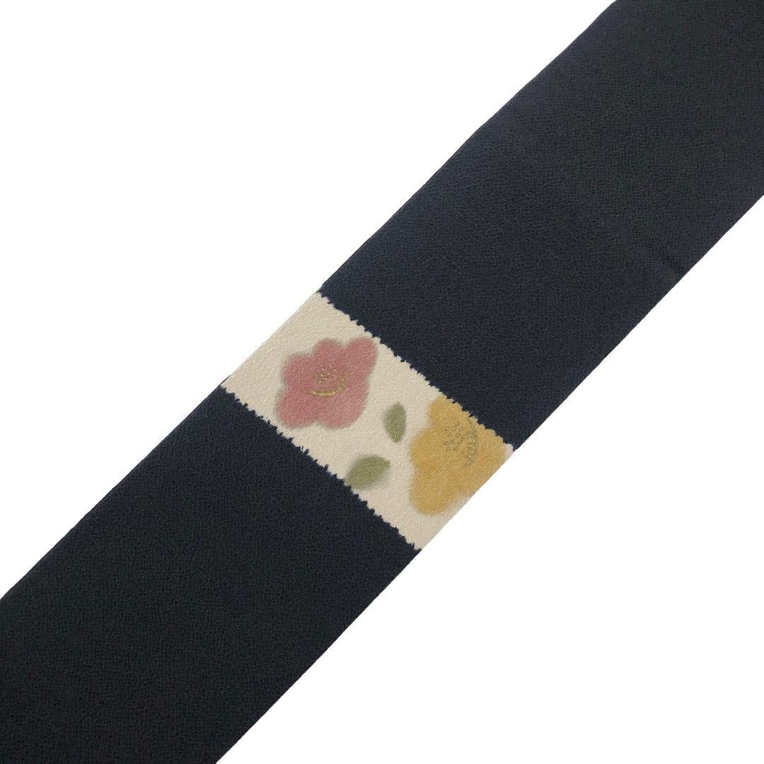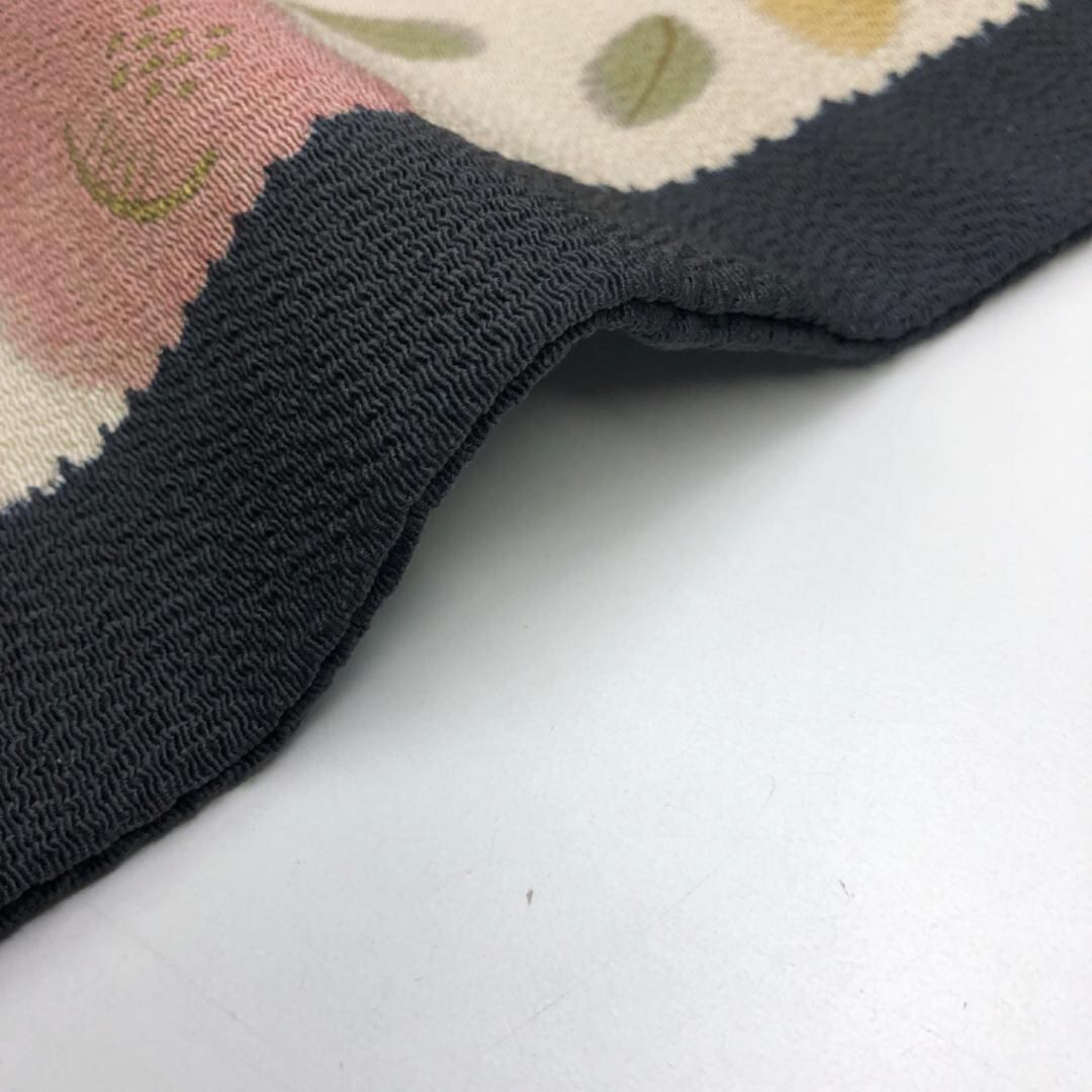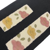 黒色のお色味の縮緬地に縦長四角の中に絞りの椿の花模様の柄裄がデザインされた素敵なお品でございます。