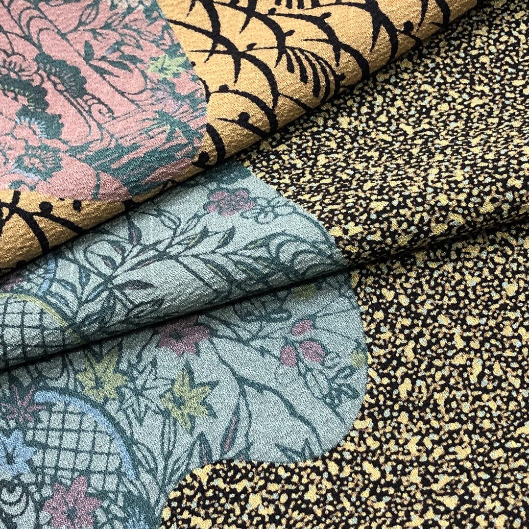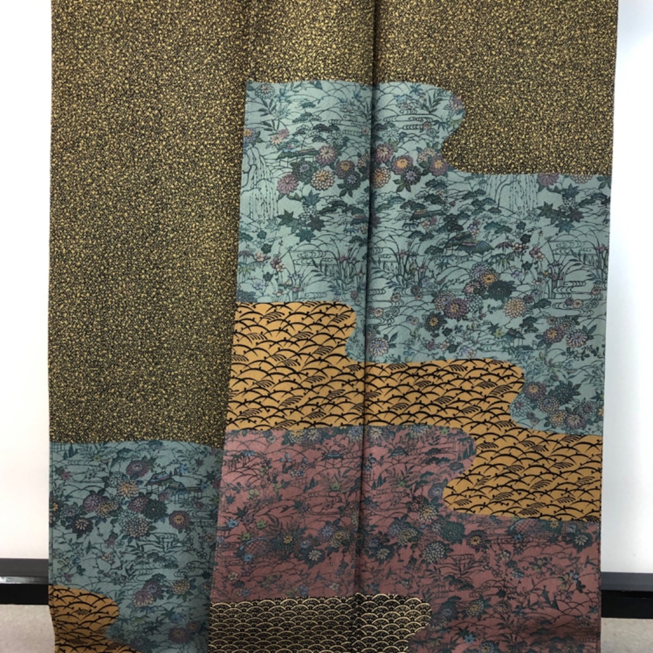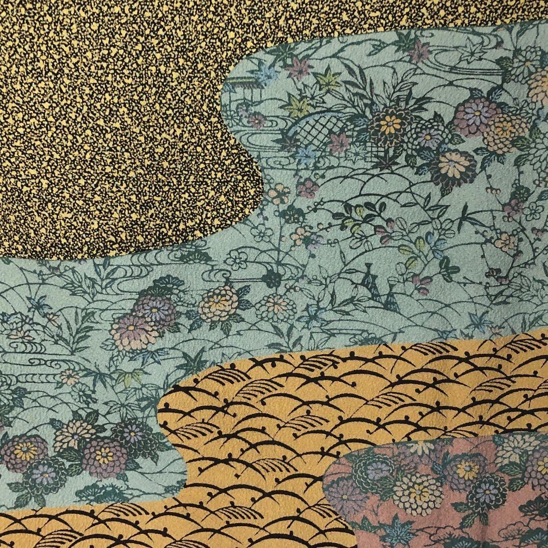 浅黄色ベースの落ち着きのあるお色味の縮緬地に霞に草花模様の柄裄がデザインされた雰囲気の良い素敵なお品でございます。