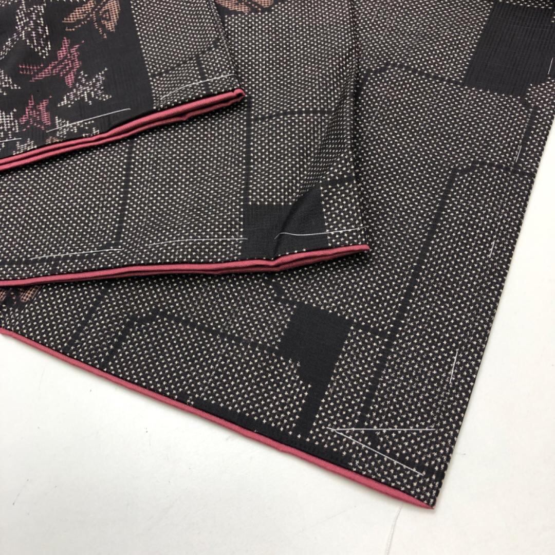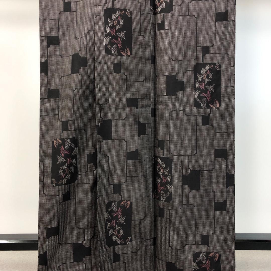 本場大島紬 茶泥染 一元5マルキ 四角に蝶々 しつけ糸 K-5115 着物 きもの kimono 和服 和装 中古 リサイクル着物 【送料無料】