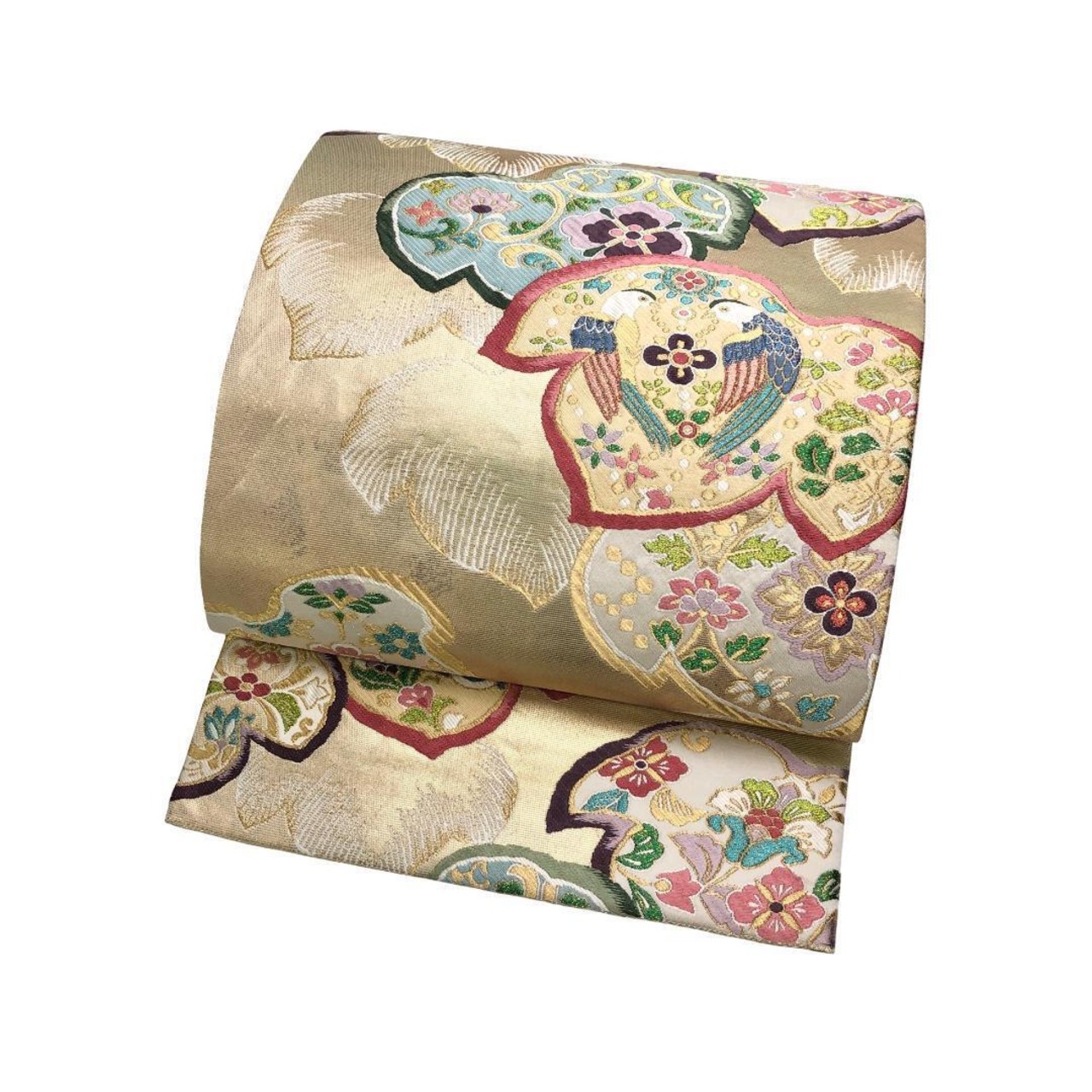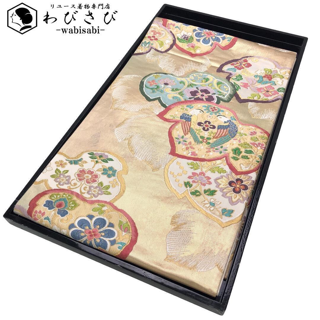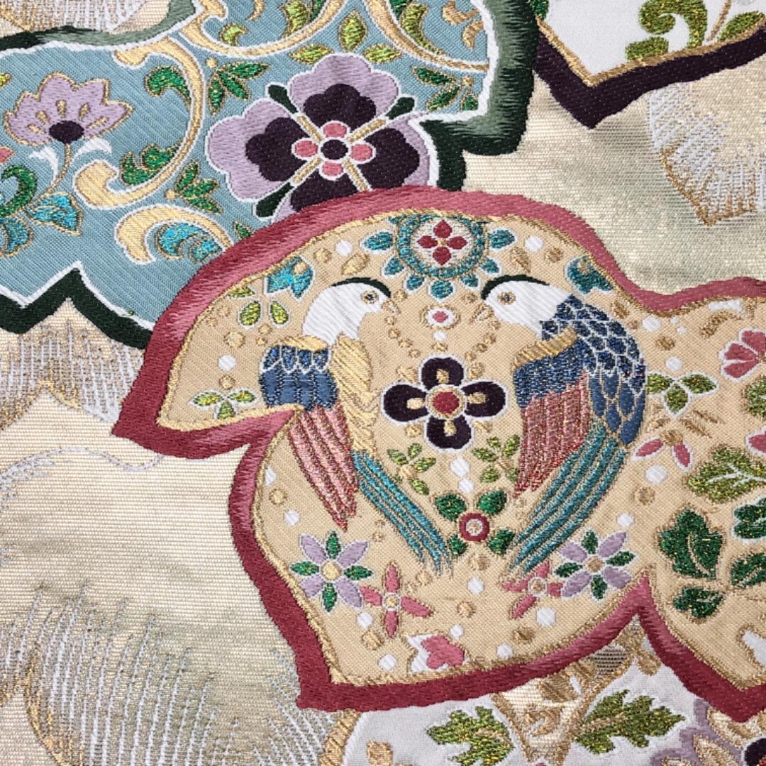 金色のお色味に葉模様の中に鳥、花模様の柄裄がデザインされた素敵なお品でございます。