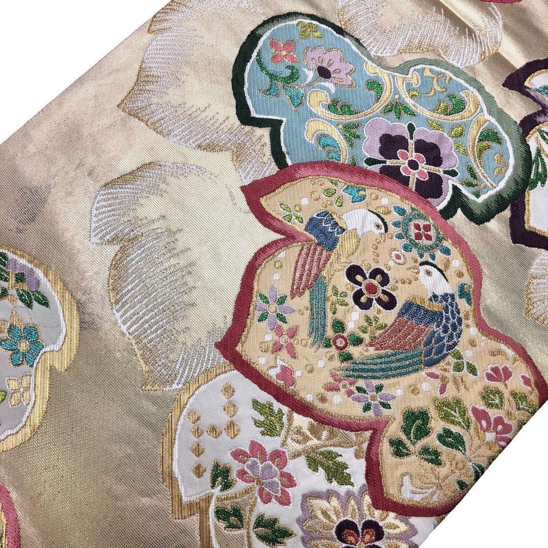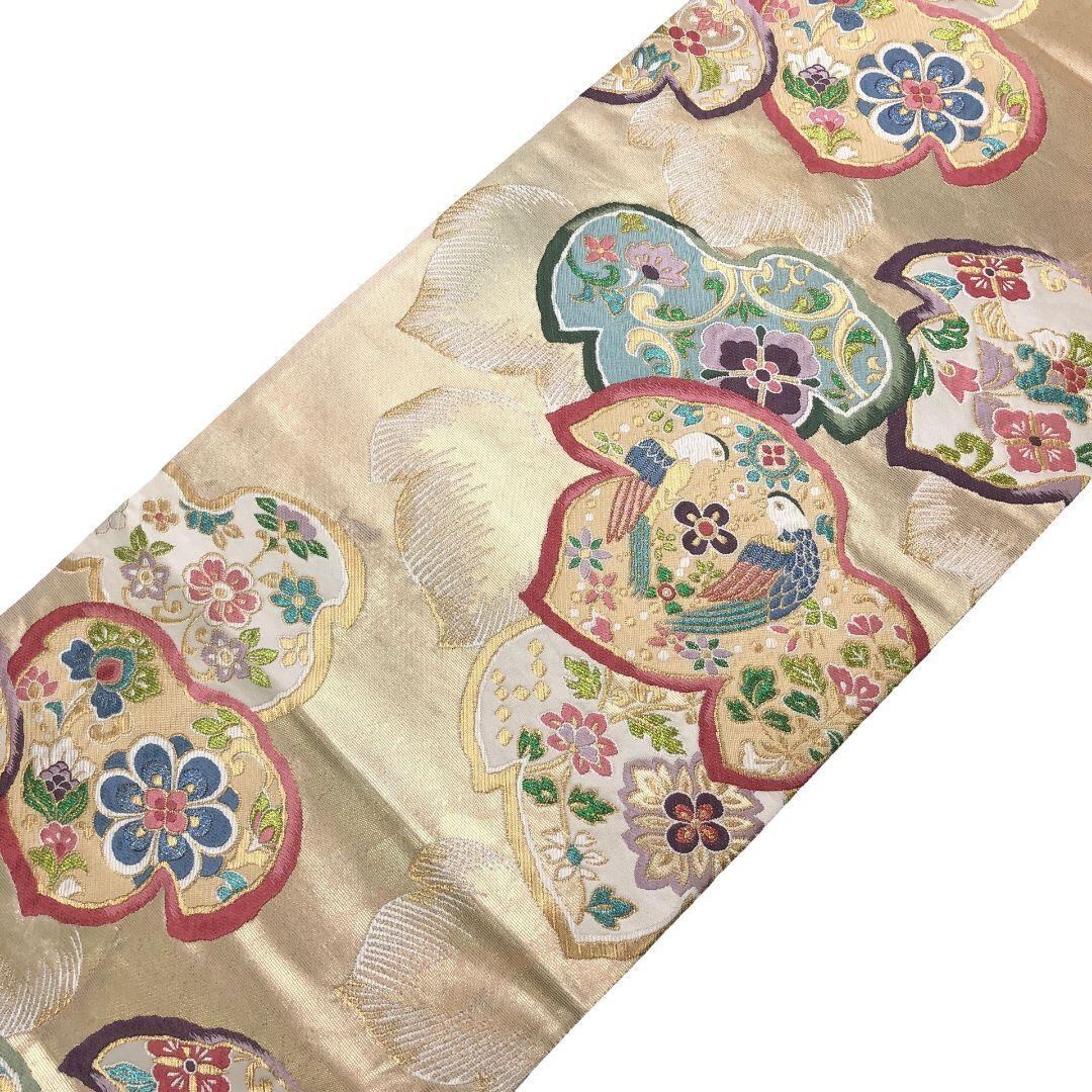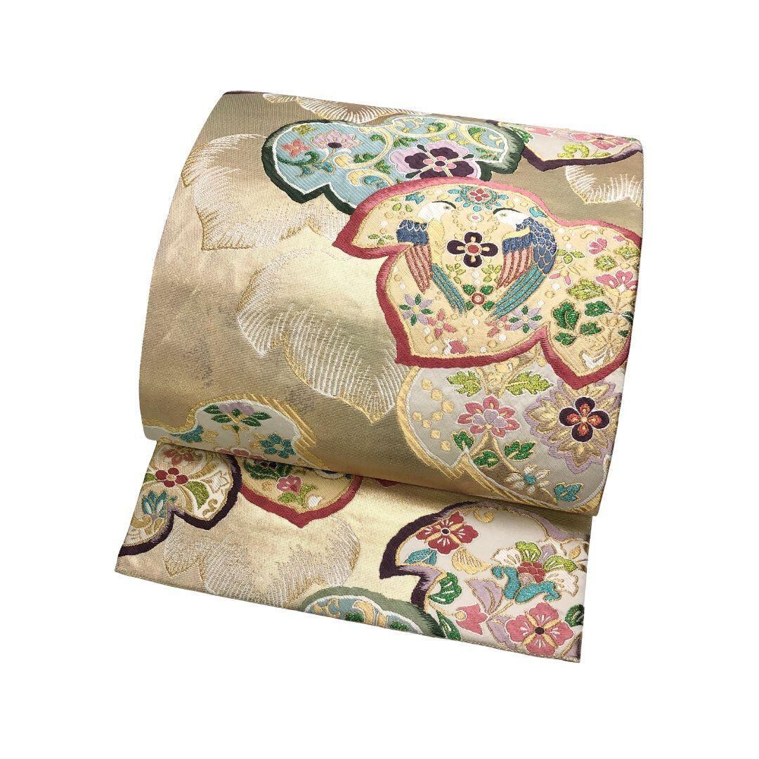 袋帯 作家物 鳥や花模様 金糸 金色 O-5416 着物 きもの kimono 和服 和装 中古 リサイクル着物 【送料無料】