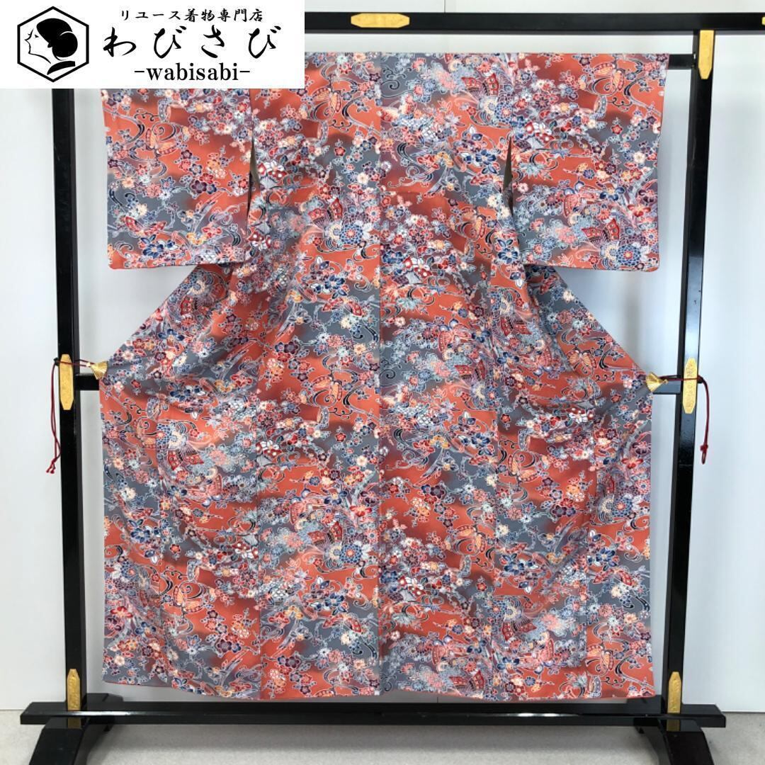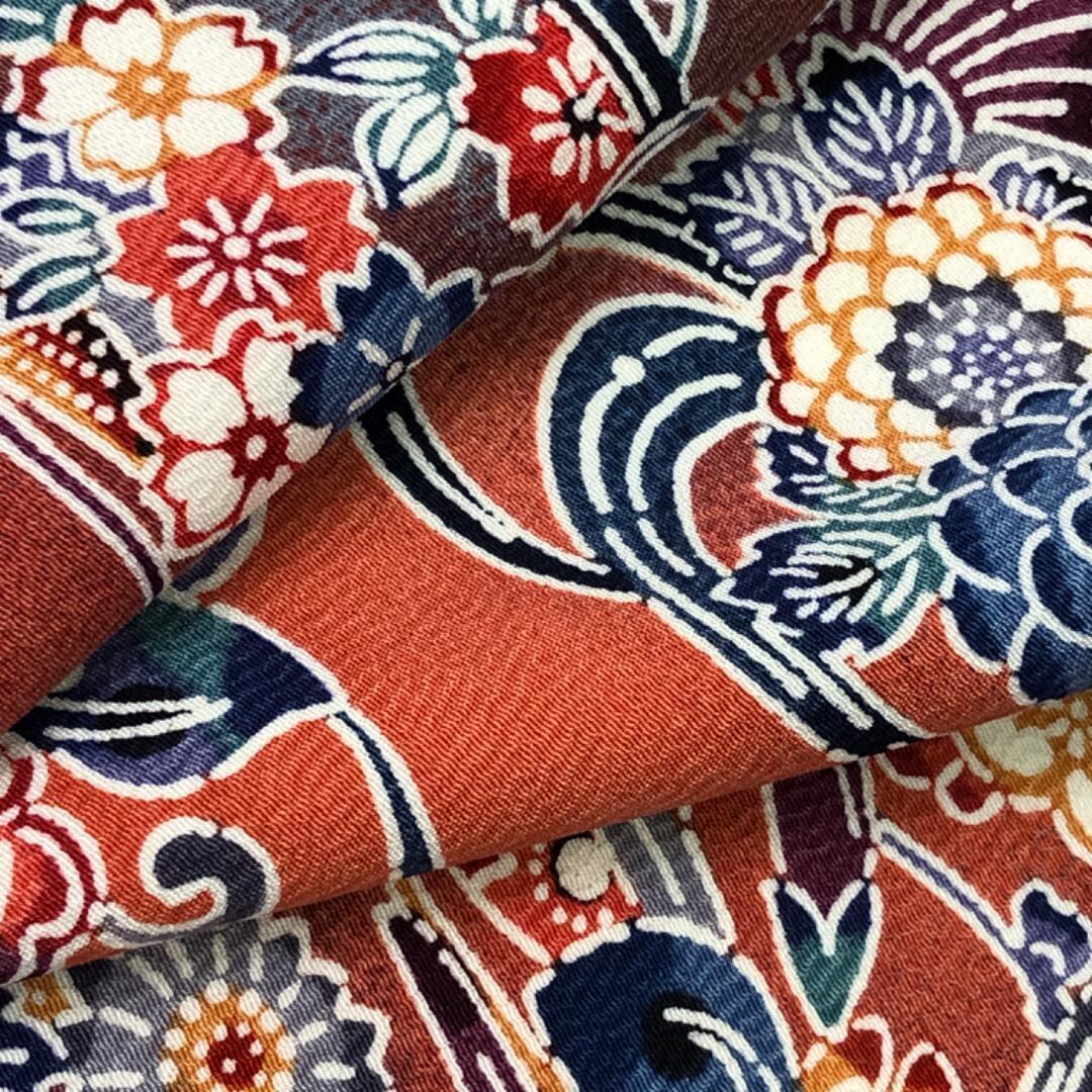 京緋色ベースのお色味に蝶々に花模様などの柄裄が型染めでデザインされた素敵なお品でございます。