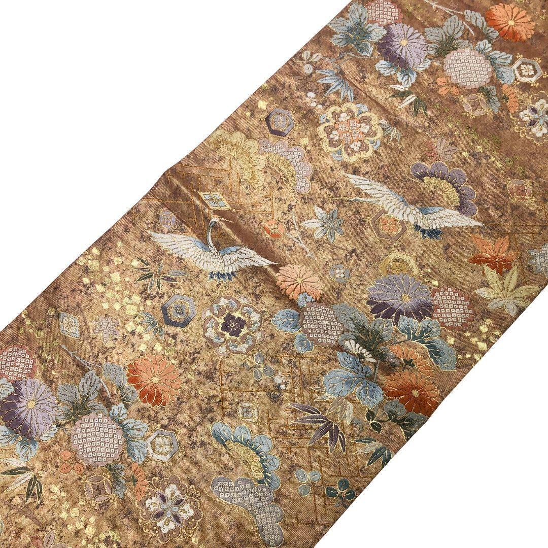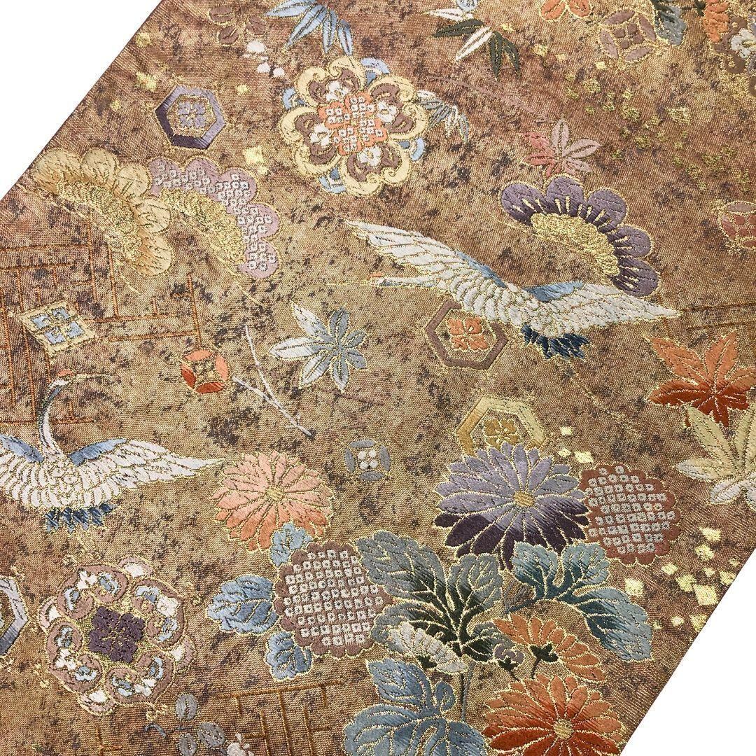 袋帯 鶴 松に花模様 嵯峨鼠色 金糸 O-5434 着物 きもの kimono 和服 和装 中古 リサイクル着物 【送料無料】