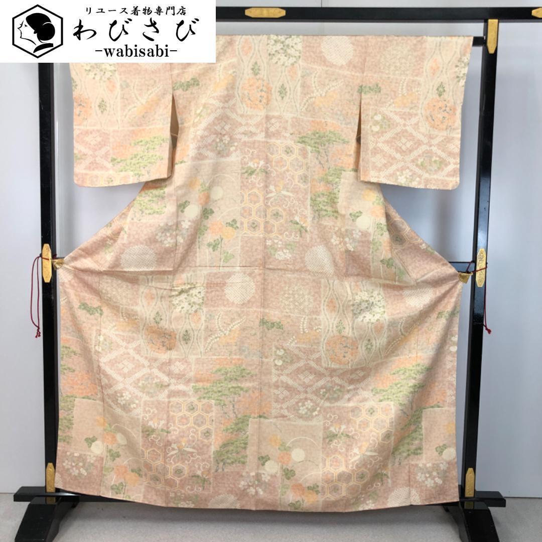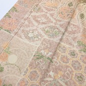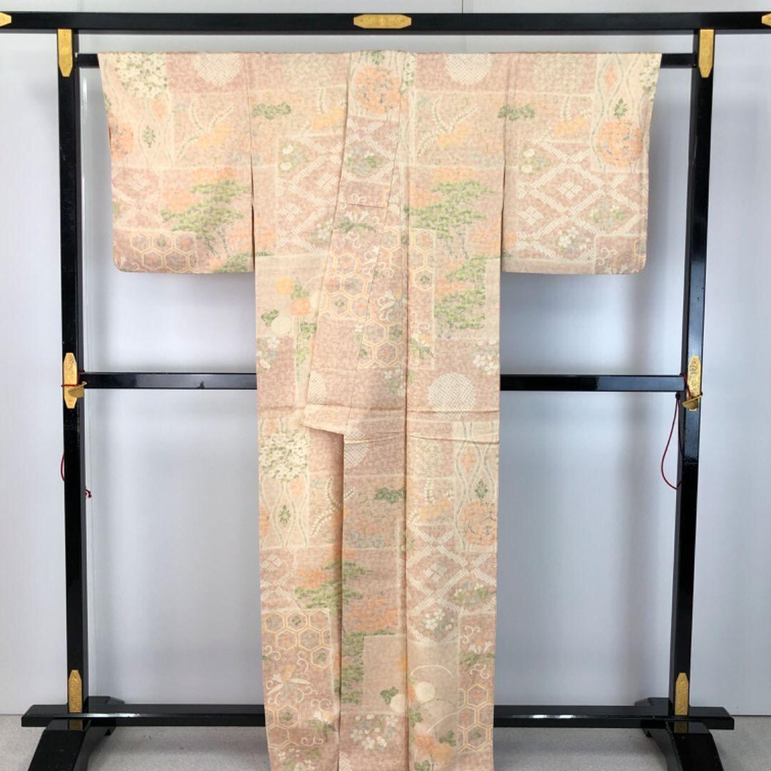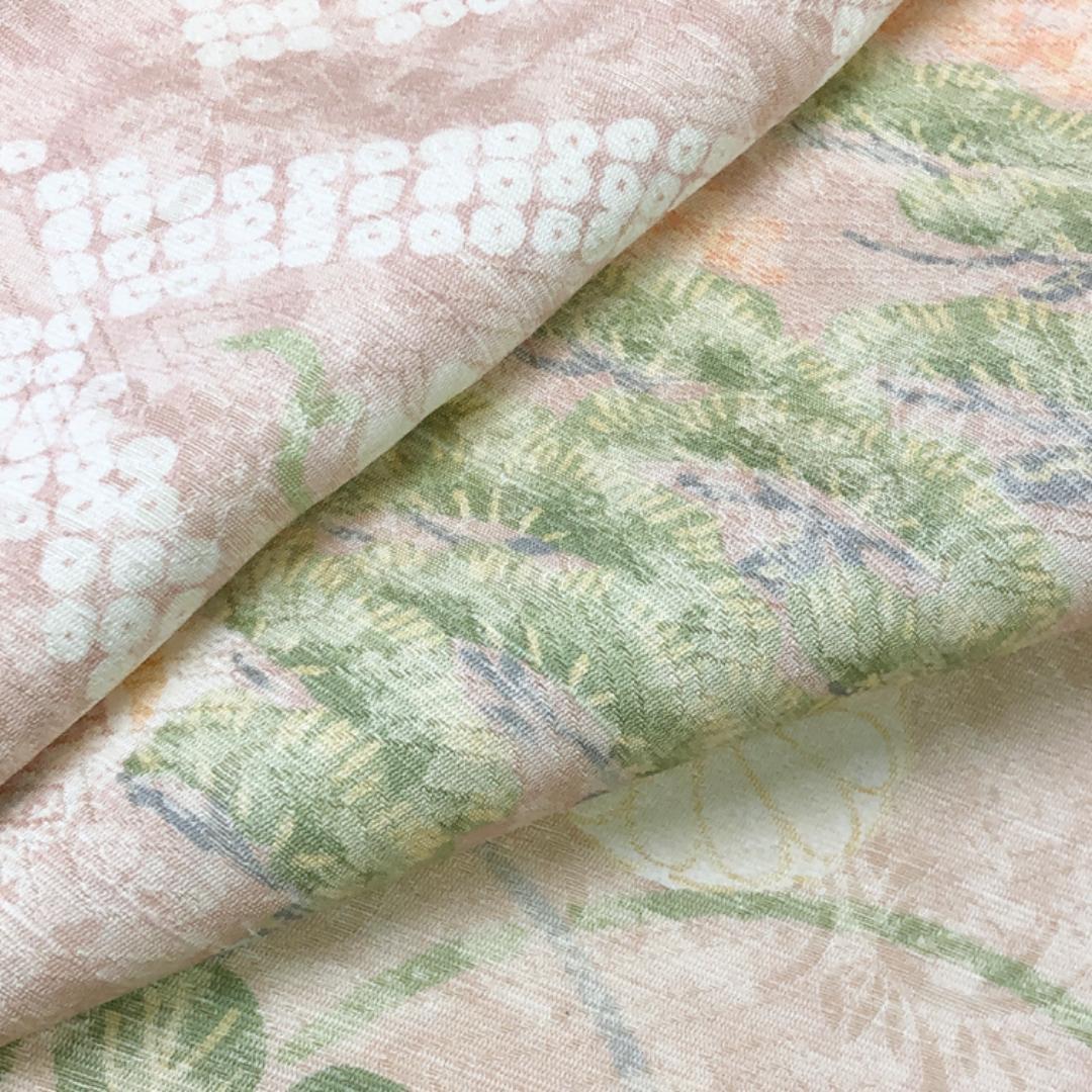 乙女色ベースのお色味に花亀甲、松の木に花模様の柄裄がデザインされた素敵なお品でございます。