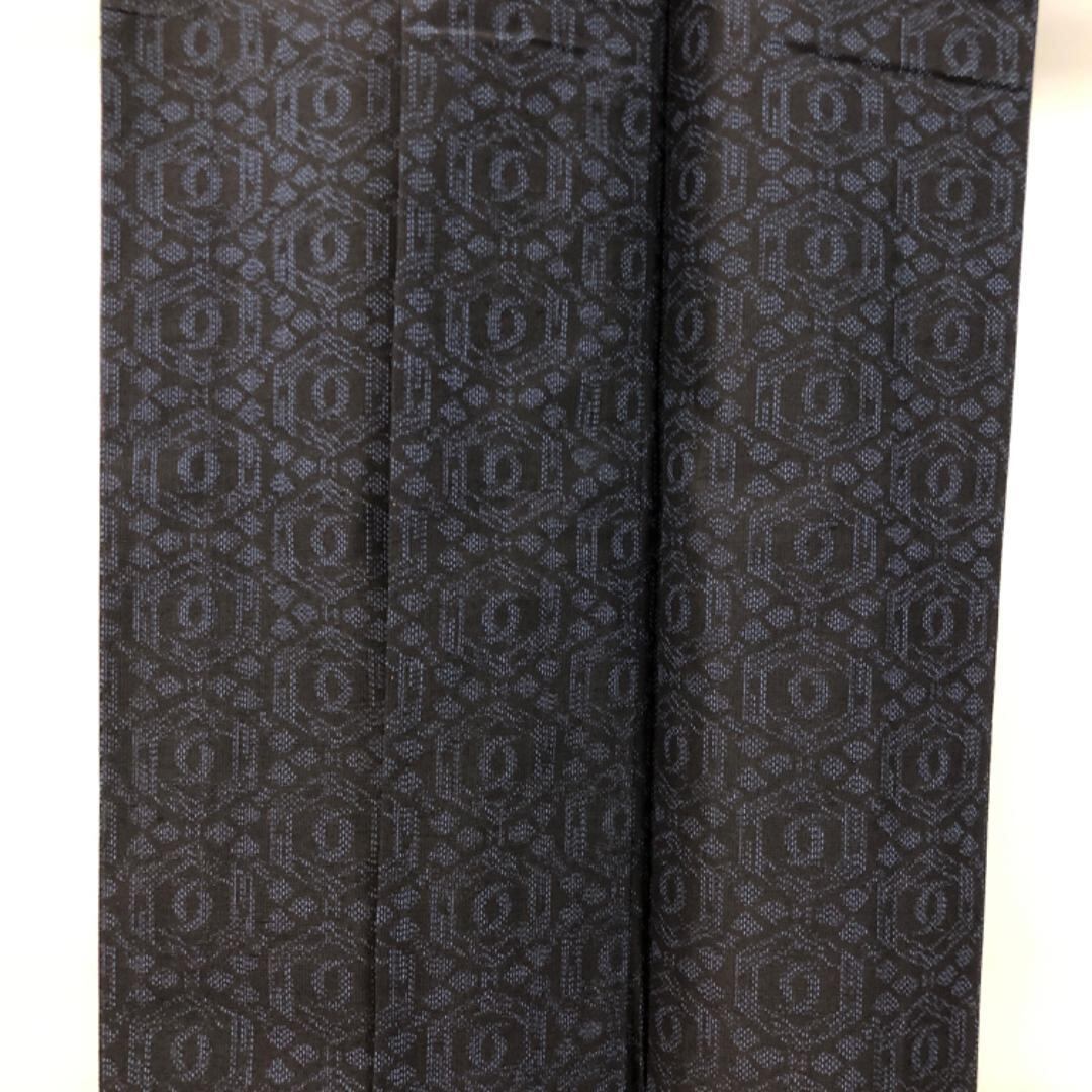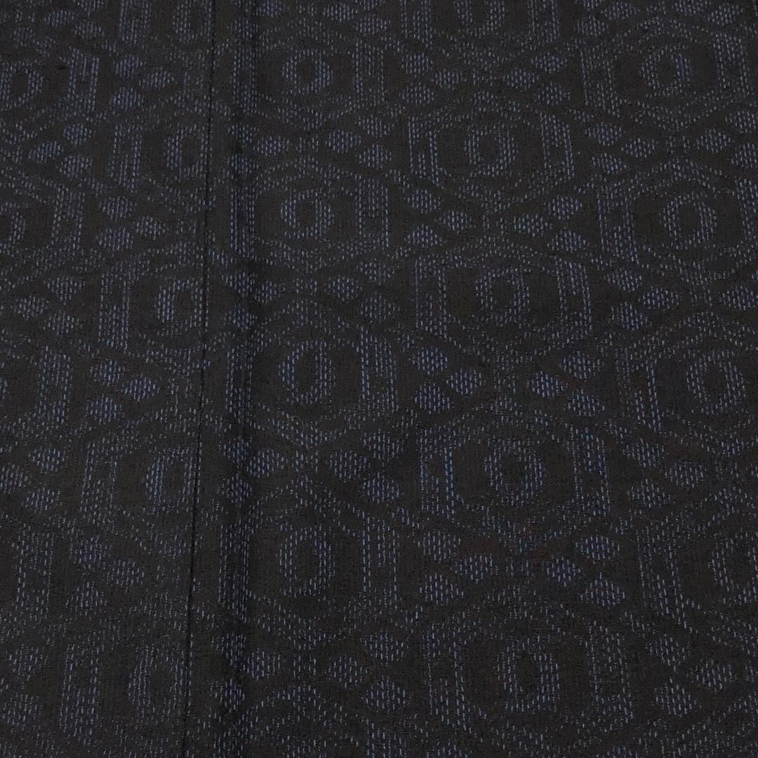 紺鉄色のお色味の真綿紬、亀甲模様の柄裄がデザインされた素敵なお品でございます。