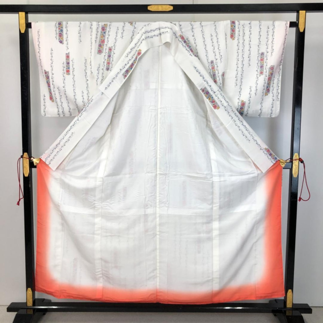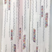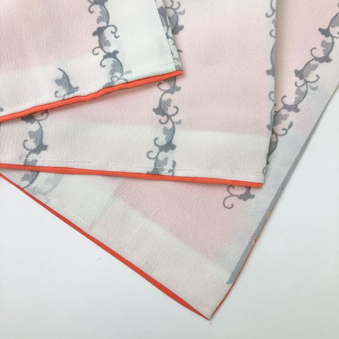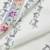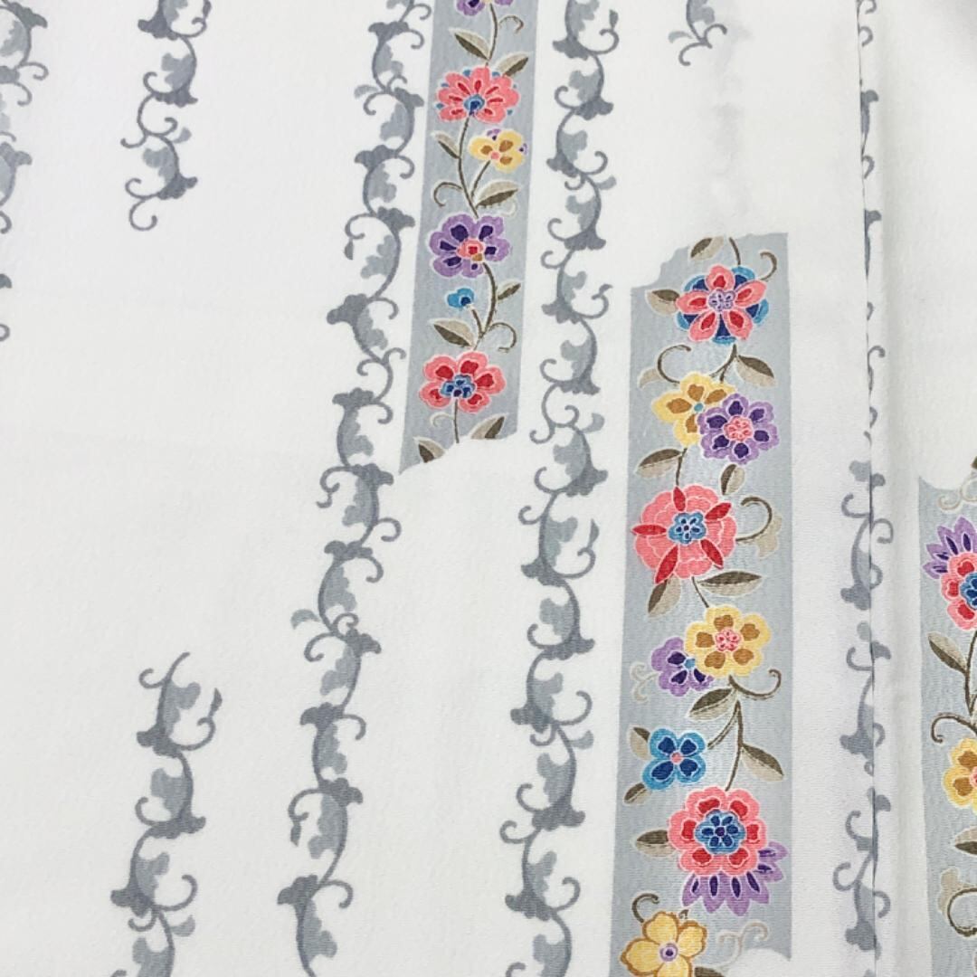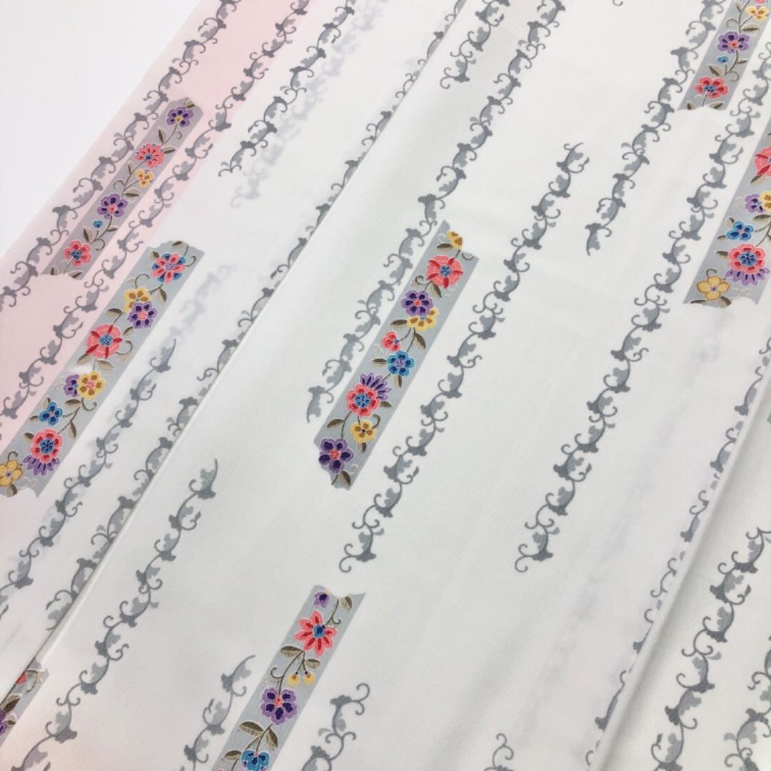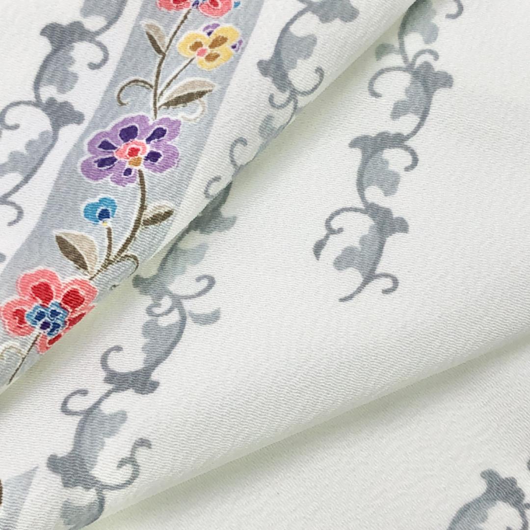 白色のお色味の縮緬地に縦柄の花唐草模様の柄裄がデザインされた素敵なお品でございます。