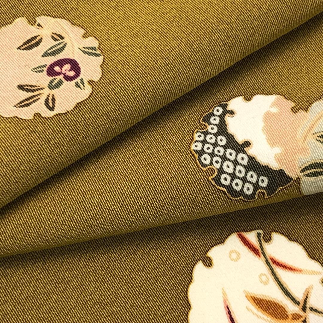 路考茶色のお色味の縮緬地に雪輪、花模様の柄裄がデザインされた素敵なお品でございます。