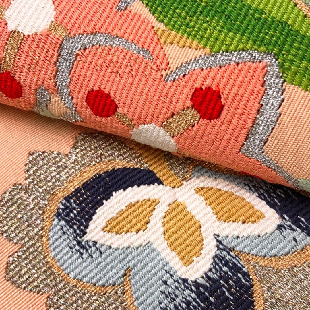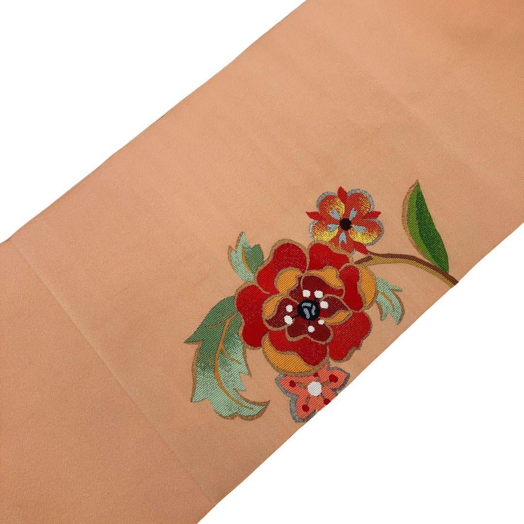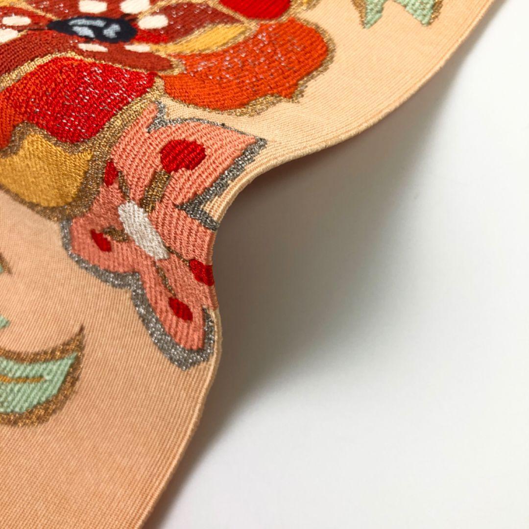 薄大和柿色のお色味に色鮮やかな花模様の柄裄がデザインされた素敵なお品でございます。
