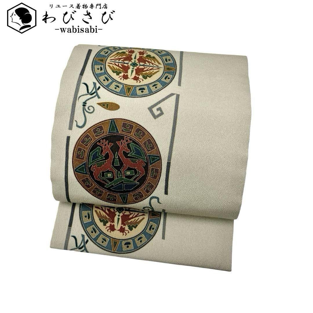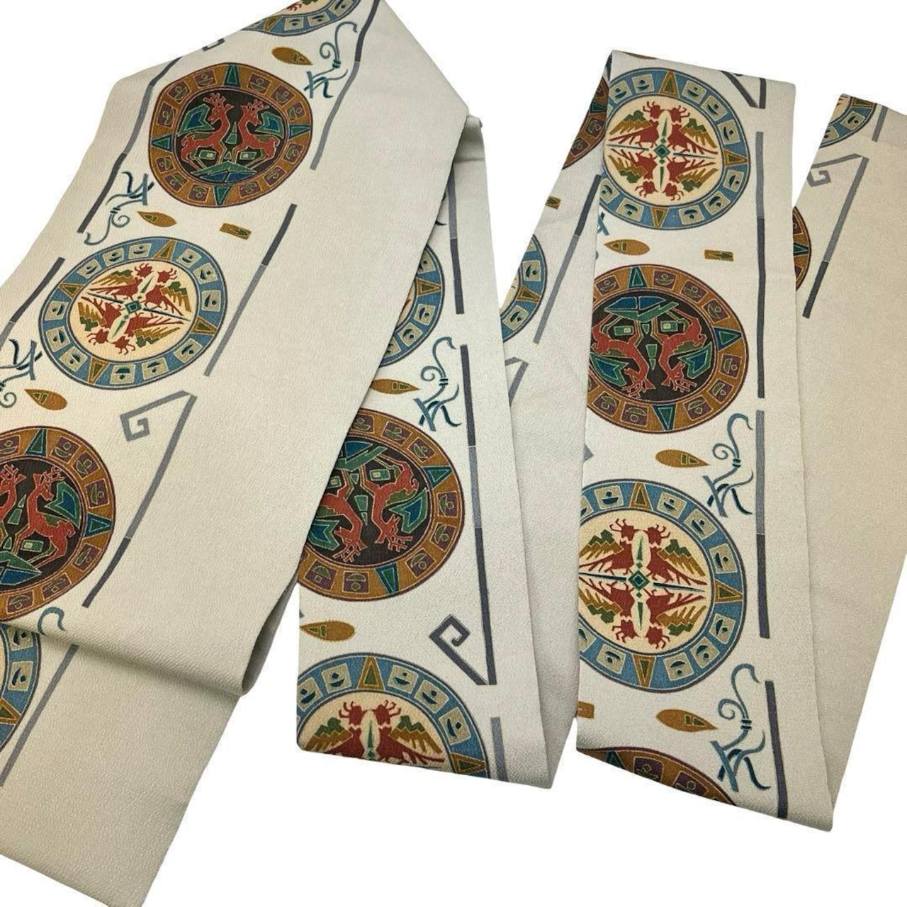 蝋色の鬼しぼ縮緬に丸に抽象動物柄がデザインされた素敵なお品でございます。