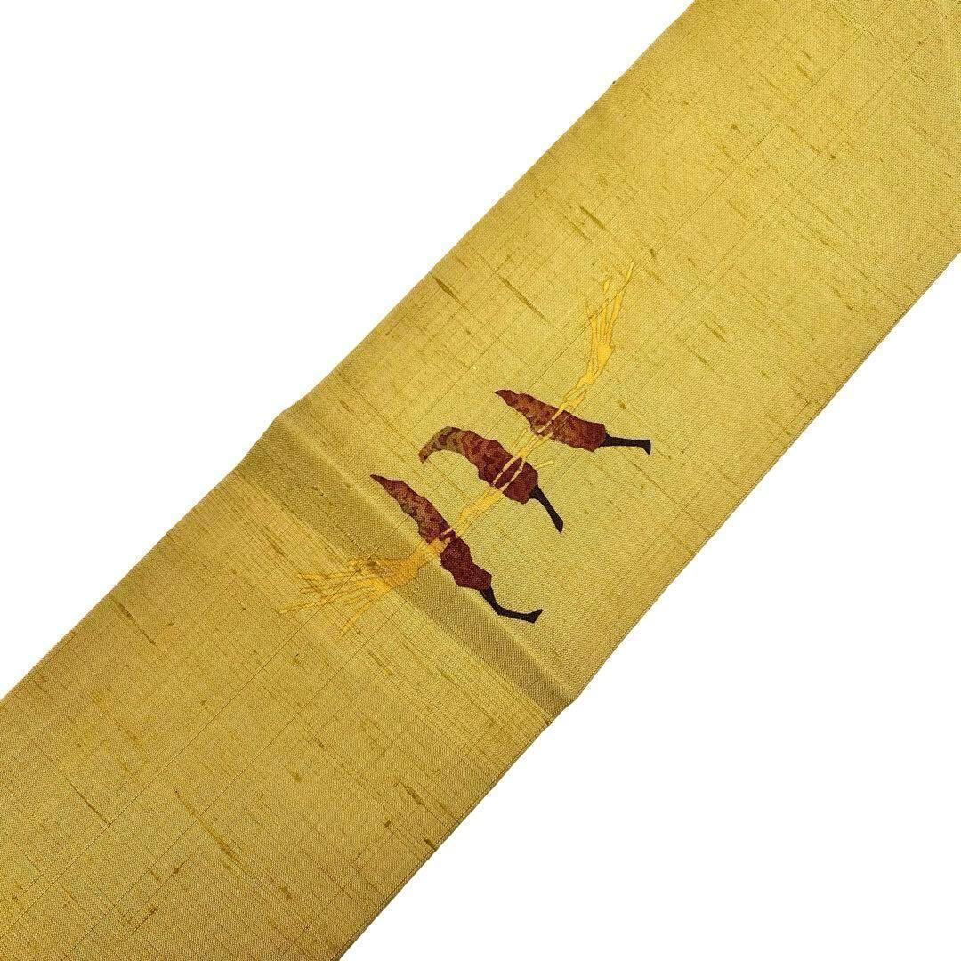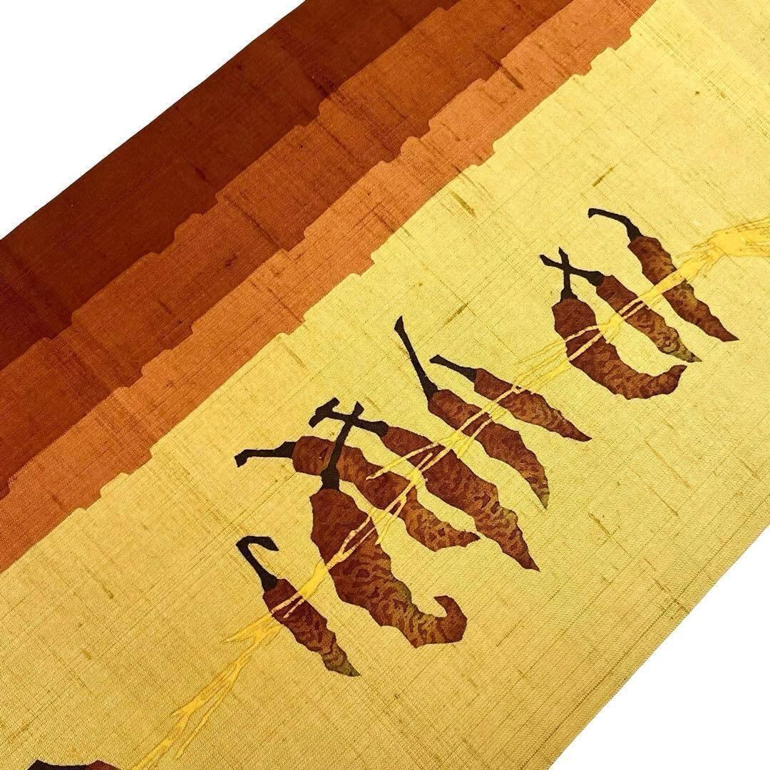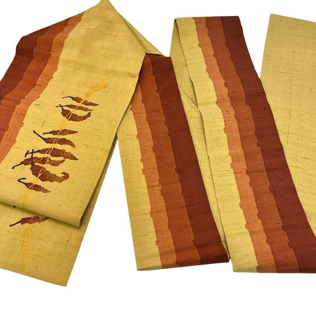 麦藁色の紬地に縦柄縞模様、唐辛子の柄裄がデザインされた雰囲気の良い素敵なお品でございます。