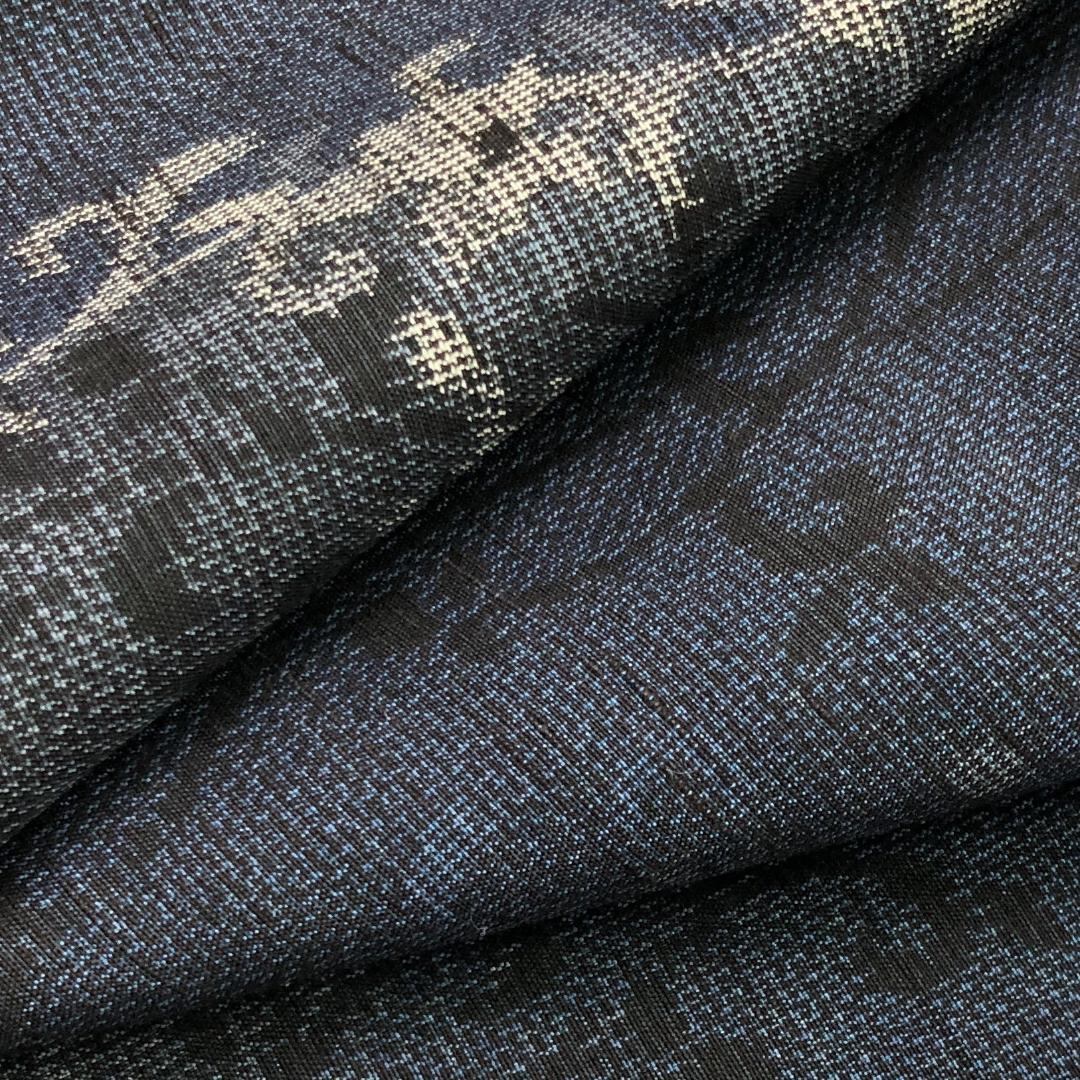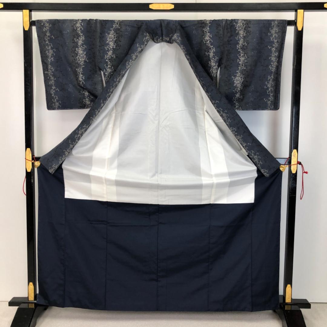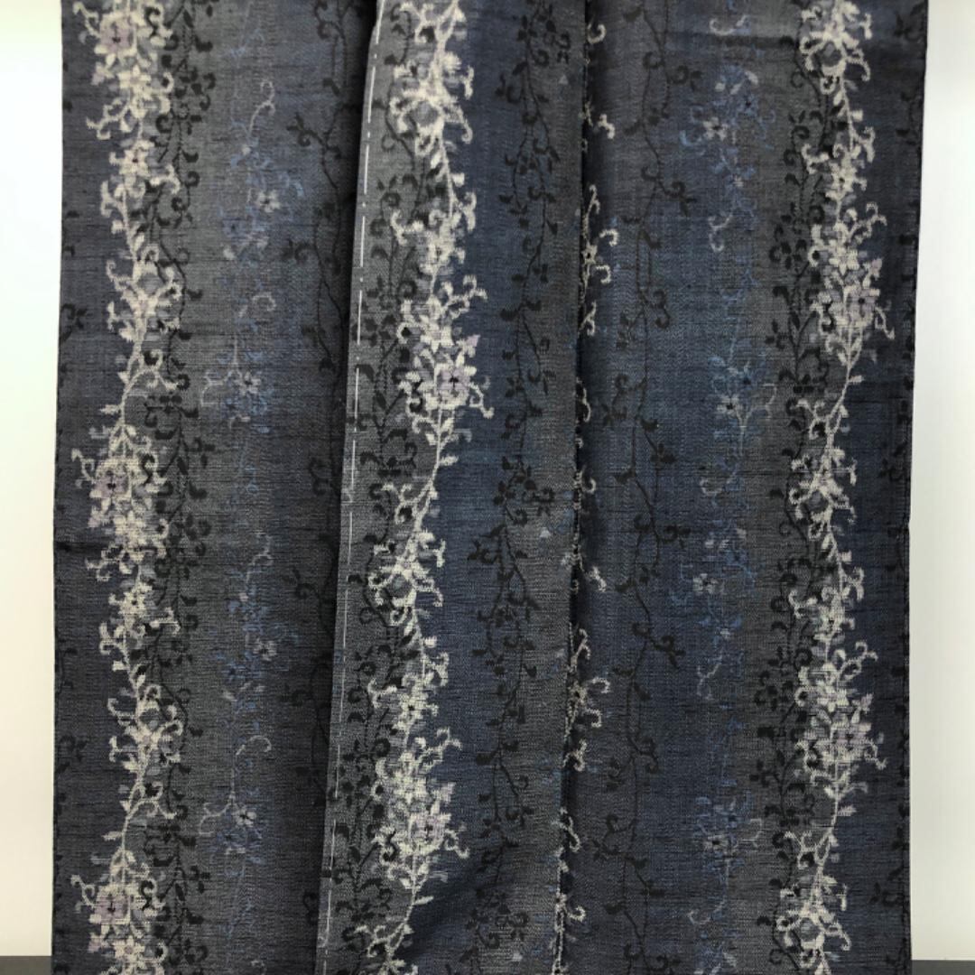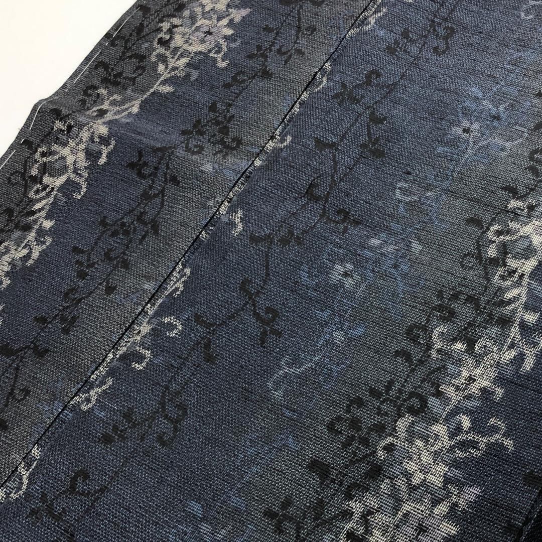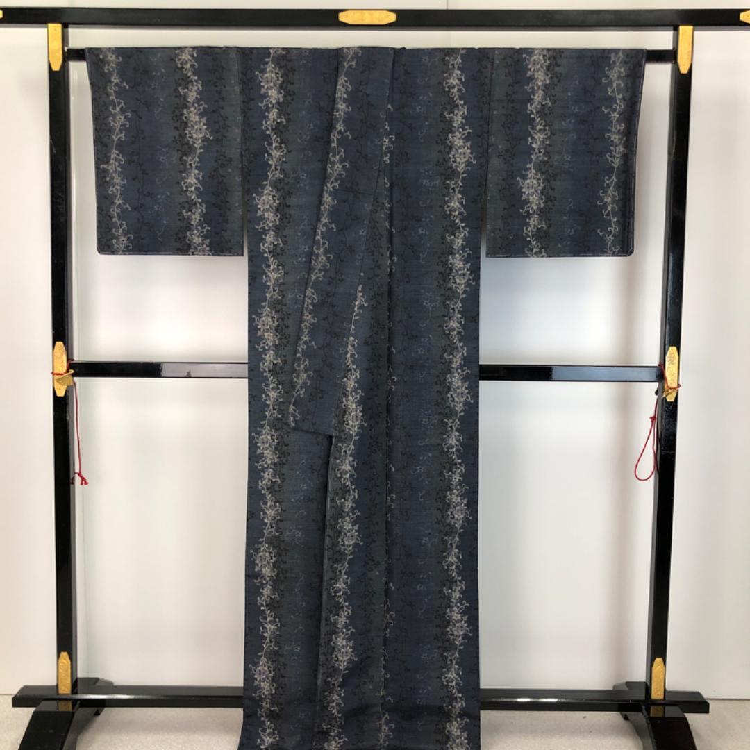 青黒色ベースのお色味、真綿が織り込まれた希少なお品、縦柄花唐草模様の柄裄がデザインされた雰囲気の良い素敵なお品でございます。