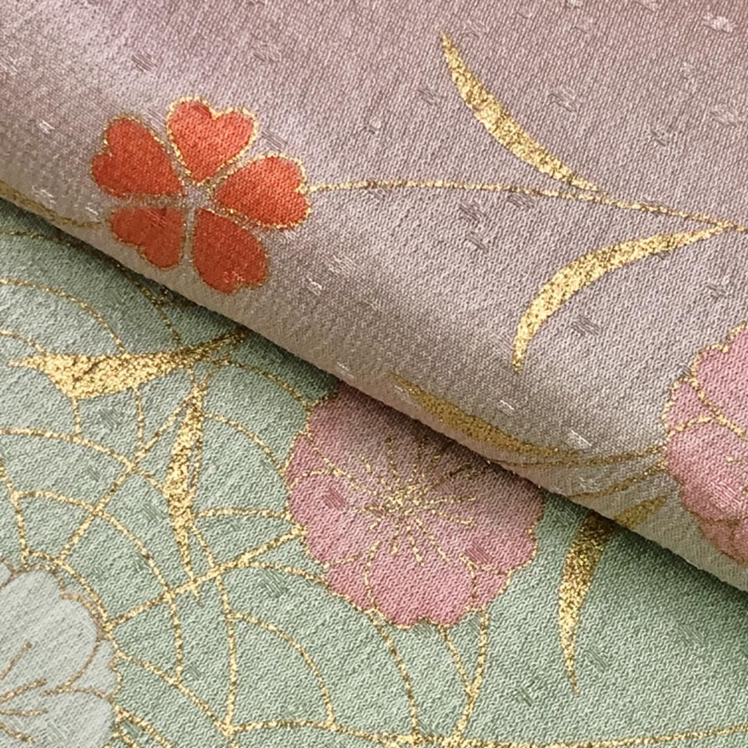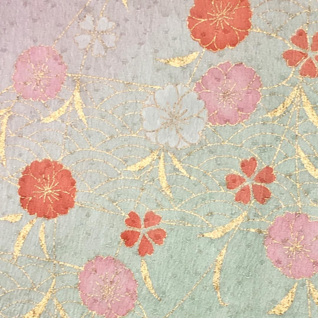 青磁色ベースのお色味に青海波、花模様の柄裄がデザインされた素敵なお品でございます。