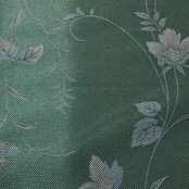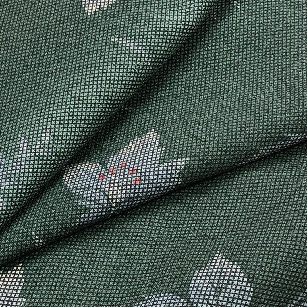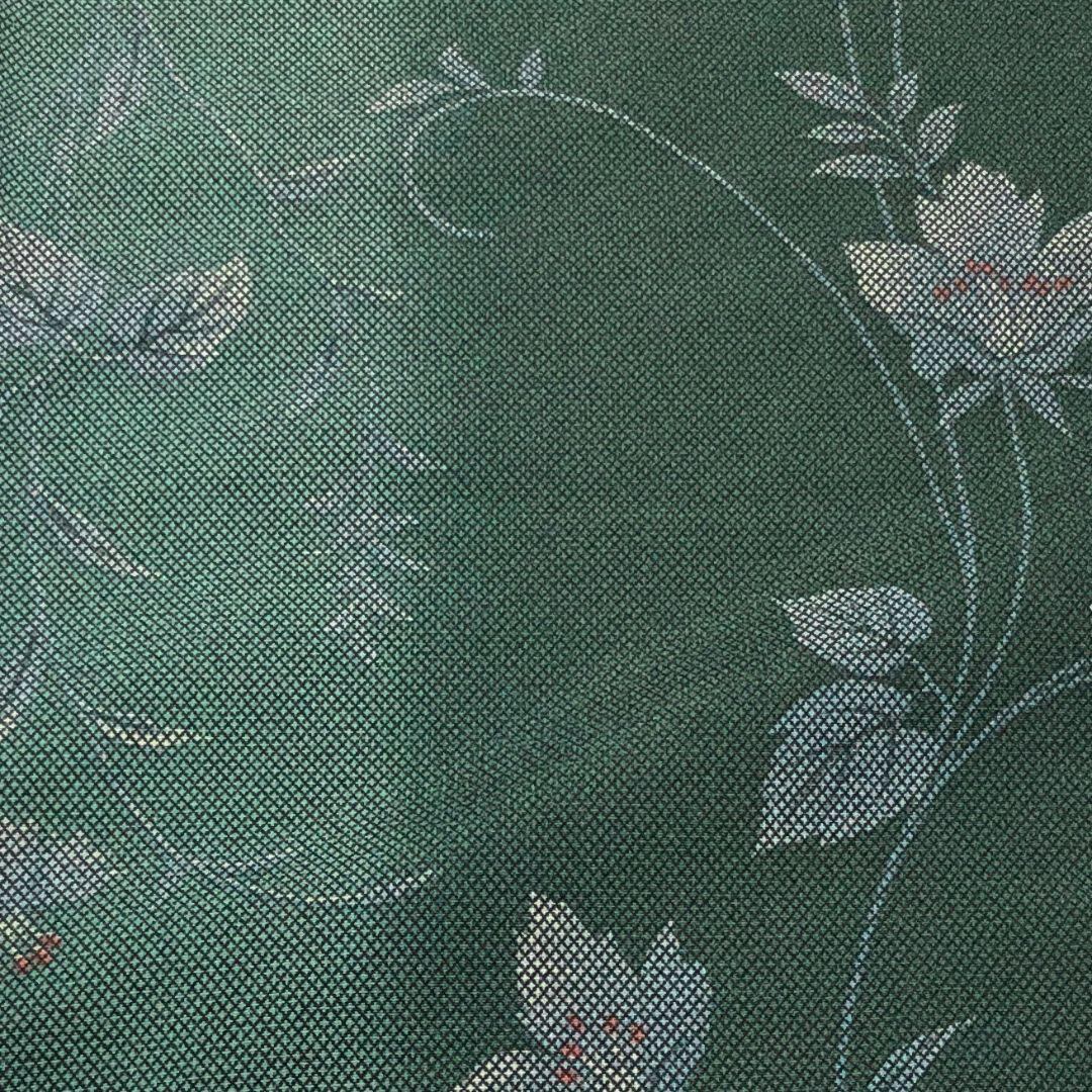 黒緑色ベースのお色味に縦縞模様、花柄の柄裄がデザインされた素敵なお品でございます。