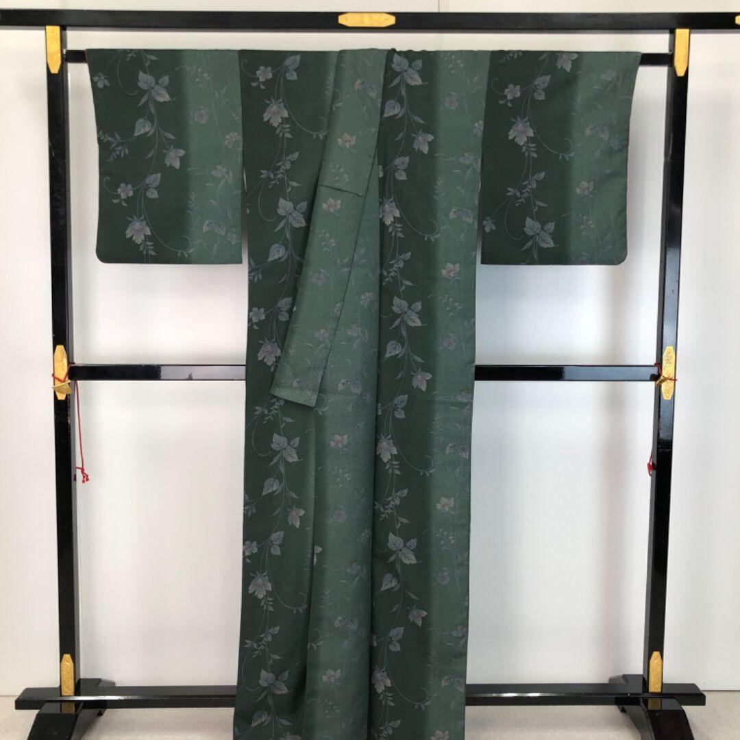 小紋 縦縞模様に花柄 黒緑色 K-5243 着物 きもの kimono 和服 和装 中古 リサイクル着物 【送料無料】