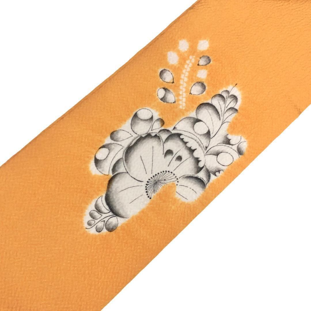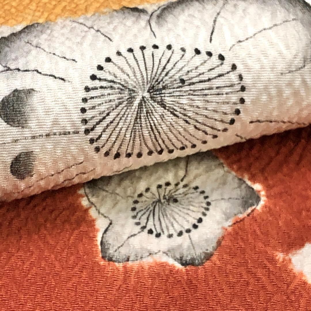 雄黄色ベースのお色味の縮緬地に雰囲気の良い西洞院辻が花がデザインされた素敵な柄裄のお品でございます。
