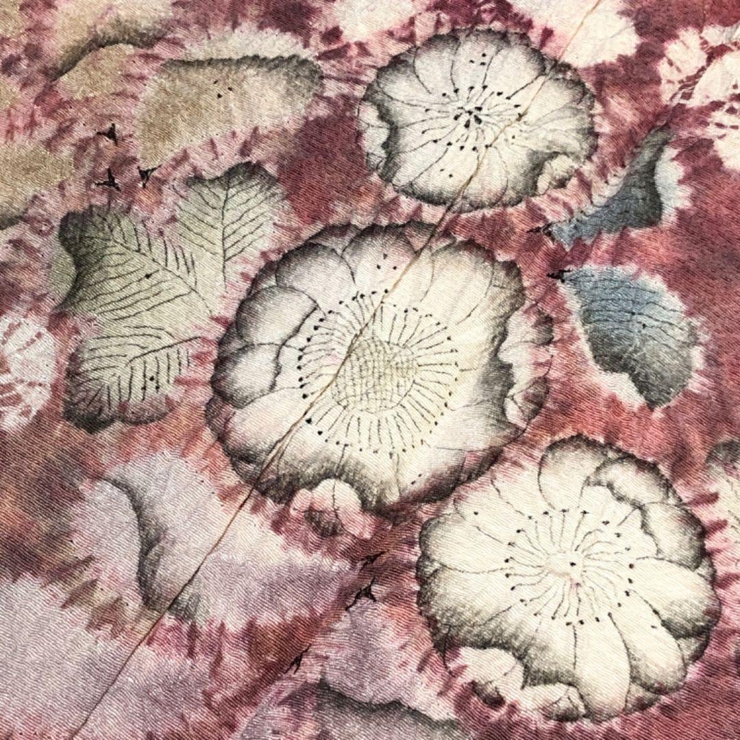 桃色のお色味に縮緬に美しい辻が花絞りがデザインされた素敵な柄裄のお品でございます。