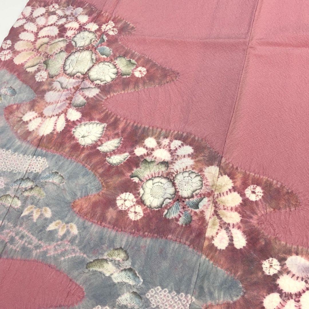 訪問着 十日町 滝泰 辻が花絞り 松 縮緬 桃色 しつけ糸 K-5259 着物 きもの kimono 和服 和装 中古 リサイクル着物 【送料無料】