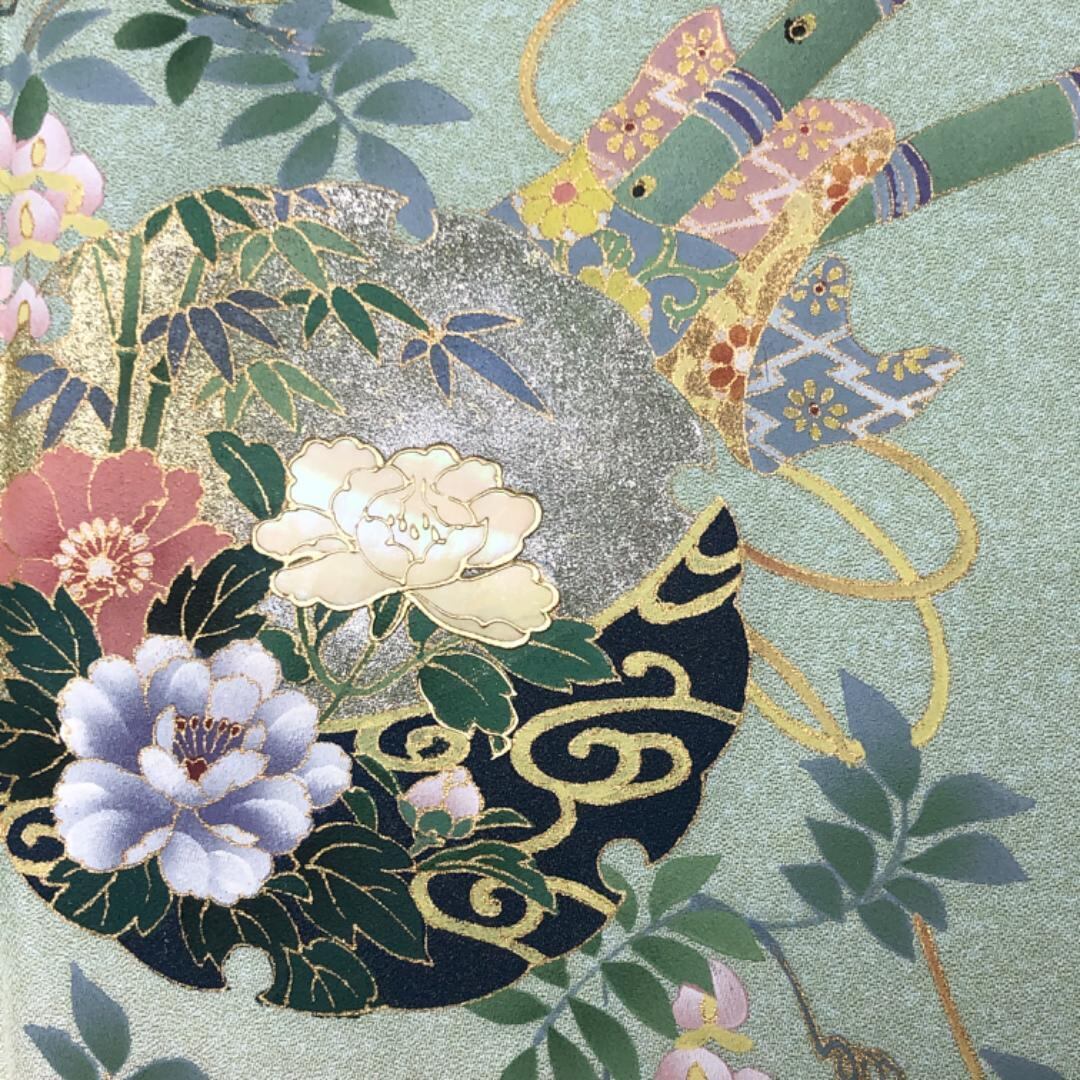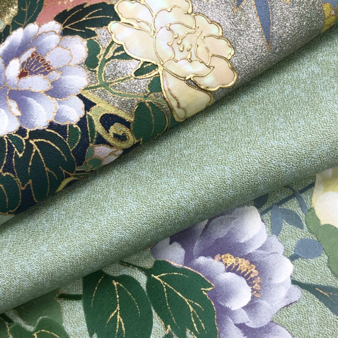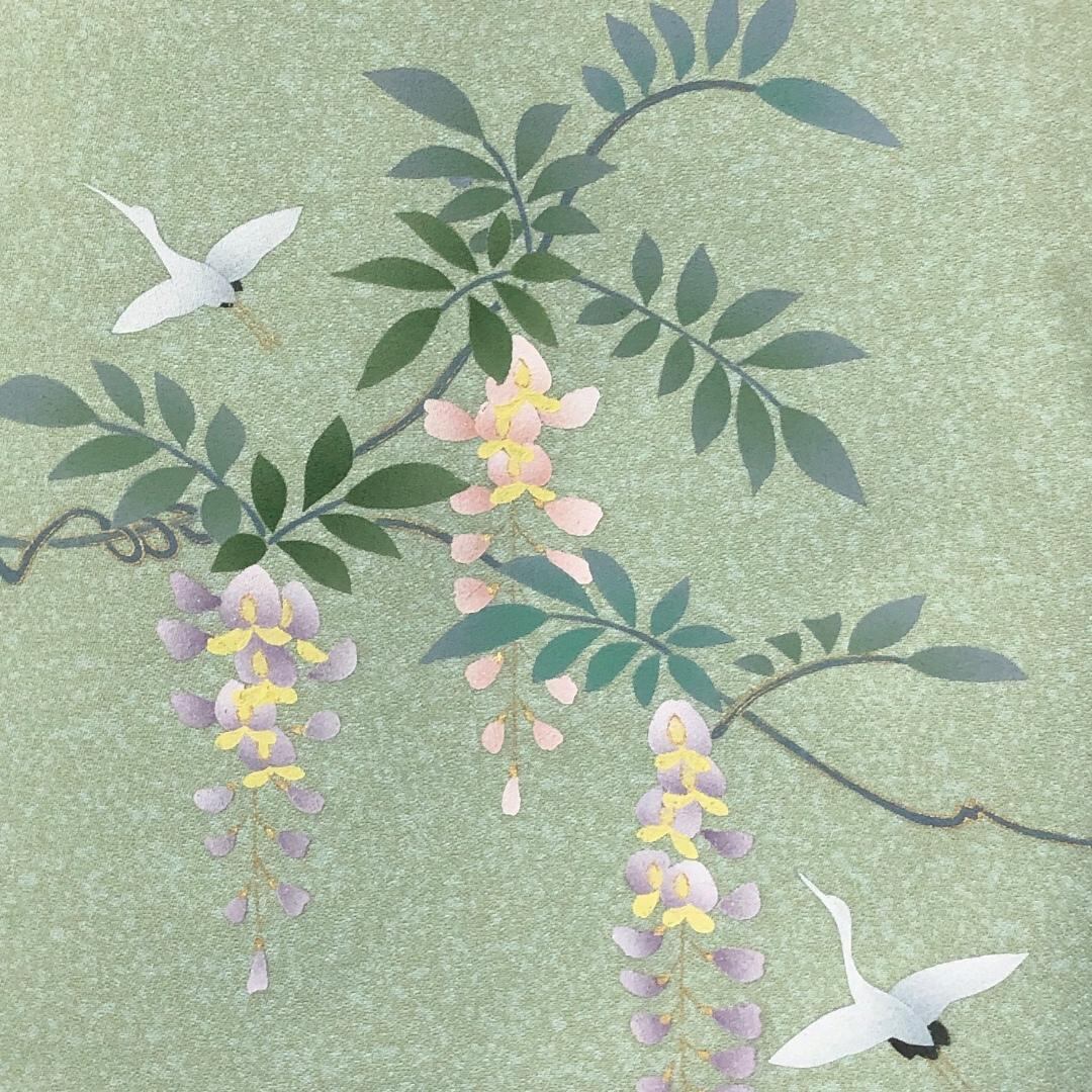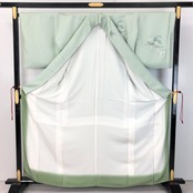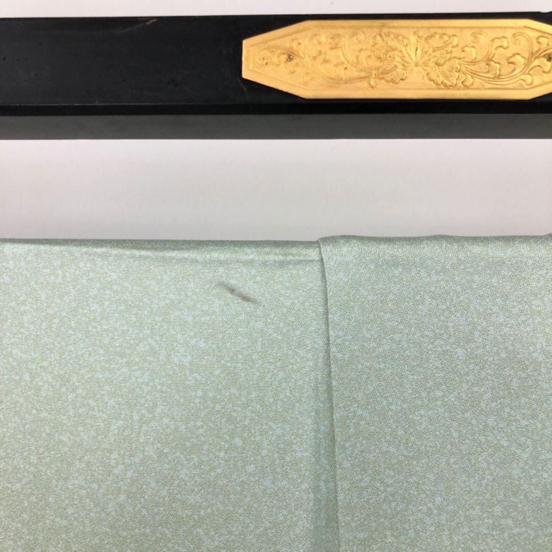 薄緑色のお色味に螺鈿の上品な花模様がデザインされた素敵な柄裄のお品でございます。