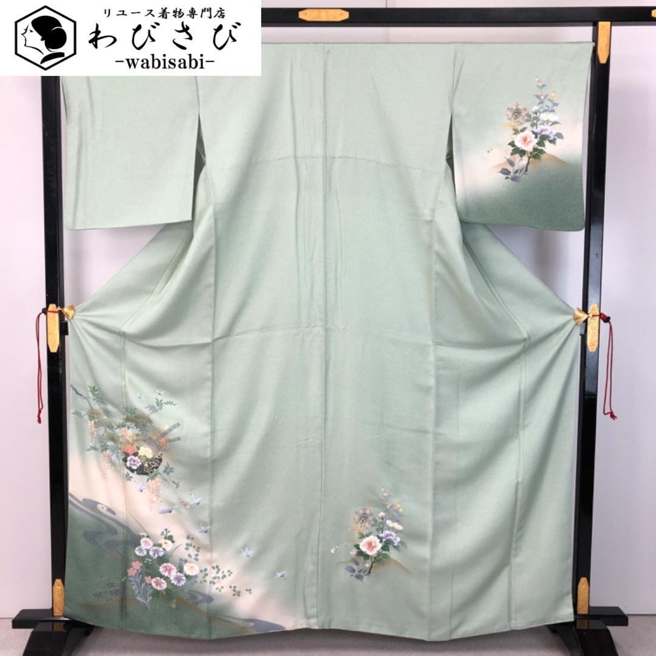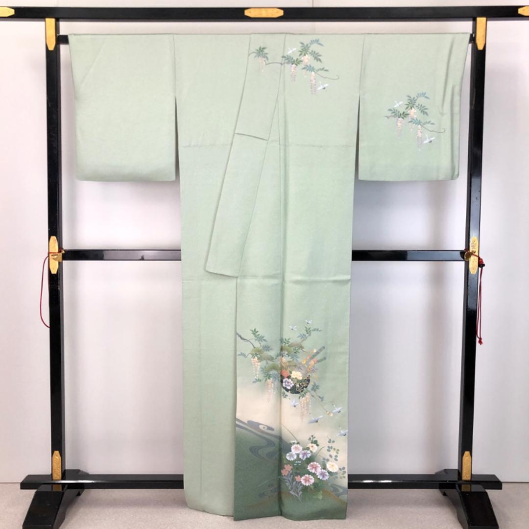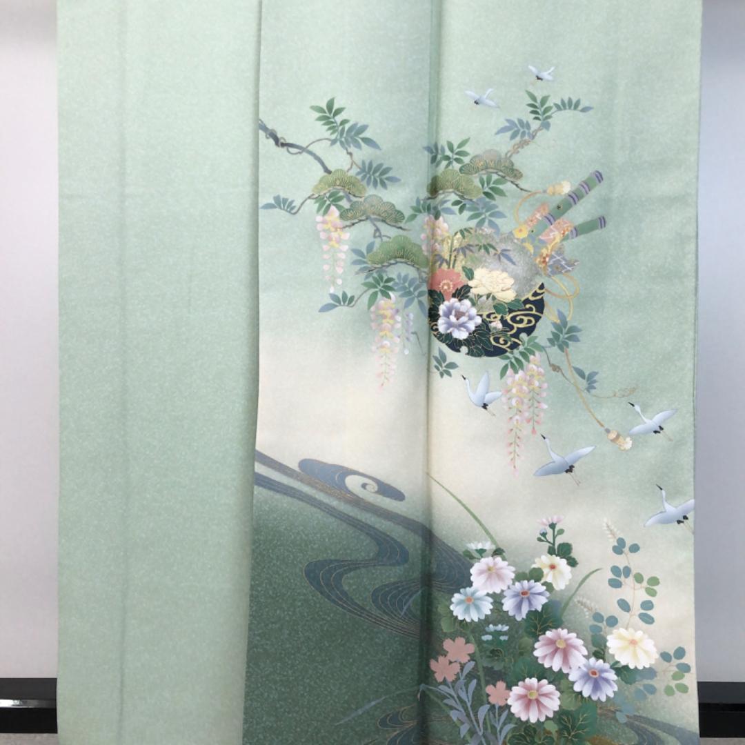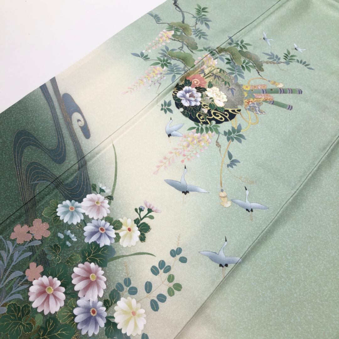 薄緑色のお色味に螺鈿の上品な花模様がデザインされた素敵な柄裄のお品でございます。