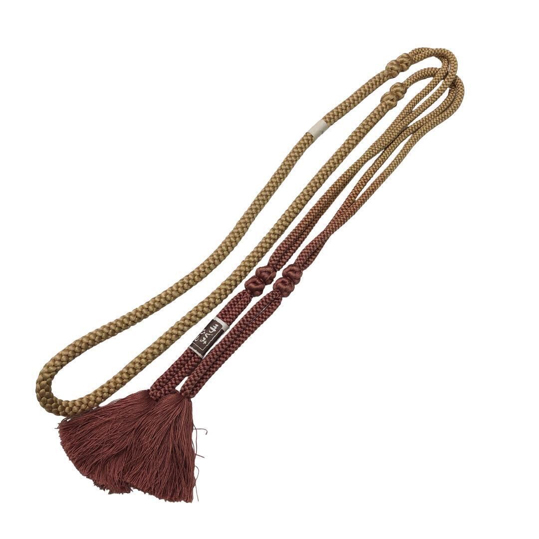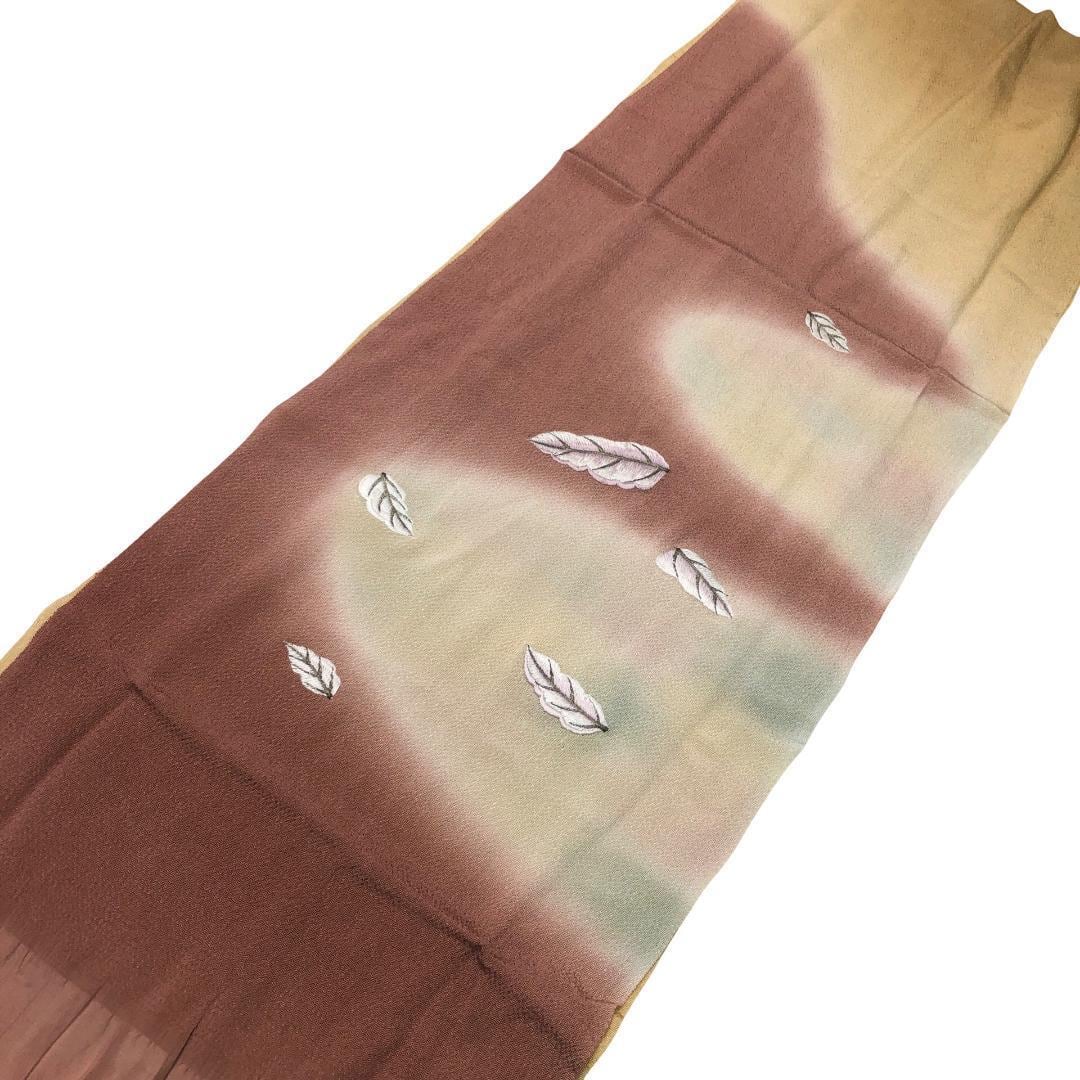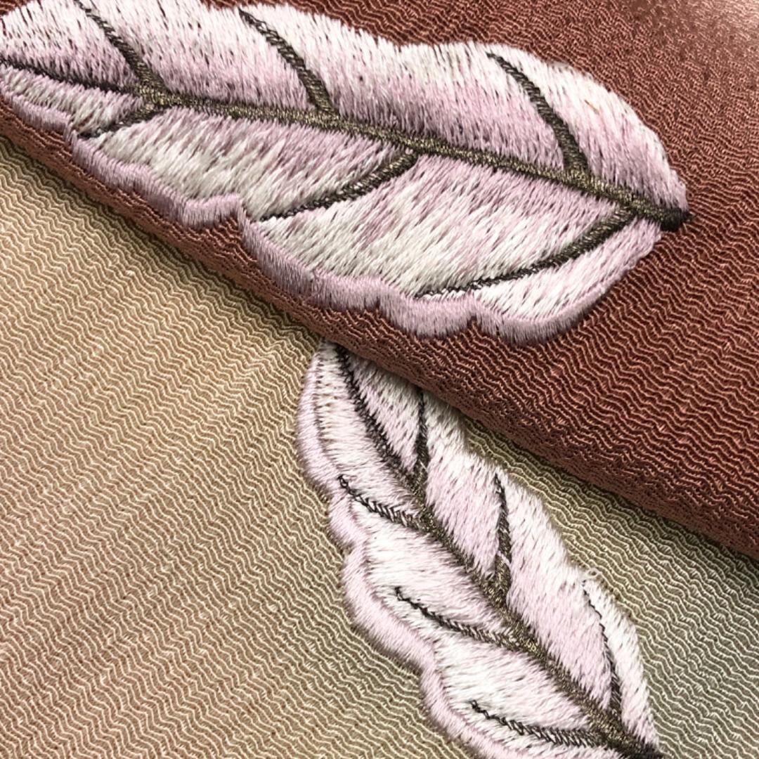 麦藁色ベースのお色味に刺繍で葉模様がデザインされた帯揚げ、丸組紐の素敵なお品でございます。
