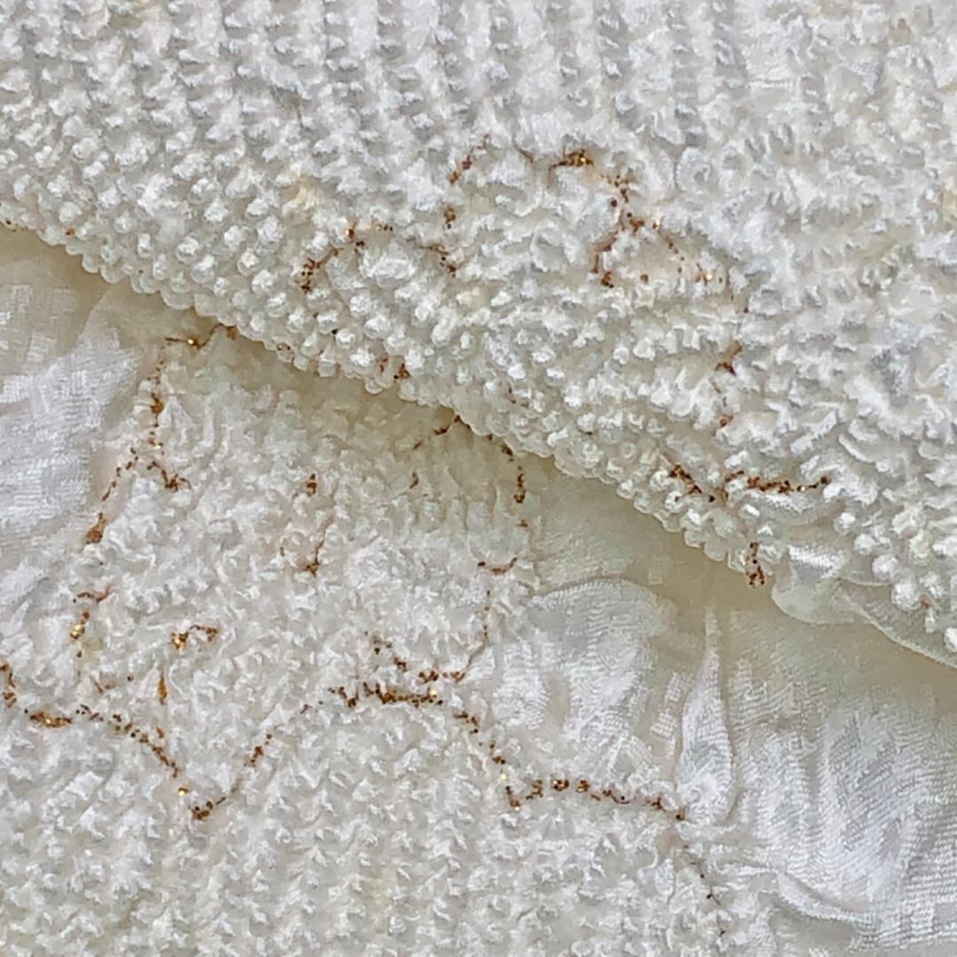 乳白色のお色味に絞りで花模様がデザインされた帯揚げ、笹浪組の素敵なお品でございます。