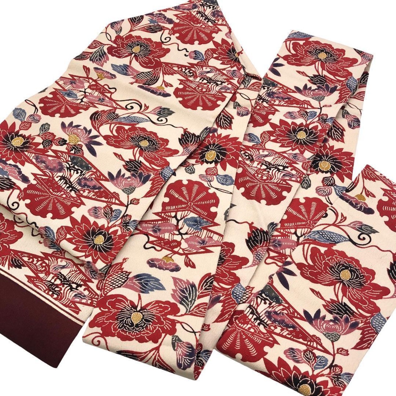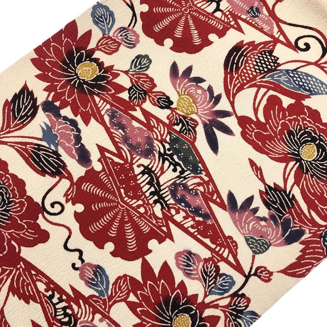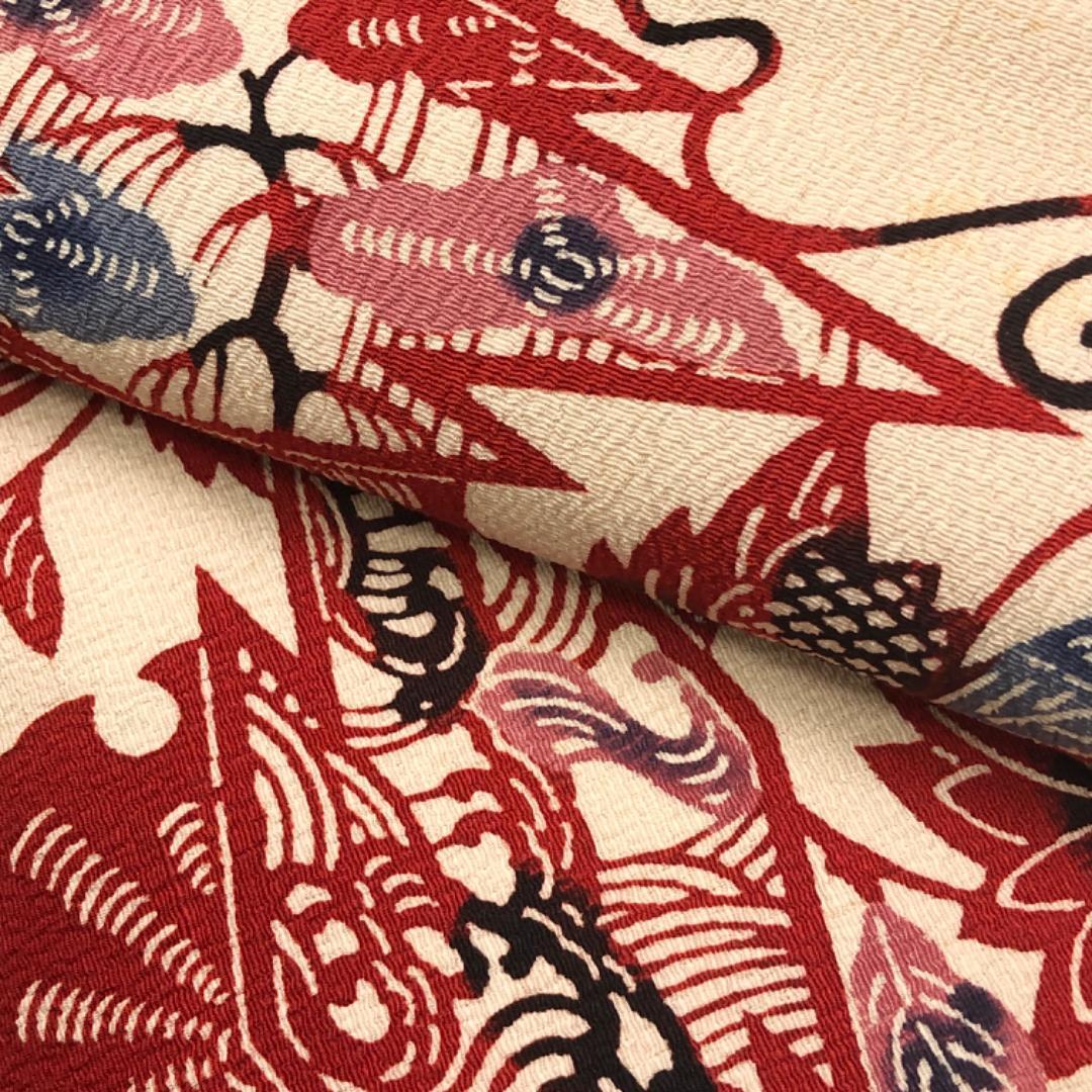生成色ベースのお色味の縮緬地に雰囲気の良い色彩の松皮菱、花模様などの柄行の型染がデザインされた素敵なお品でございます。