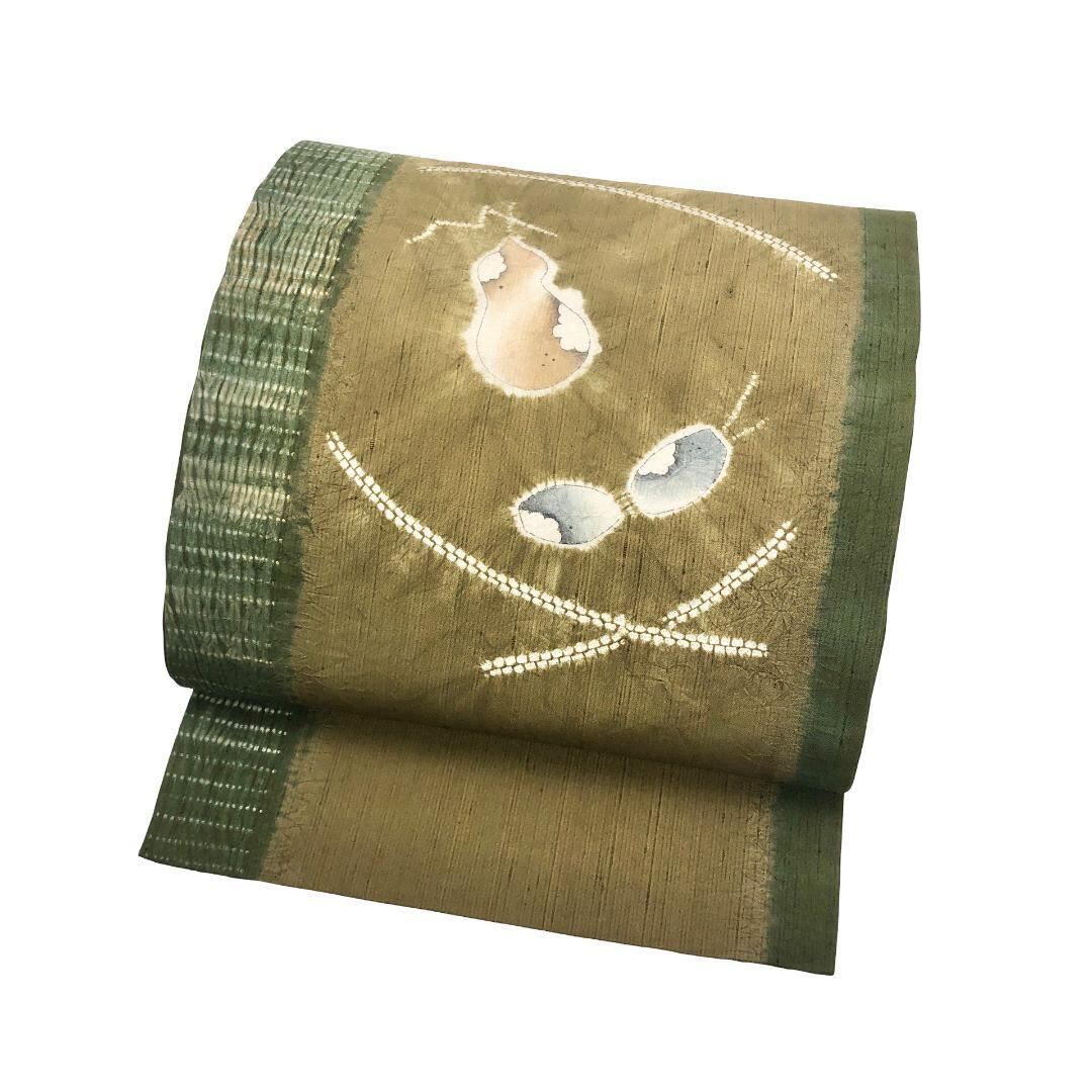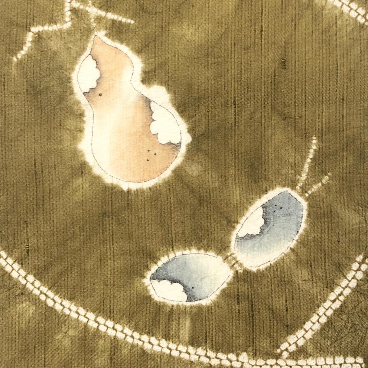 国防色の落ち着きのあるお色味に絞り柄の野菜がデザインされた雰囲気の良い素敵な柄裄のお品でございます。