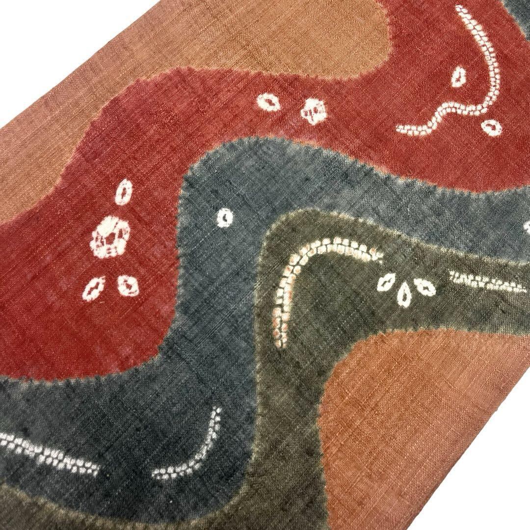 袋帯 紬 絞り柄 染分け 流水に花模様 照柿色 O-4117 着物 きもの kimono 和服 和装 中古 リサイクル着物 【送料無料】