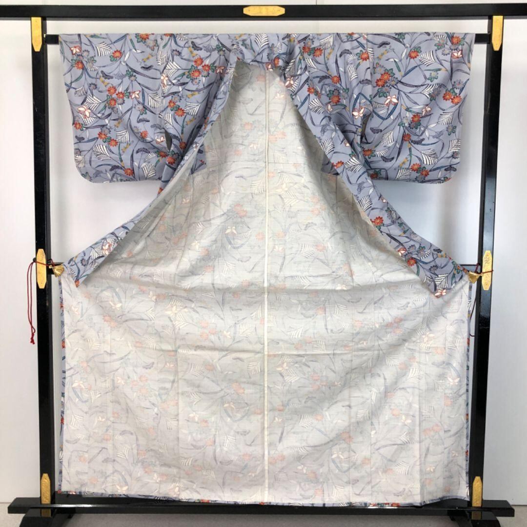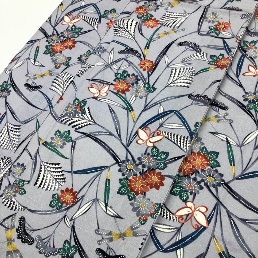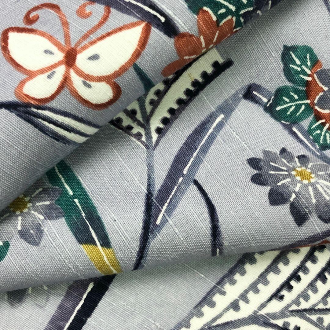 青袋鼠色のお色味に可愛らしい蝶々、蜻蛉などの柄裄がデザインされた素敵なお品でございます。