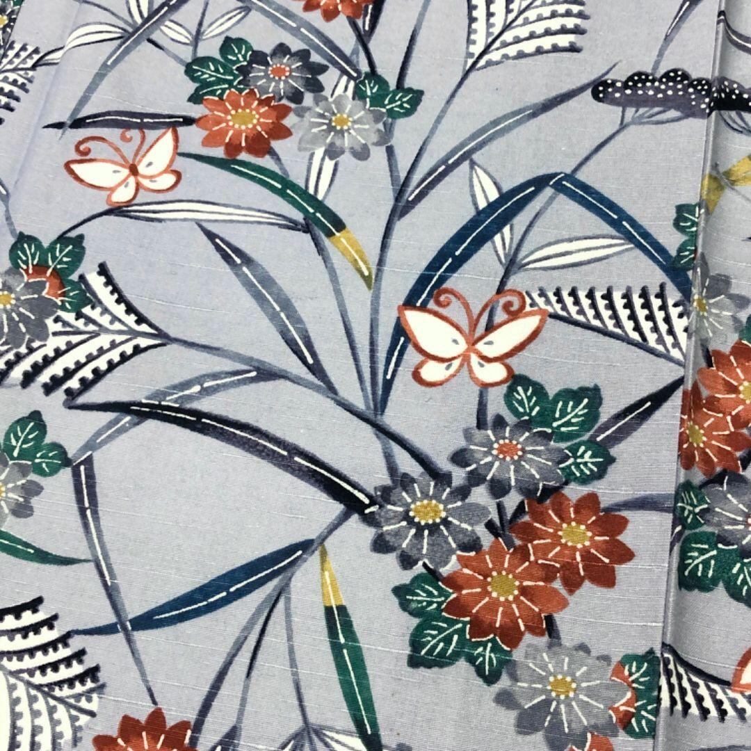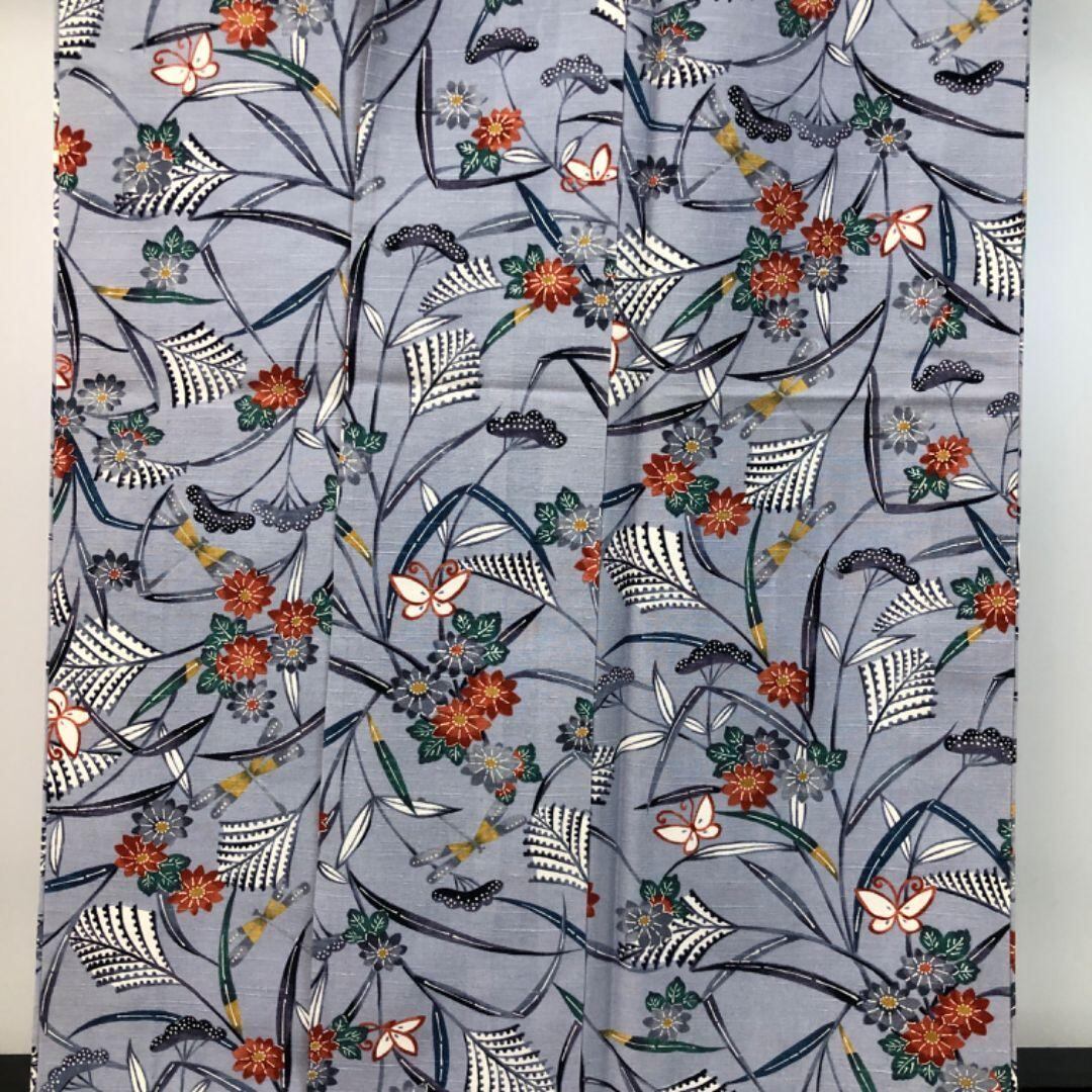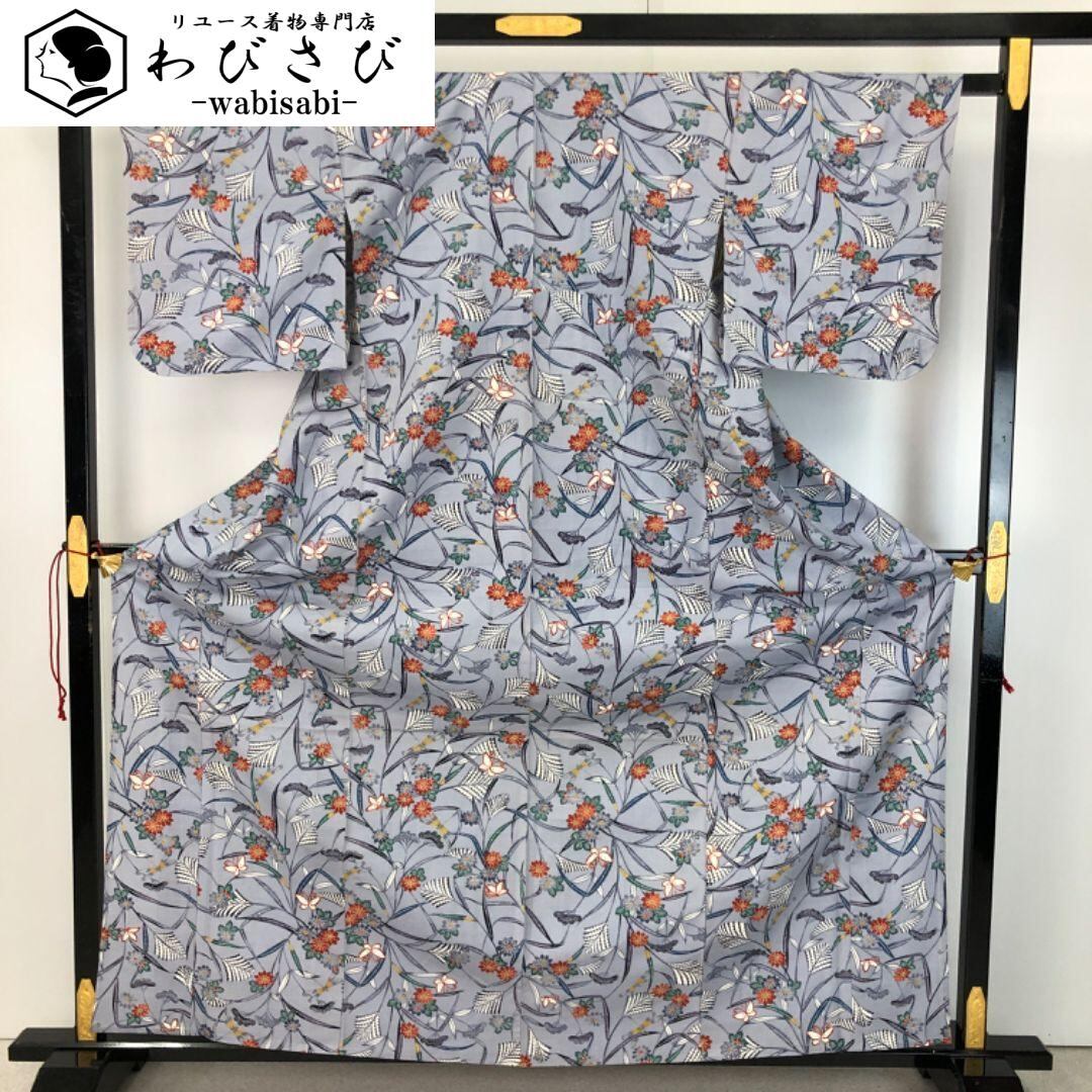 青袋鼠色のお色味に可愛らしい蝶々、蜻蛉などの柄裄がデザインされた素敵なお品でございます。
