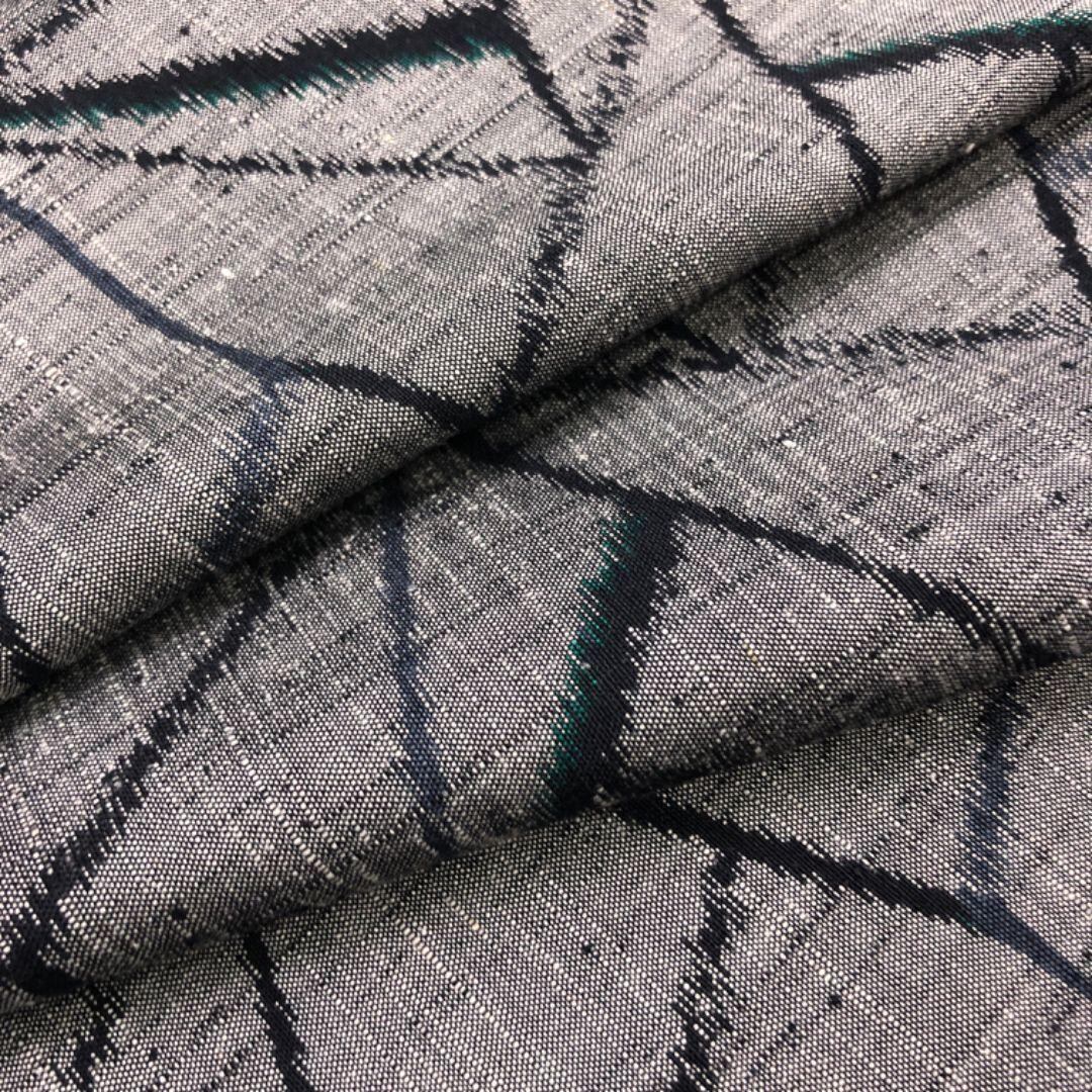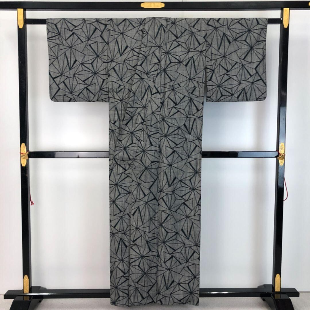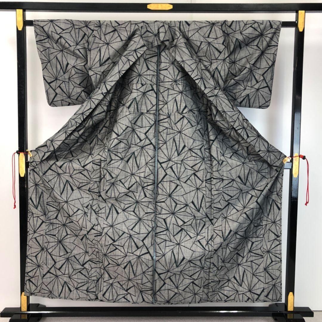 濃灰色のお色味に幾何学模様がデザインされた素敵な柄裄のお品でございます。