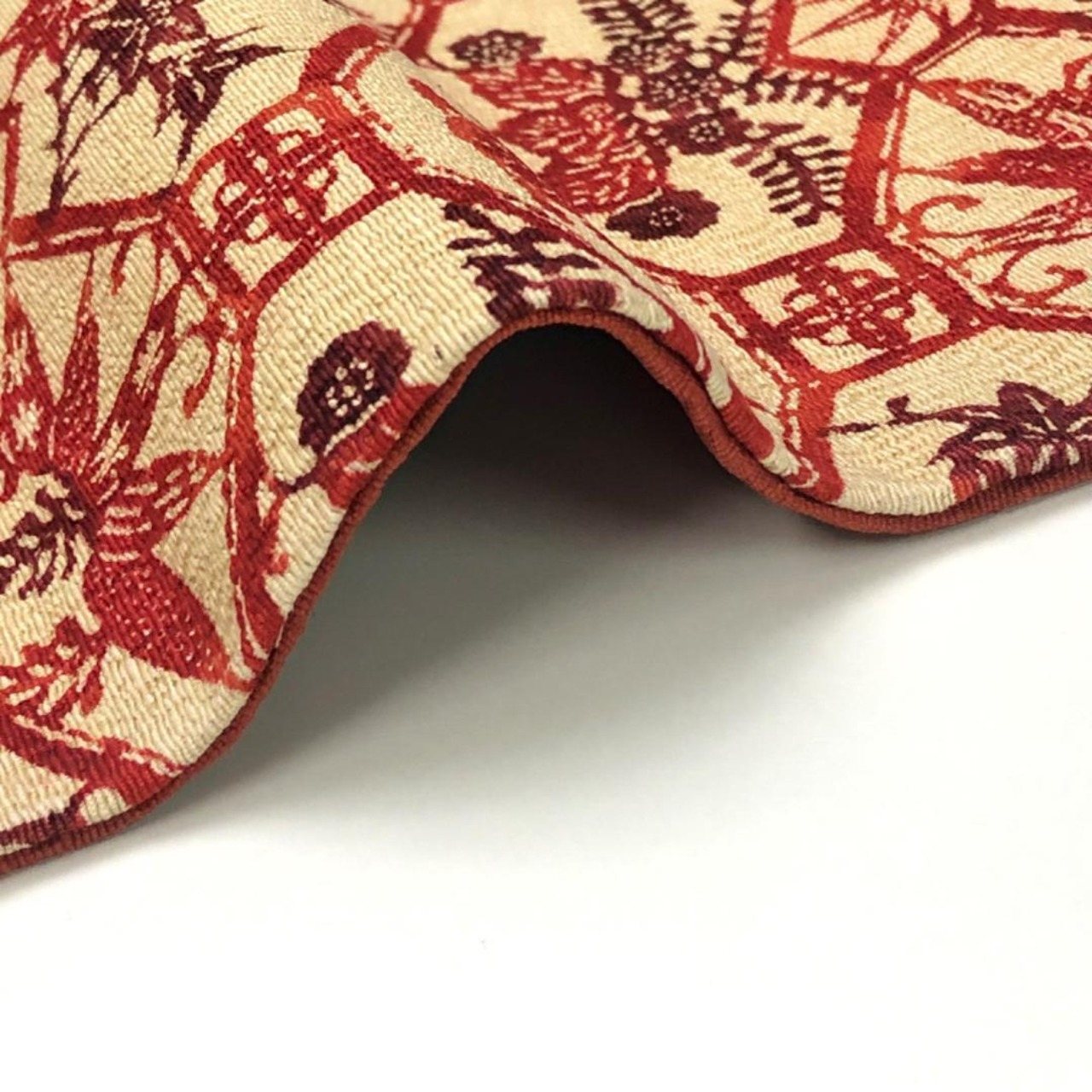 薄卵色のお色味に型染で蜀江文様に花草模様がデザインされた素敵な柄裄のお品でございます。