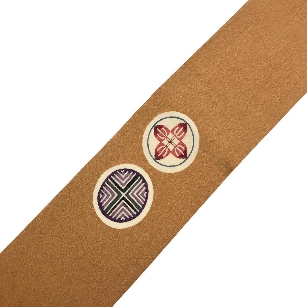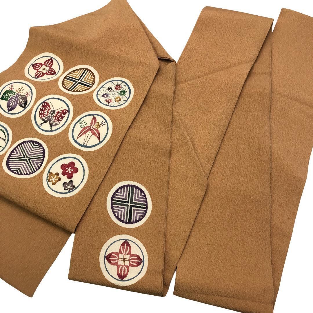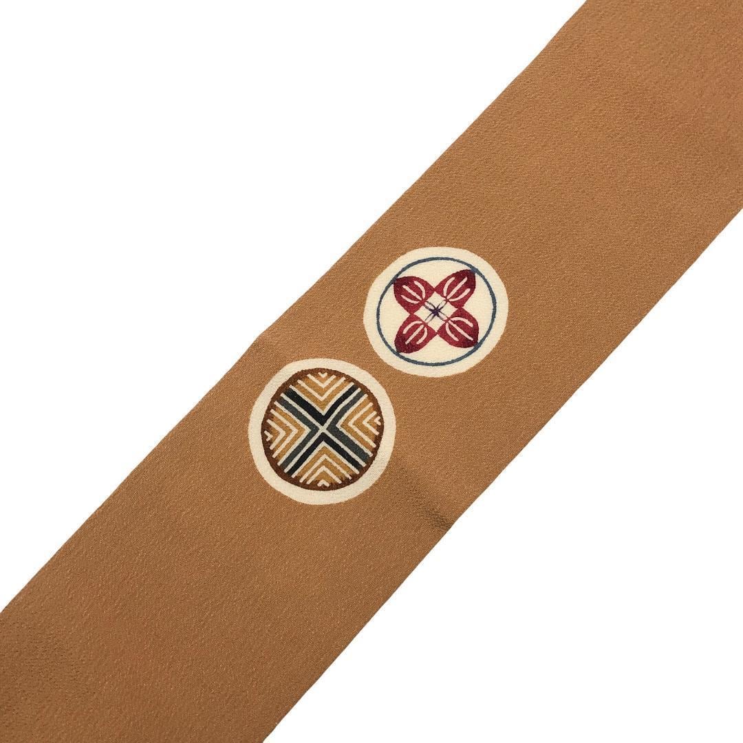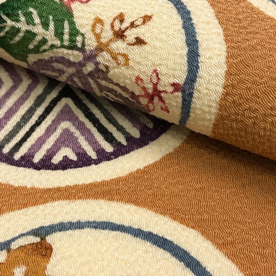 梅茶色の乙付きのあるお色味の縮緬地に上品な色彩の丸に花模様の雰囲気の良い柄裄がデザインされた素敵なお品でございます。