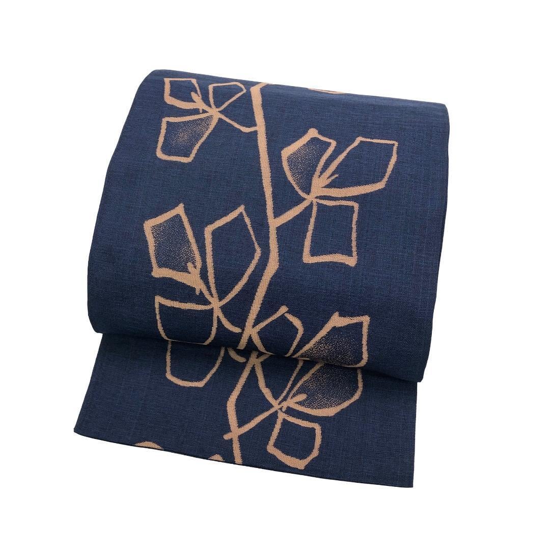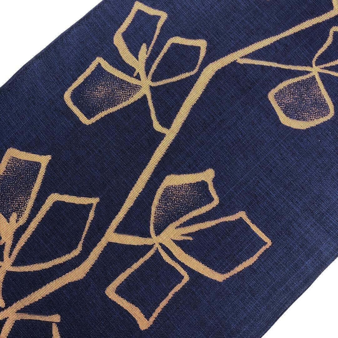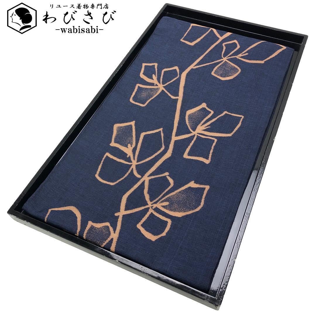 濃藍色のお色味の紬地に抽象葉模様がデザインされた雰囲気の良い素敵なお品でございます。