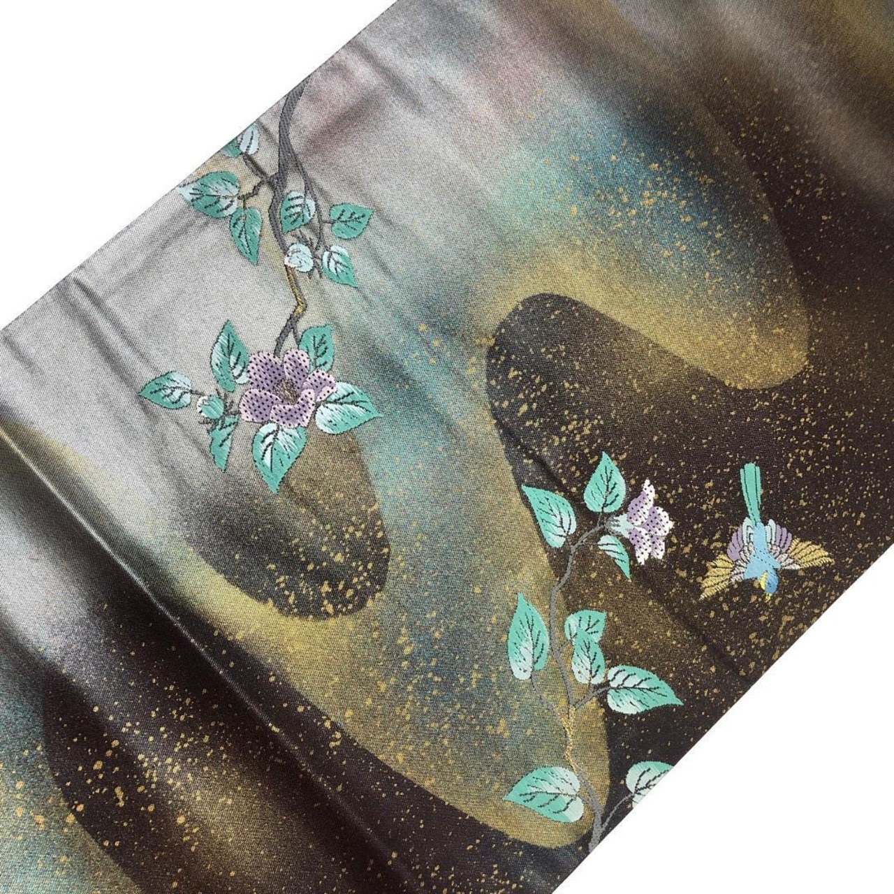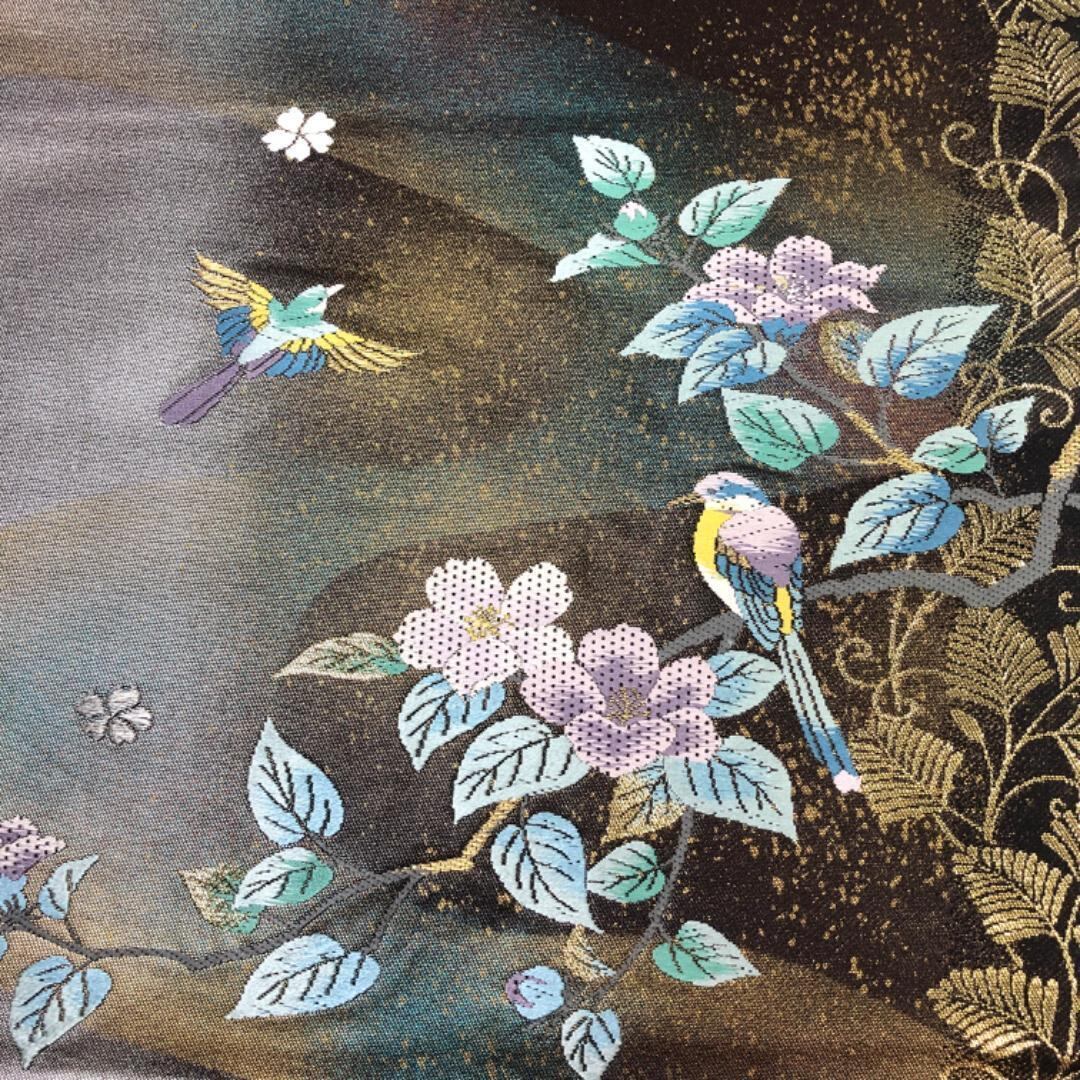 憲房色ベースのお色味に花葉模様に鳥の雰囲気の良い柄行がデザインされた素敵なお品でございます。