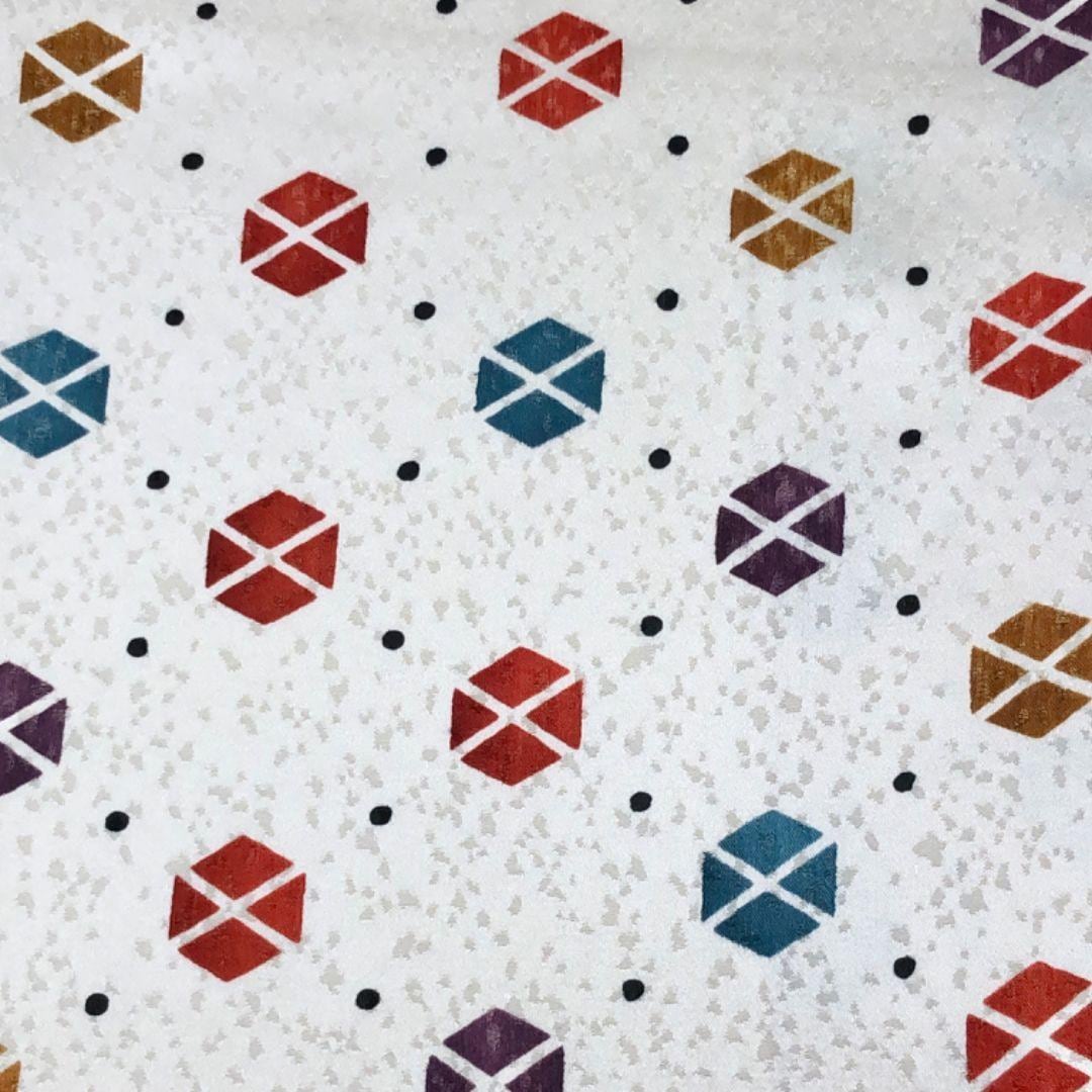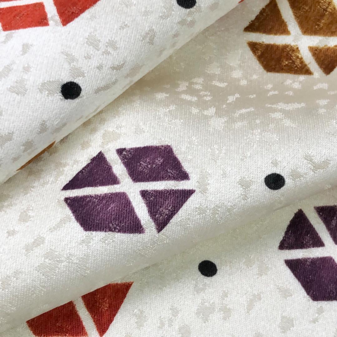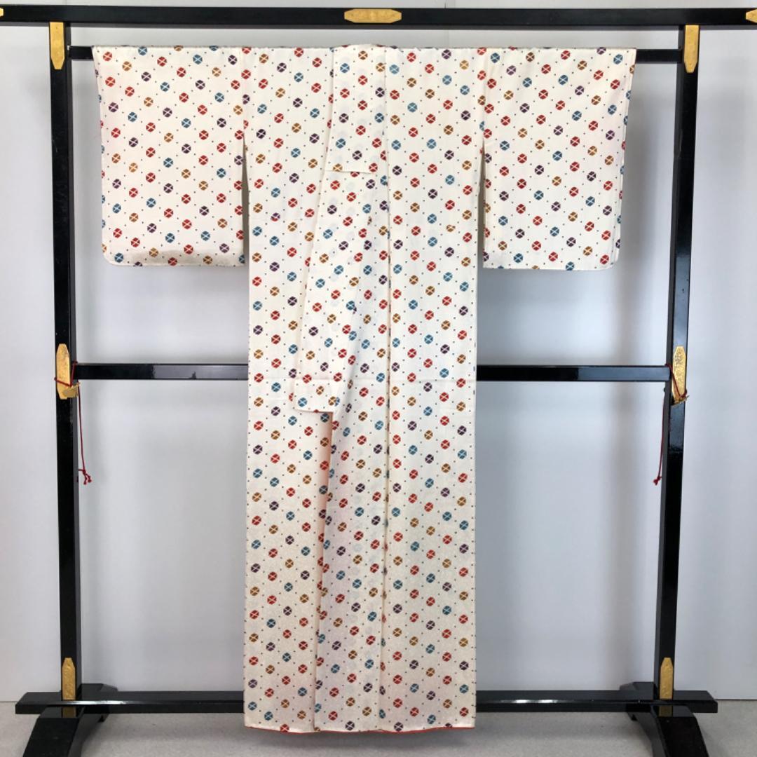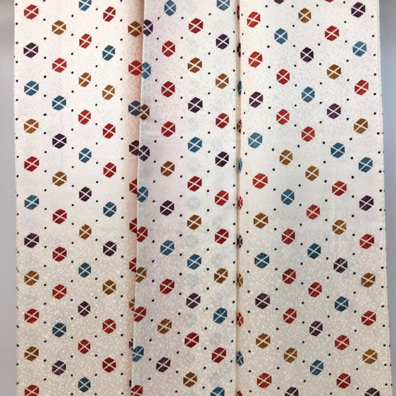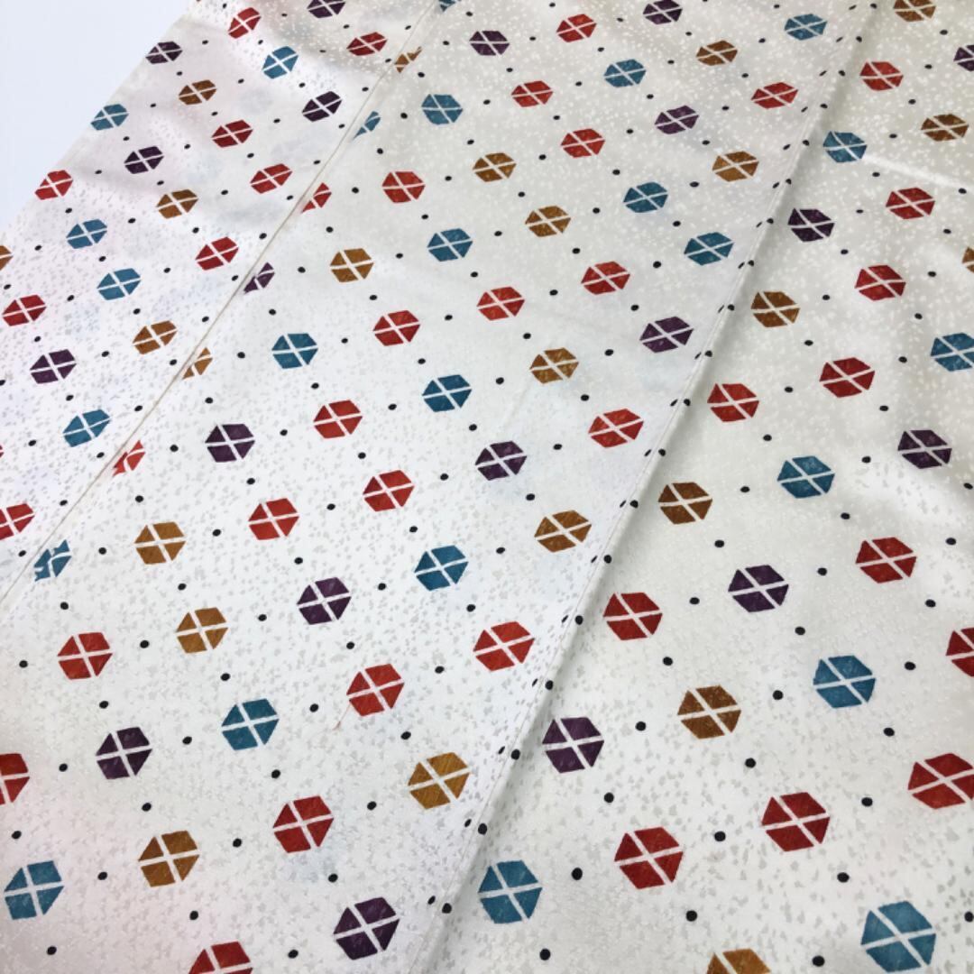 乳白色のお色味に六角形、可愛らしい水玉模様の柄裄がデザインされた素敵なお品でございます。