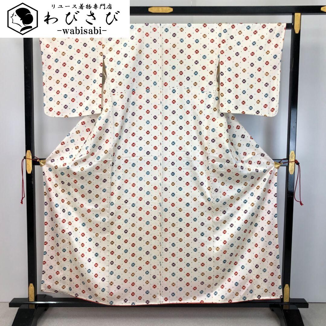 小紋 六角形に可愛らしい水玉模様 乳白色 しつけ糸 K-5272 着物 きもの kimono 和服 和装 中古 リサイクル着物 【送料無料】